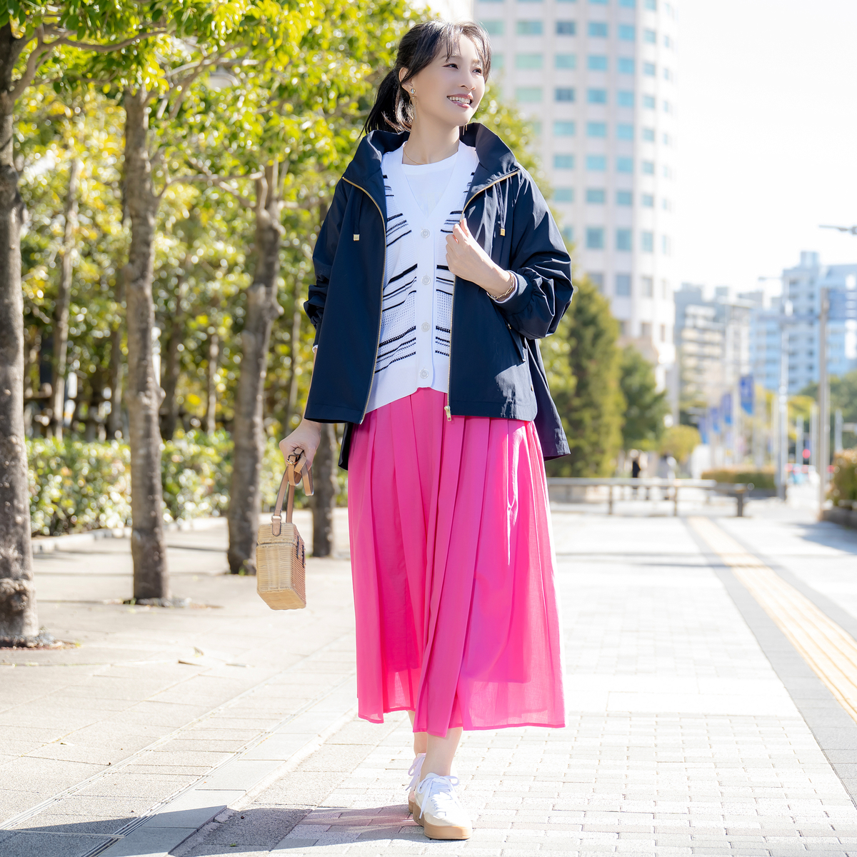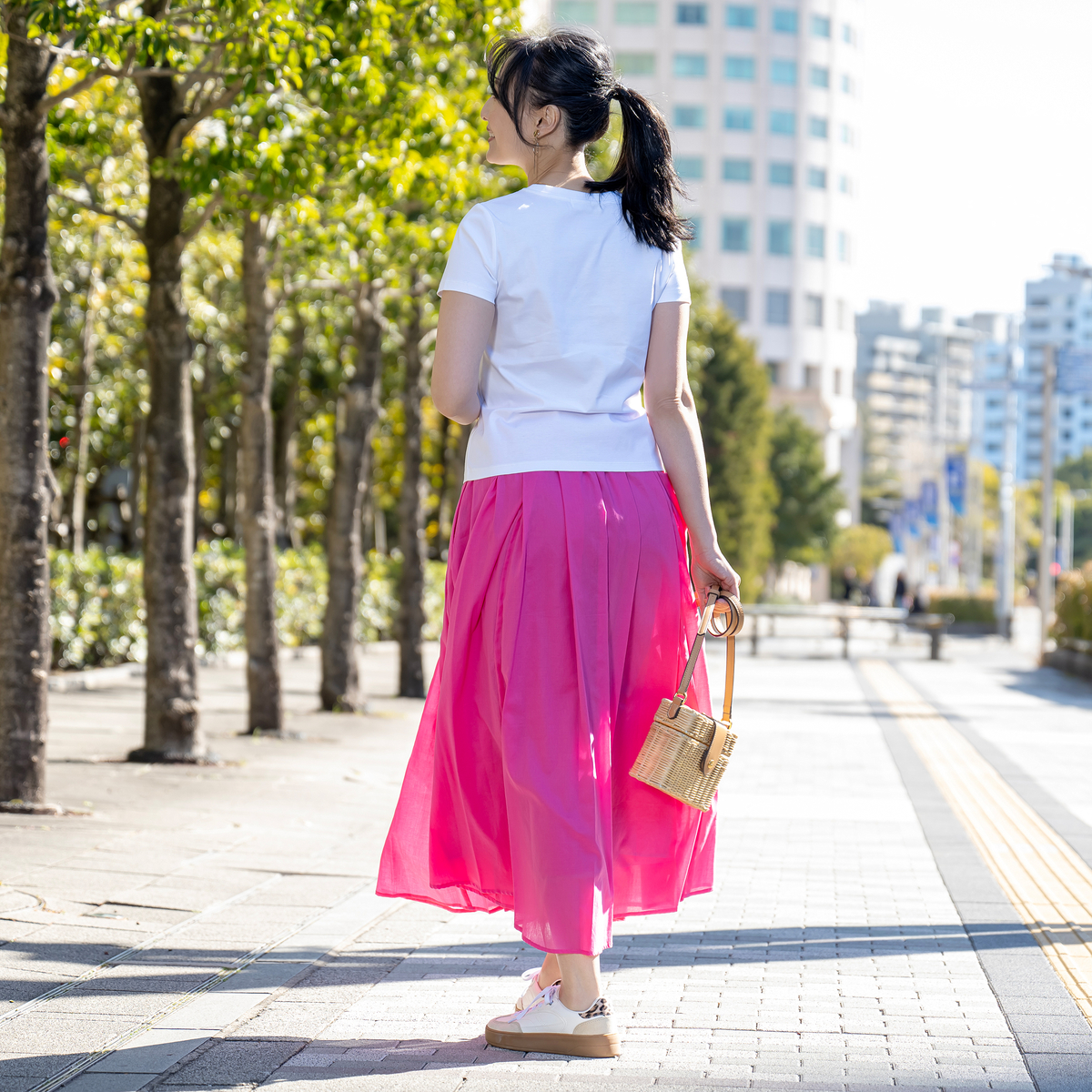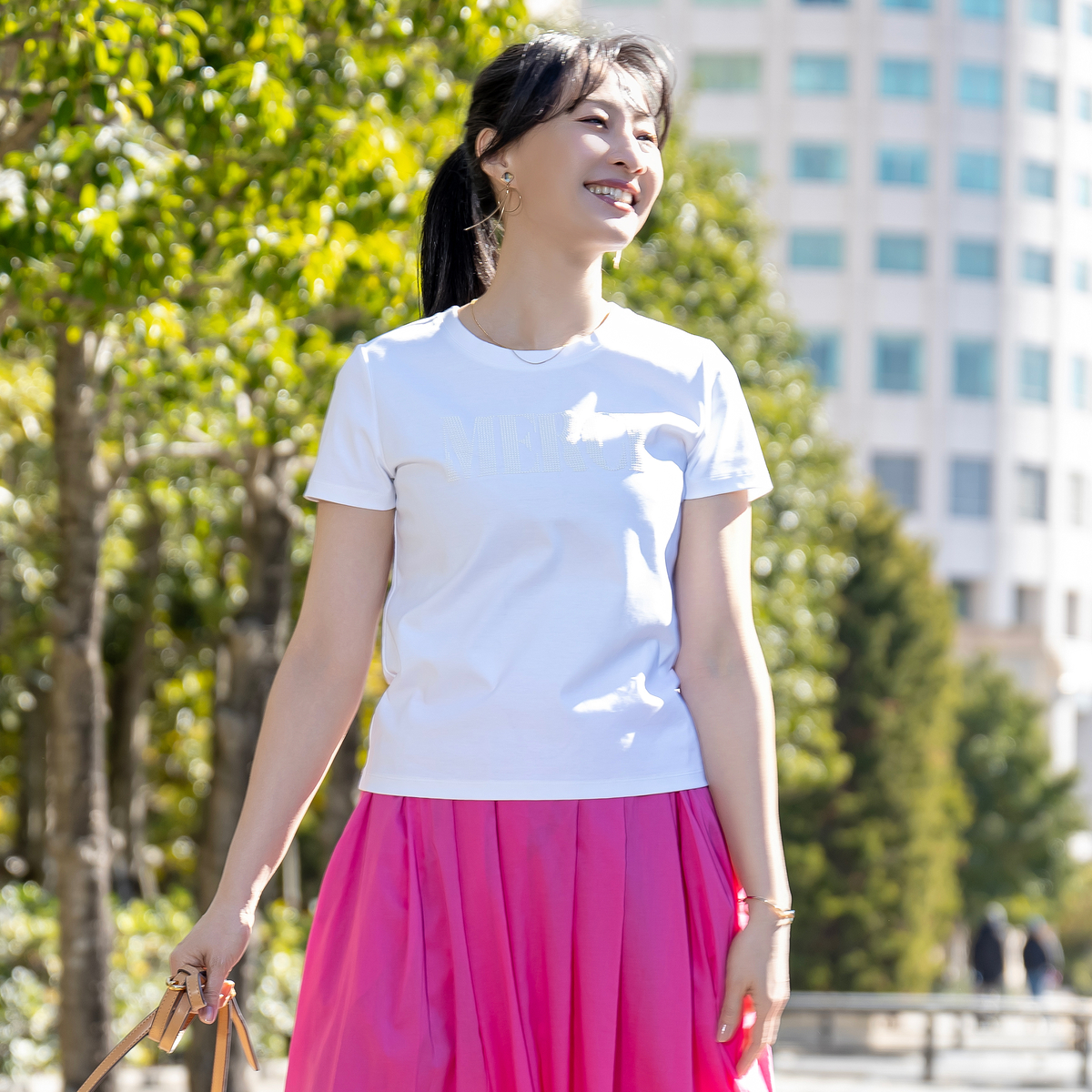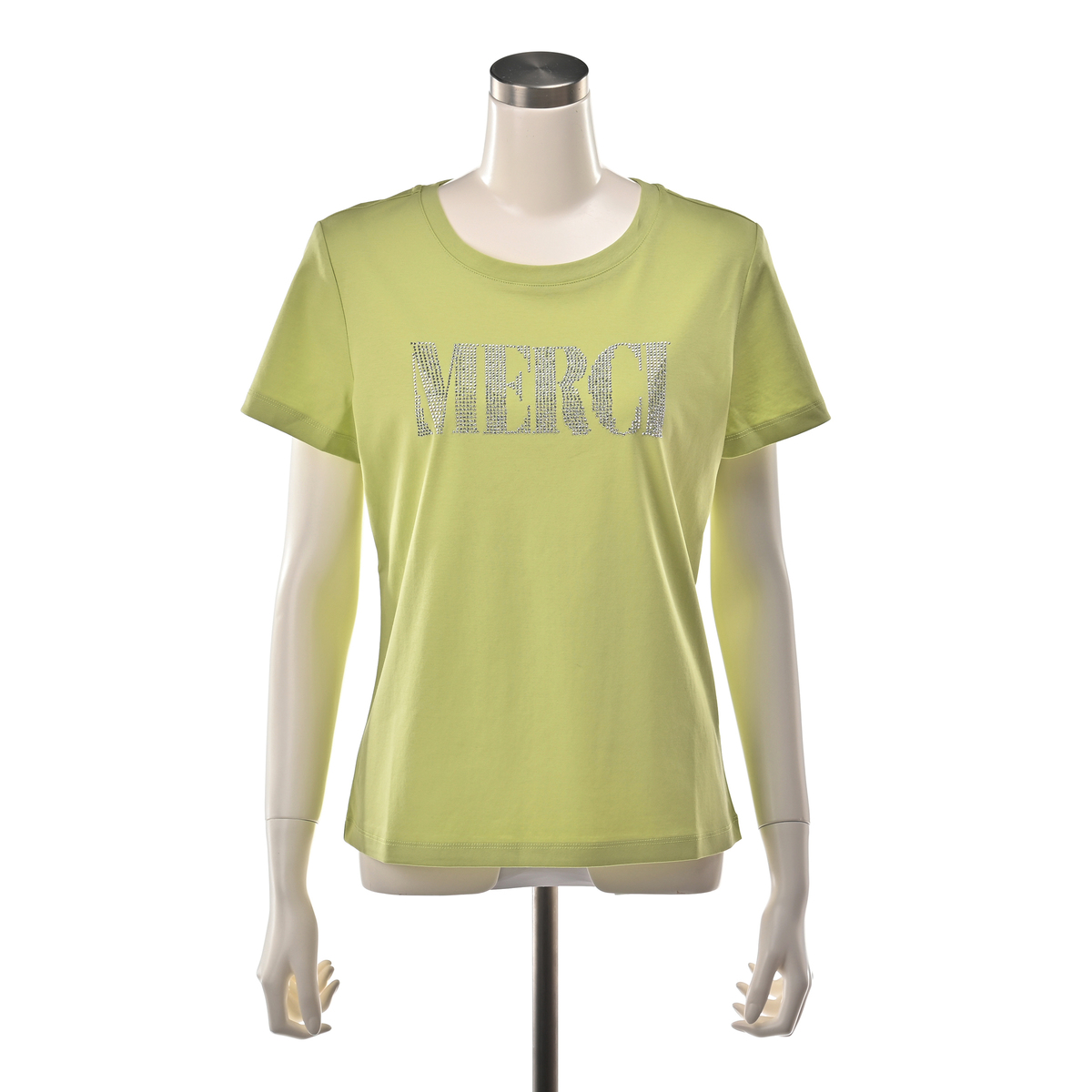 胸元の「MERCI」をビジューであしらい、遊び心を添えたTシャツ。ビジューがアクセサリーのように輝き、ネックレスいらずで装いが華やぎます。ジャケットの中にすっきり収まる形が欲しいという声から生まれた、大人のためのコンパクトシルエットです