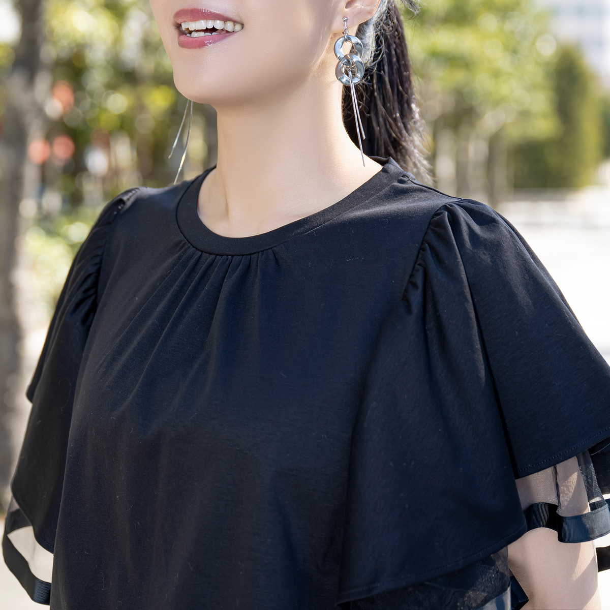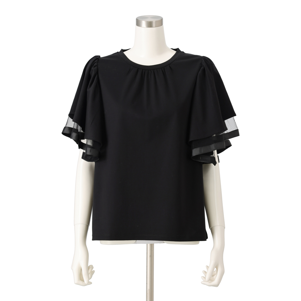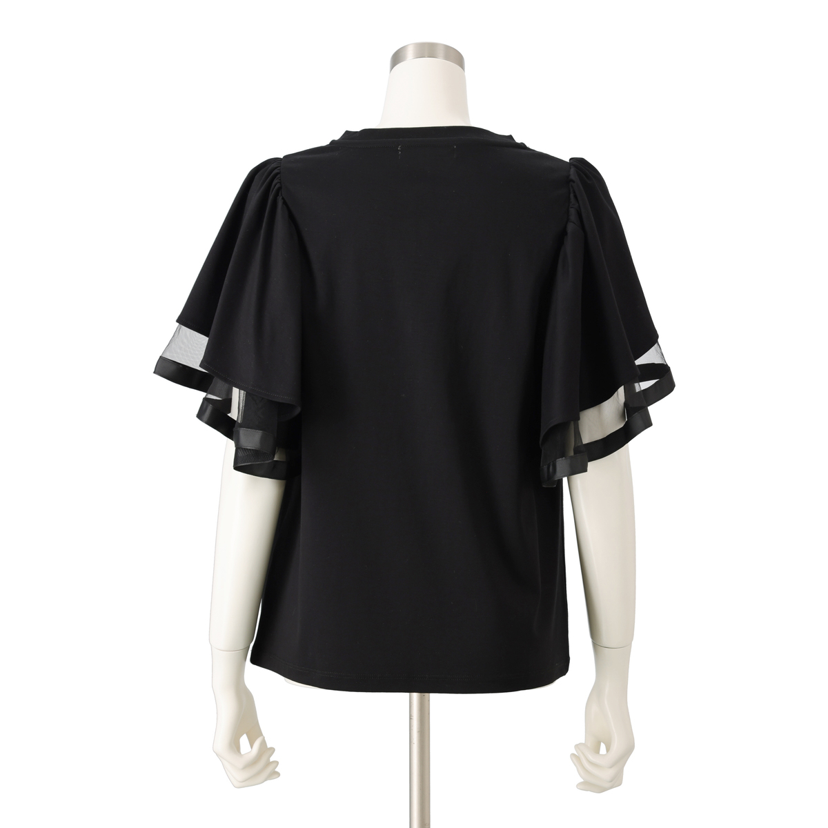 袖は艶のあるシルケット、透け感のあるチュール、ハリのあるグログランを重ねた三層構造。グログランのハリがフリルの落ち感をコントロールし、広がり過ぎず二の腕をふんわりカバーします