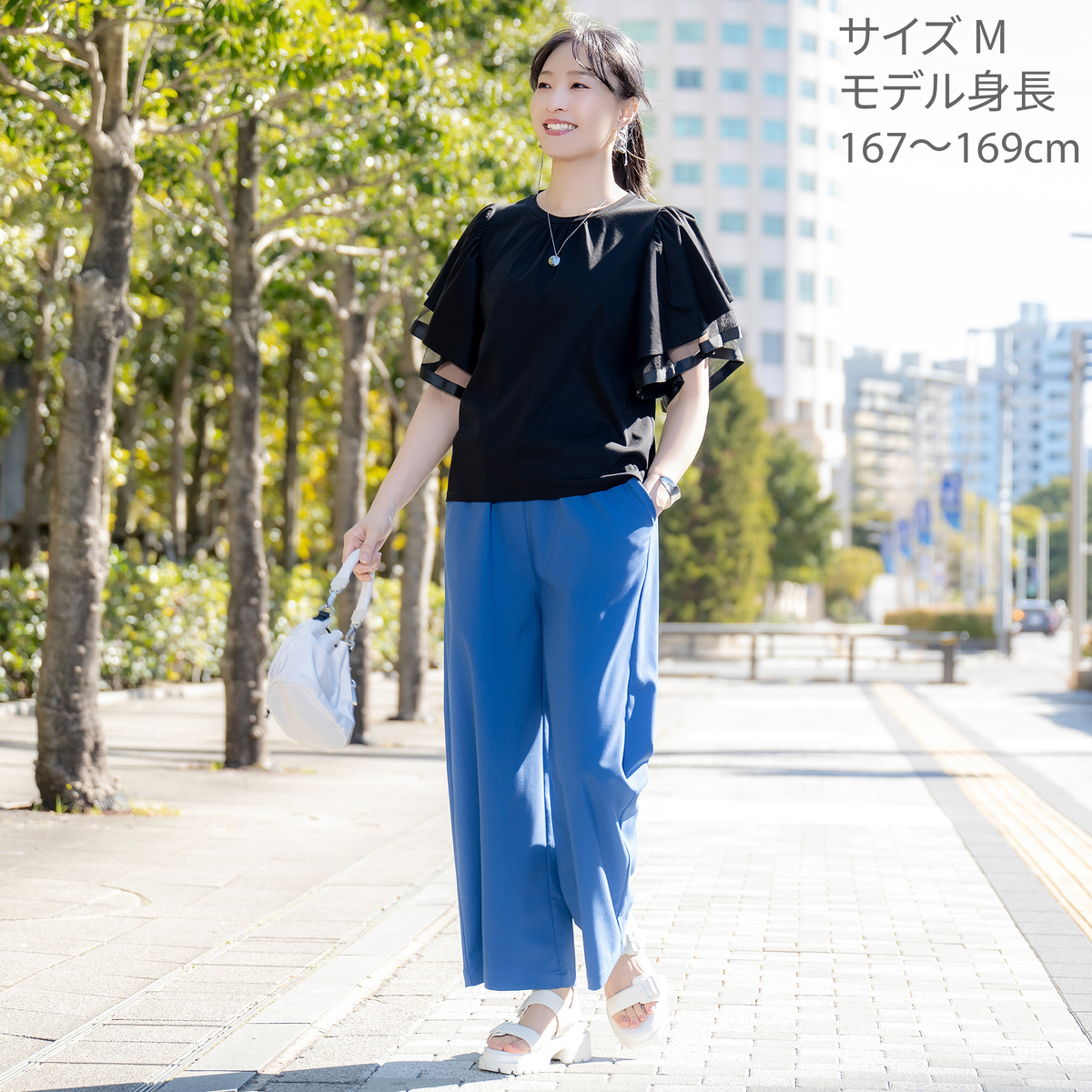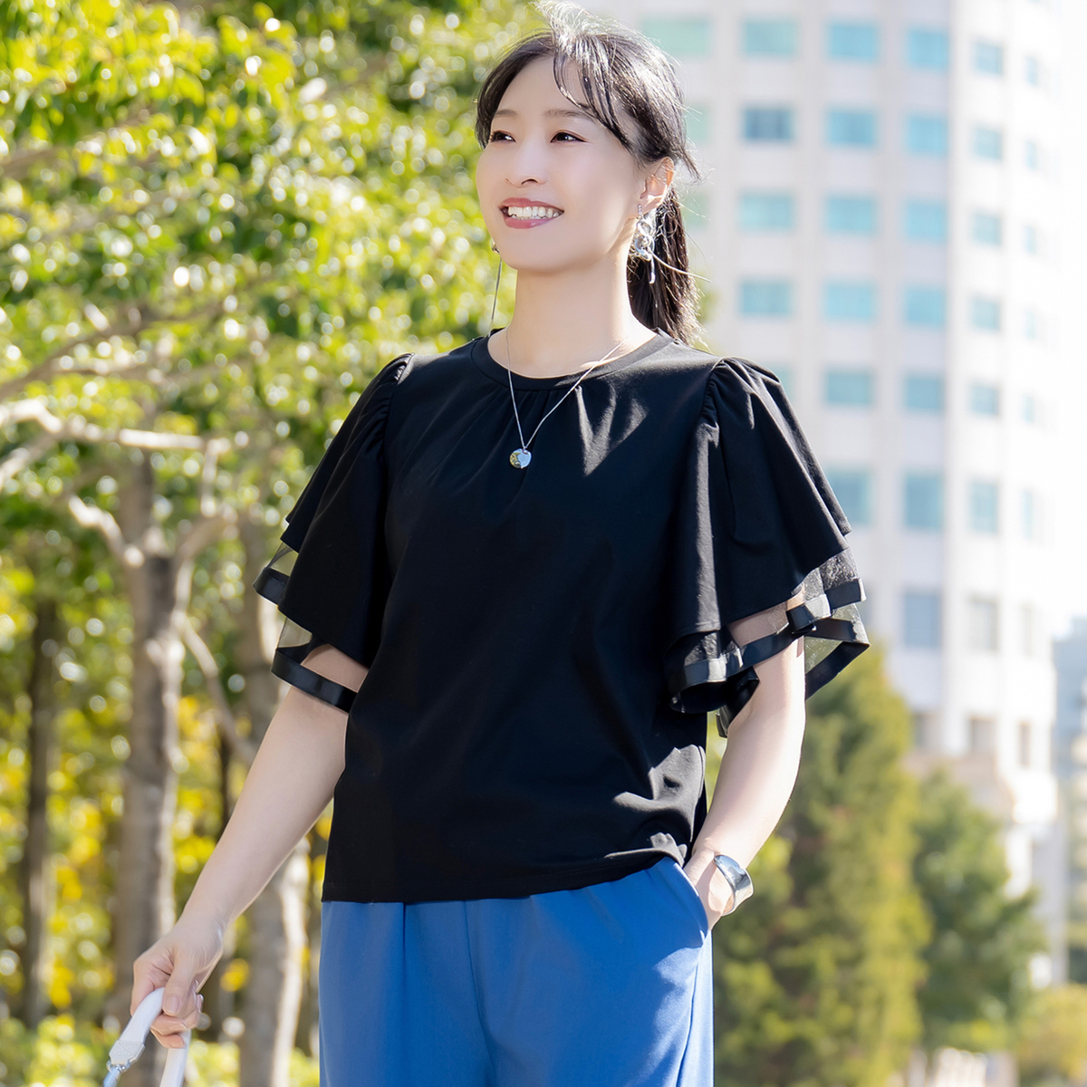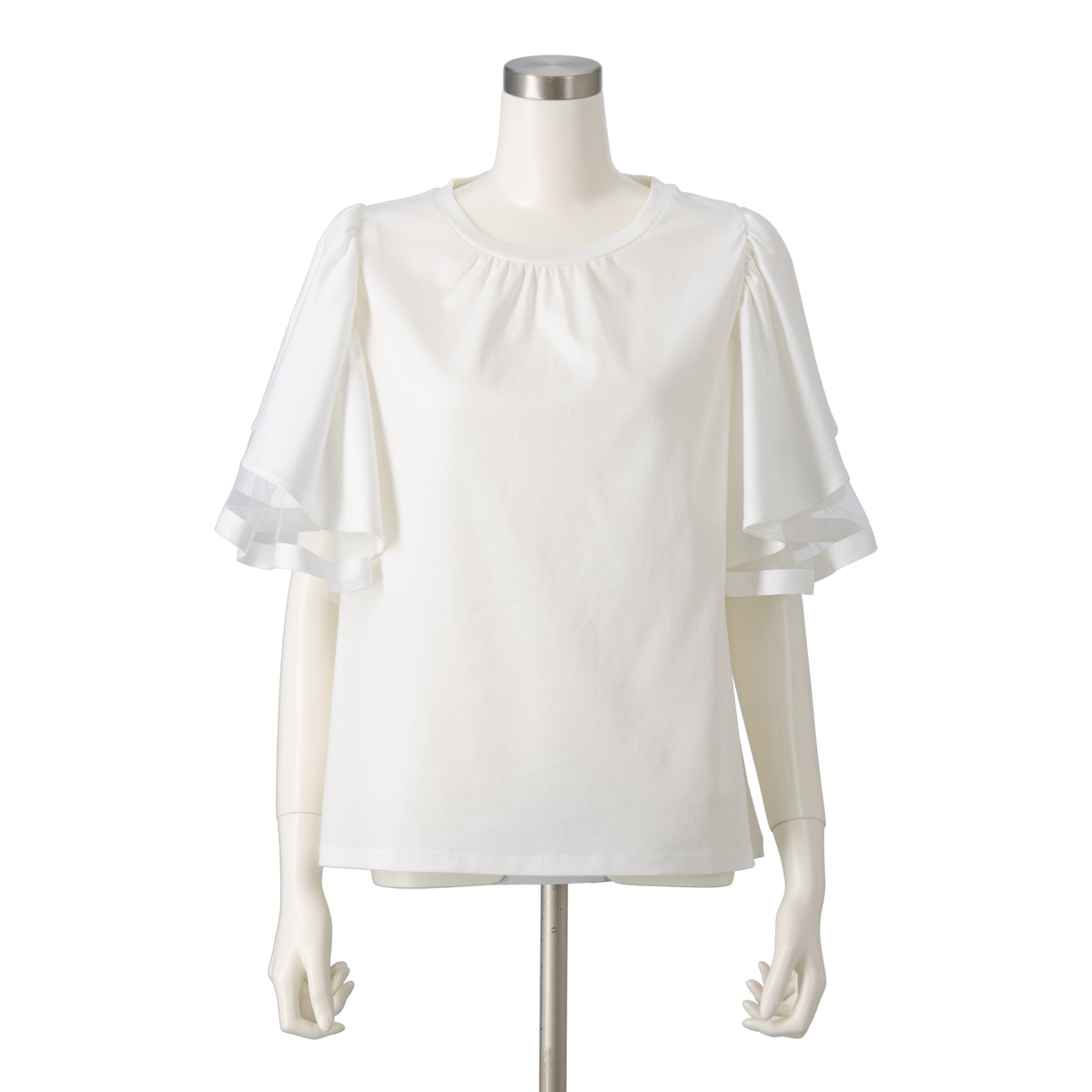 袖は艶のあるシルケット、透け感のあるチュール、ハリのあるグログランを重ねた三層構造。グログランのハリがフリルの落ち感をコントロールし、広がり過ぎず二の腕をふんわりカバーします