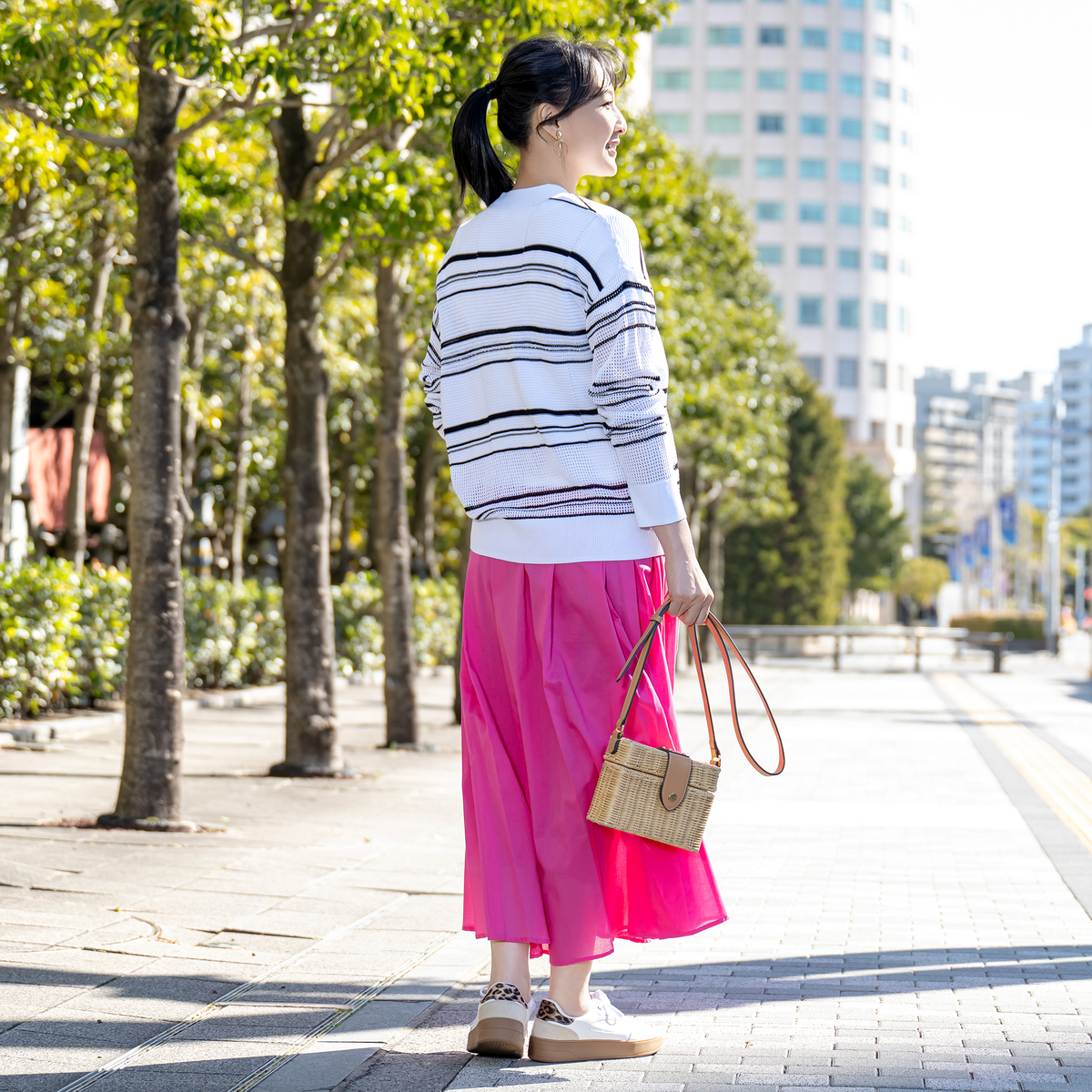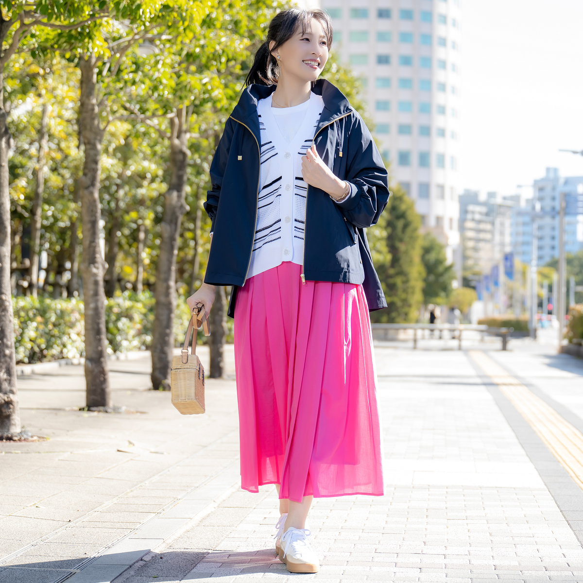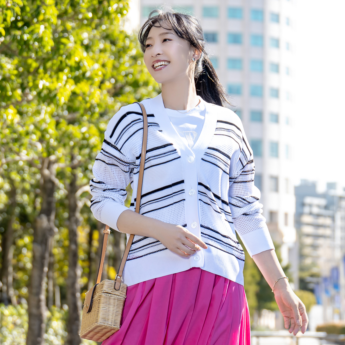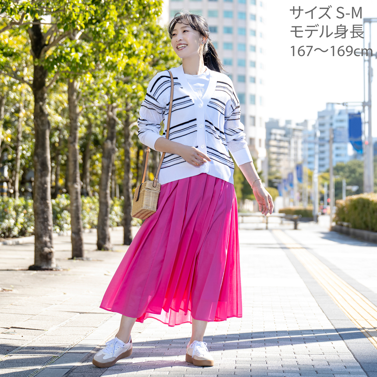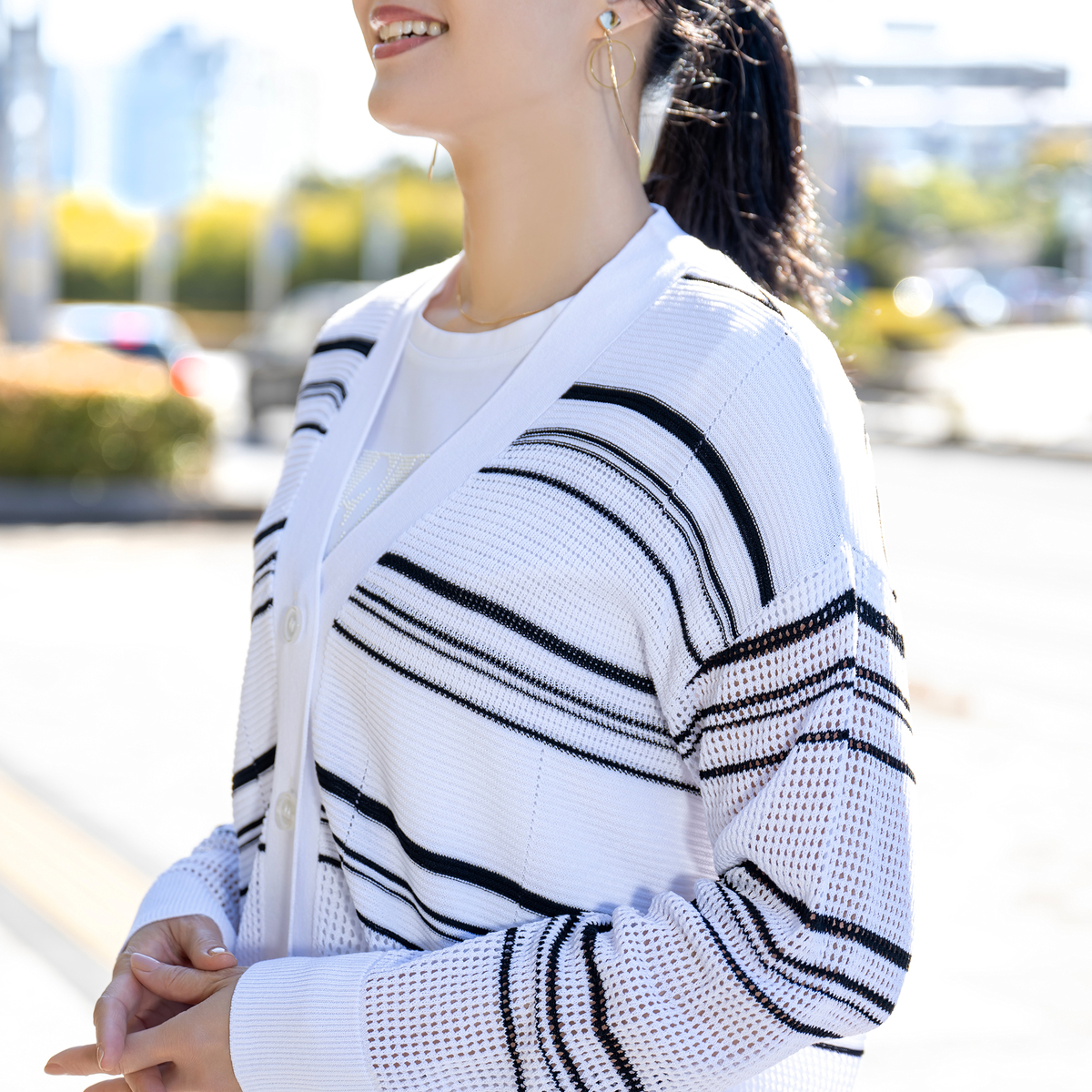 強撚糸ならではのシャリ感が心地よいボーダーメッシュカーディガン。ドライタッチで肌離れがよく、汗ばむ季節も快適です。毛羽立ちが少ないため編み目がクリアに見え、配色ボーダーがいっそう映える仕上がり。軽い編地で、冷房対策や季節の変わり目にもさっと羽織れます