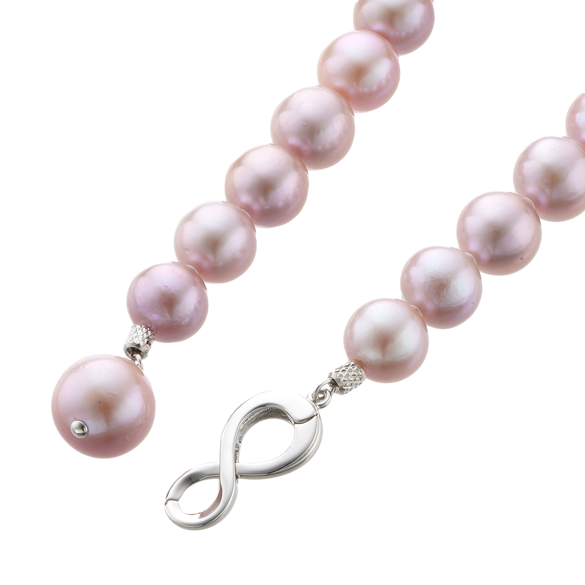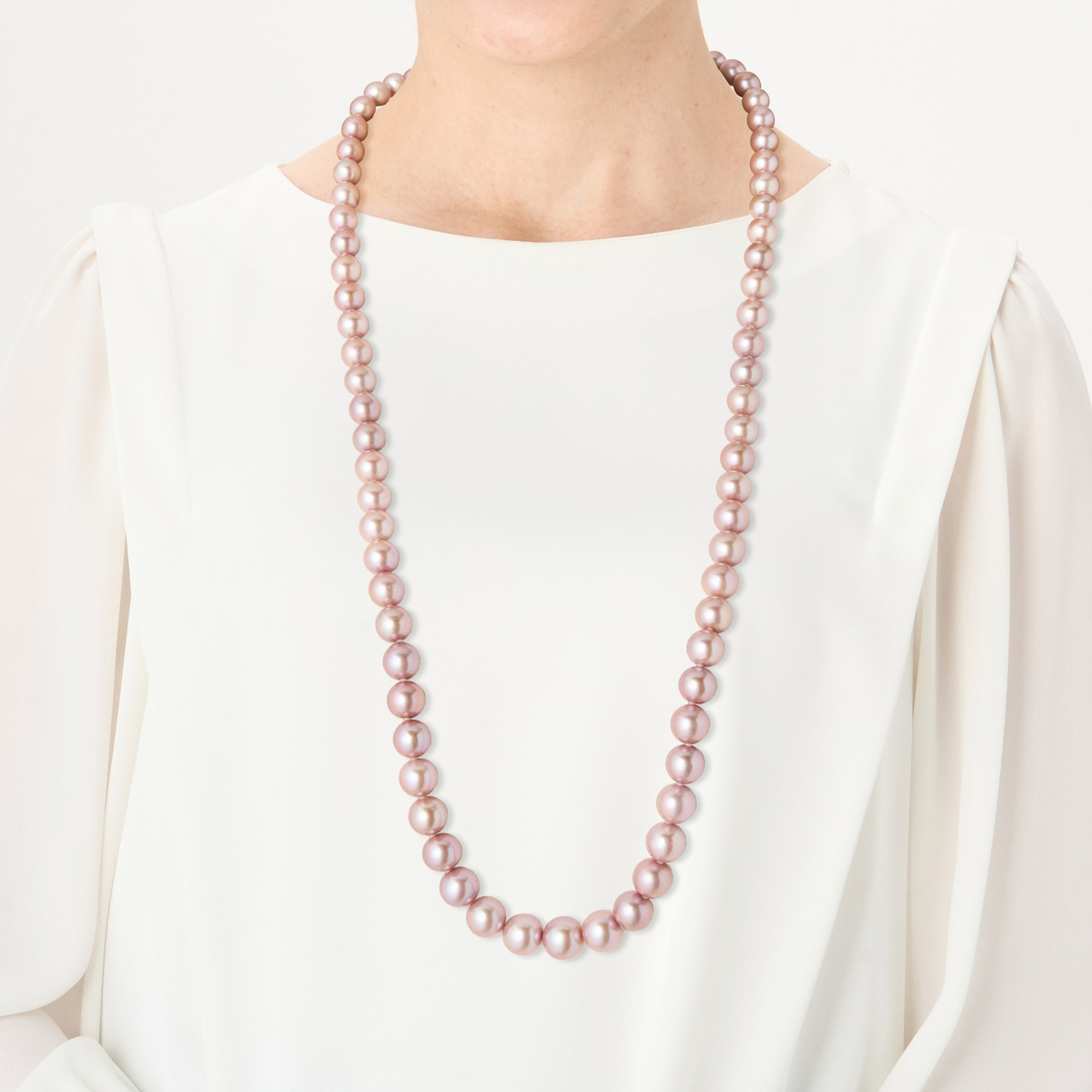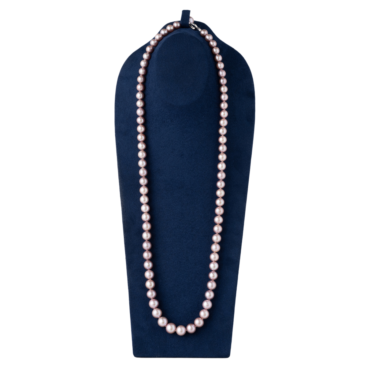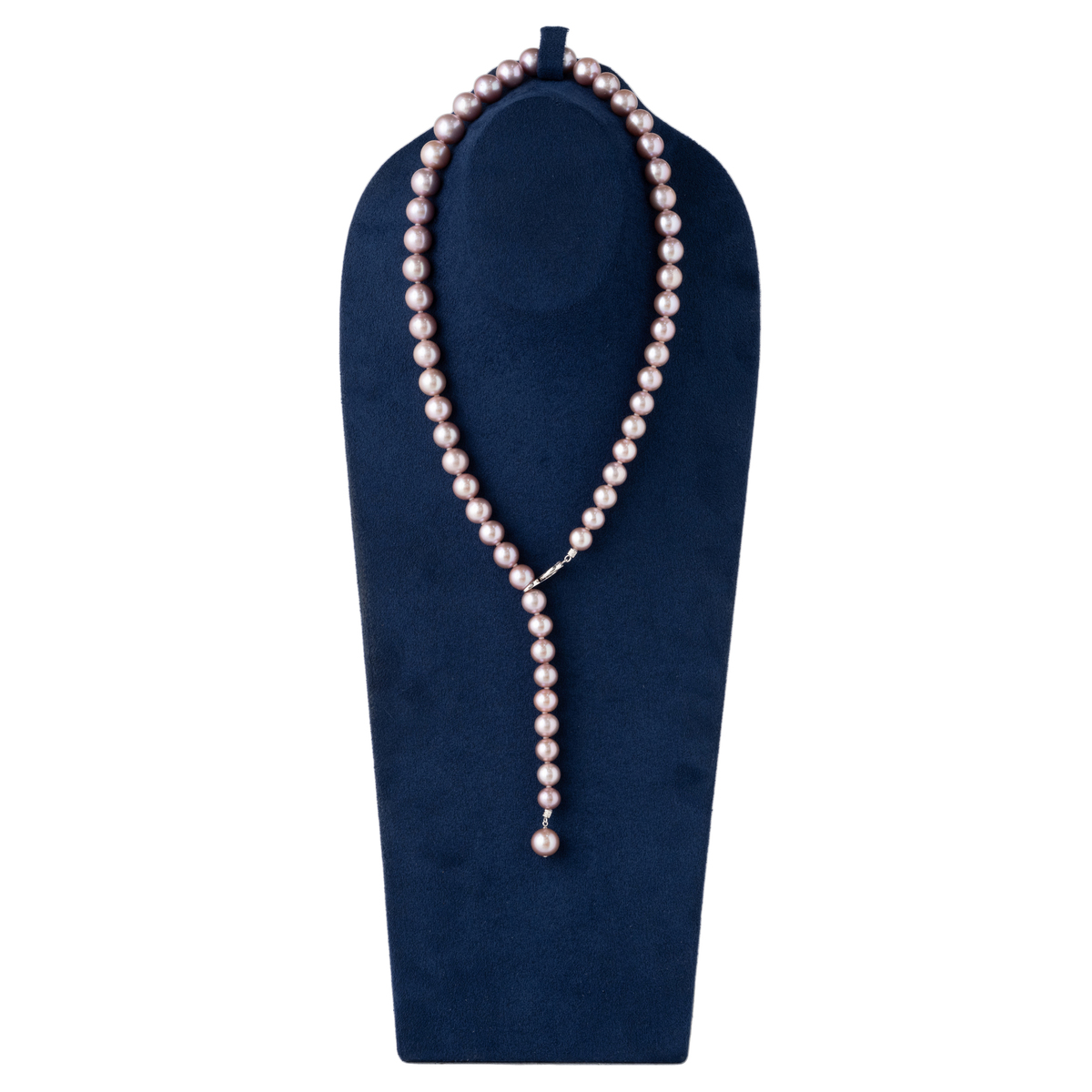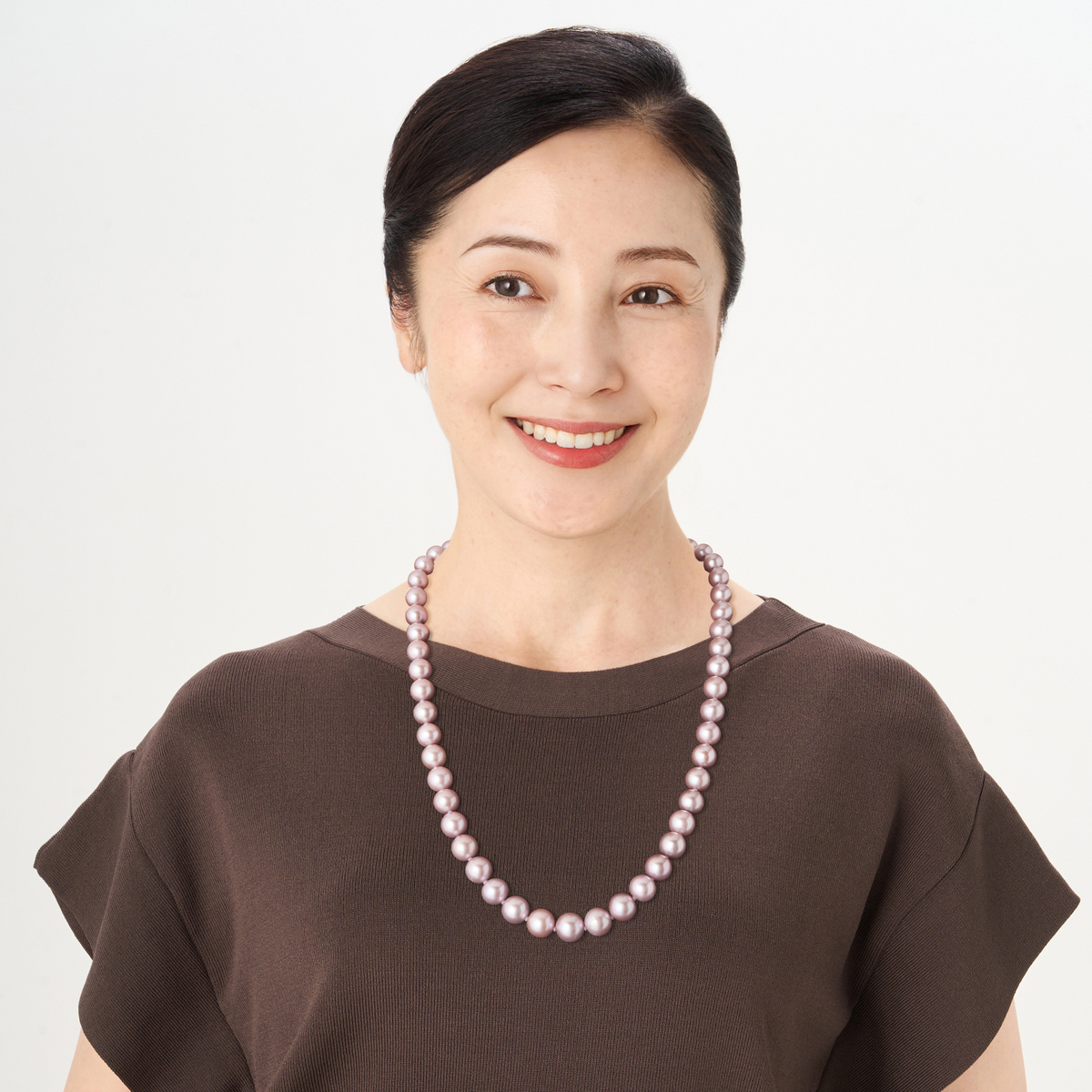 天然色のラベンダーパールが静かに輝くネックレス。真珠総合研究所にテリがトップグレードの範疇と認められた有核淡水真珠のナチュラルラベンダーカラーを使用し、落ち着いた高級感を漂わせます。通常のネックレスとしても、クリップで好みの位置に留めても楽しめ、形状記憶ワイヤーがしなやかさと扱いやすさを保つ上品な一品です