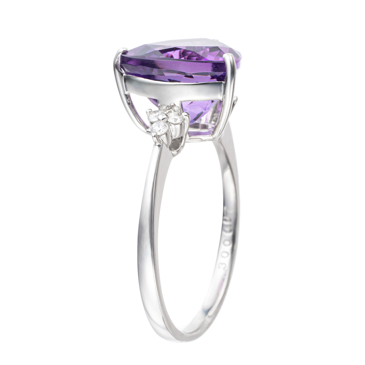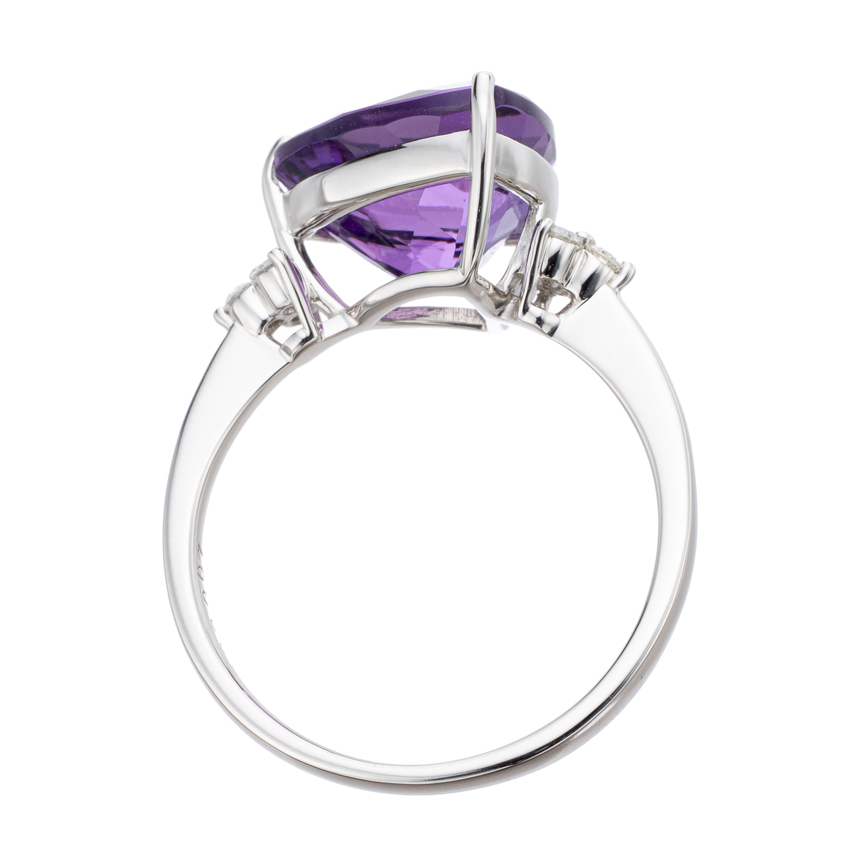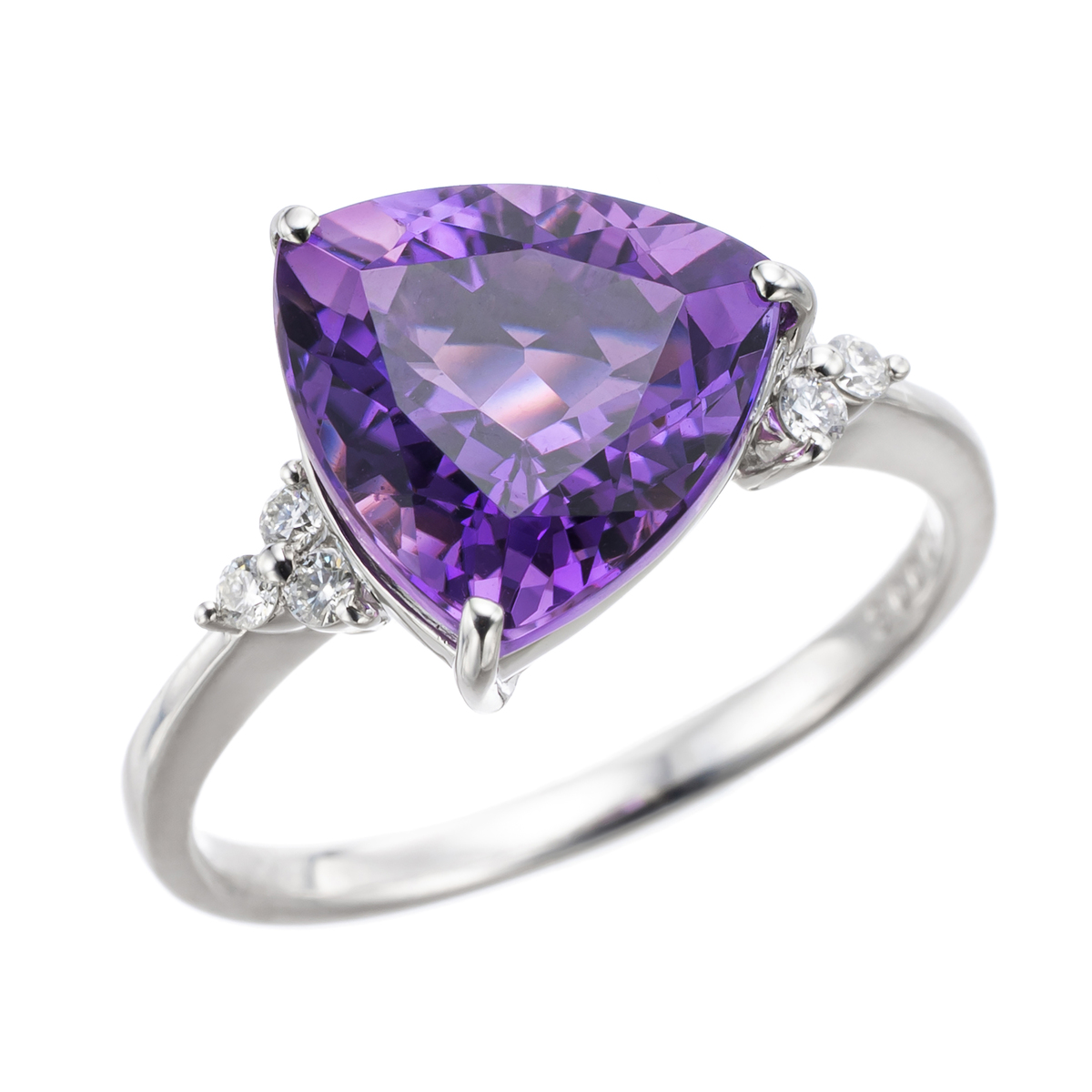 素材: [アメシスト] トリリアントカット 爪留め 1石 3.00ctUP [ダイヤモンド] ラウンドシェイプ 爪留め 6石 合計0.07ctUP 最大幅(約) 10.5mm 最小幅(約) 0.5mm 総重量(約) 2.9g [地金] プラチナ950 ■サイズ直し対象外 ■受注発注商品のためデザイン・価値に影響のない範囲で仕様が変わる場合がございます ■素材の大きさ・形・色合い、製品のサイズは1点1点多少異なります 【日本製(アメシストはザンビア産)】