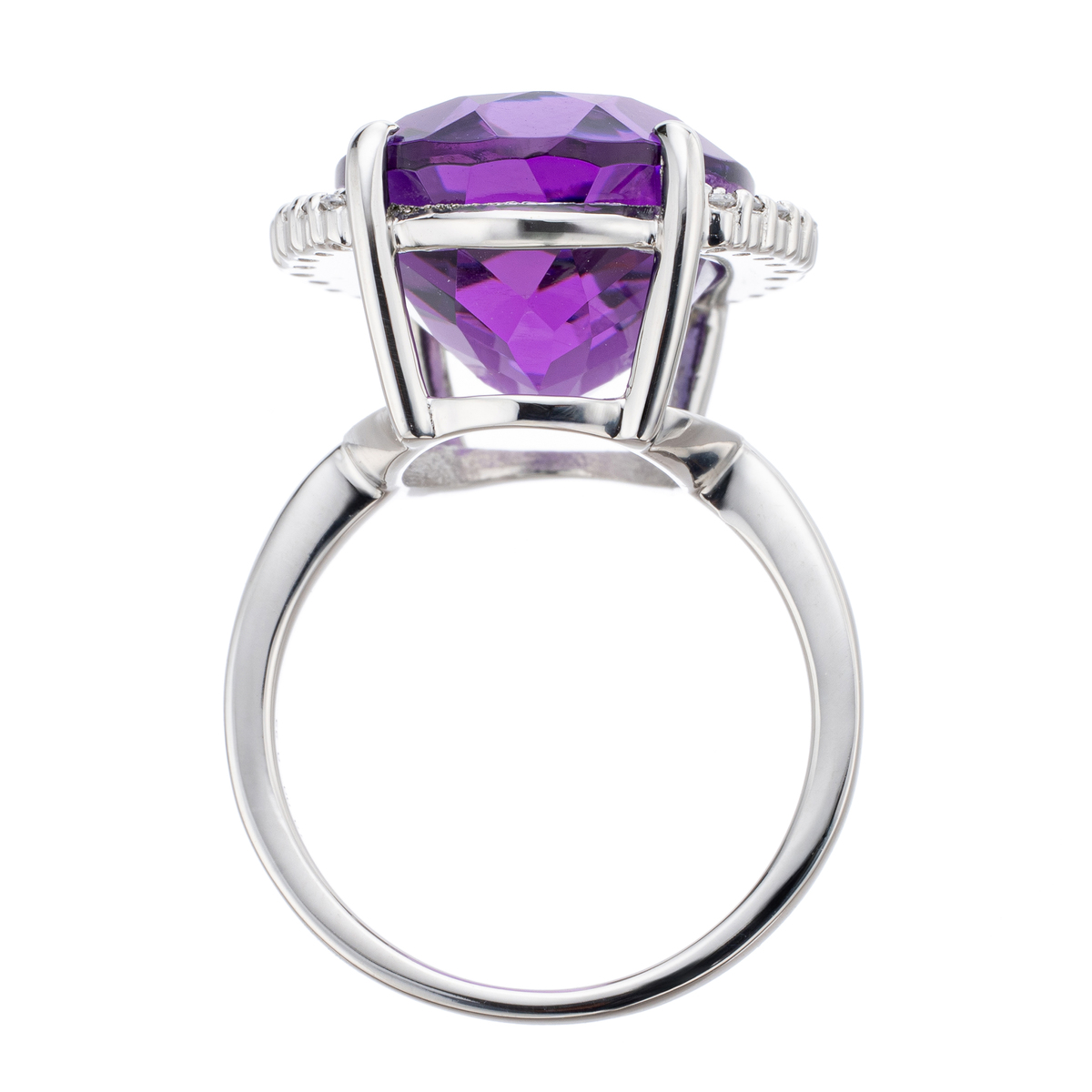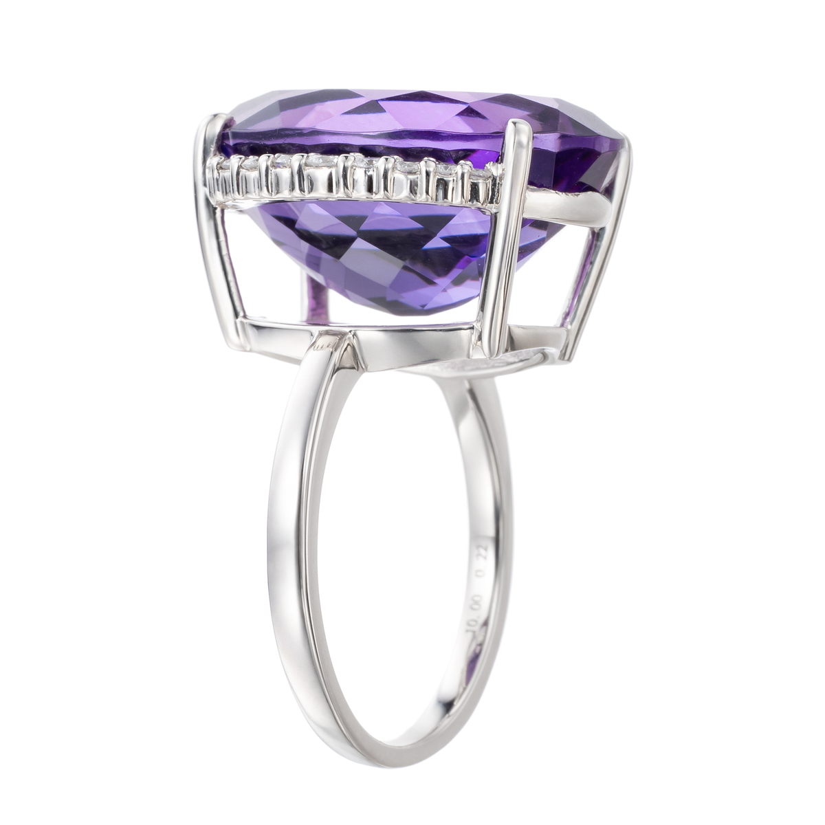 素材: [アメシスト] オーバルシェイプ 爪留め 1石 10.00ctUP [ダイヤモンド] ラウンドシェイプ 爪留め 18石 合計0.22ctUP 最大幅(約) 17.7mm 最小幅(約) 1.5mm 総重量(約) 7.0g [地金] プラチナ950 ■サイズ直し対象外 ■受注発注商品のためデザイン・価値に影響のない範囲で仕様が変わる場合がございます ■素材の大きさ・形・色合い、製品のサイズは1点1点多少異なります 【日本製(アメシストはザンビア産)】