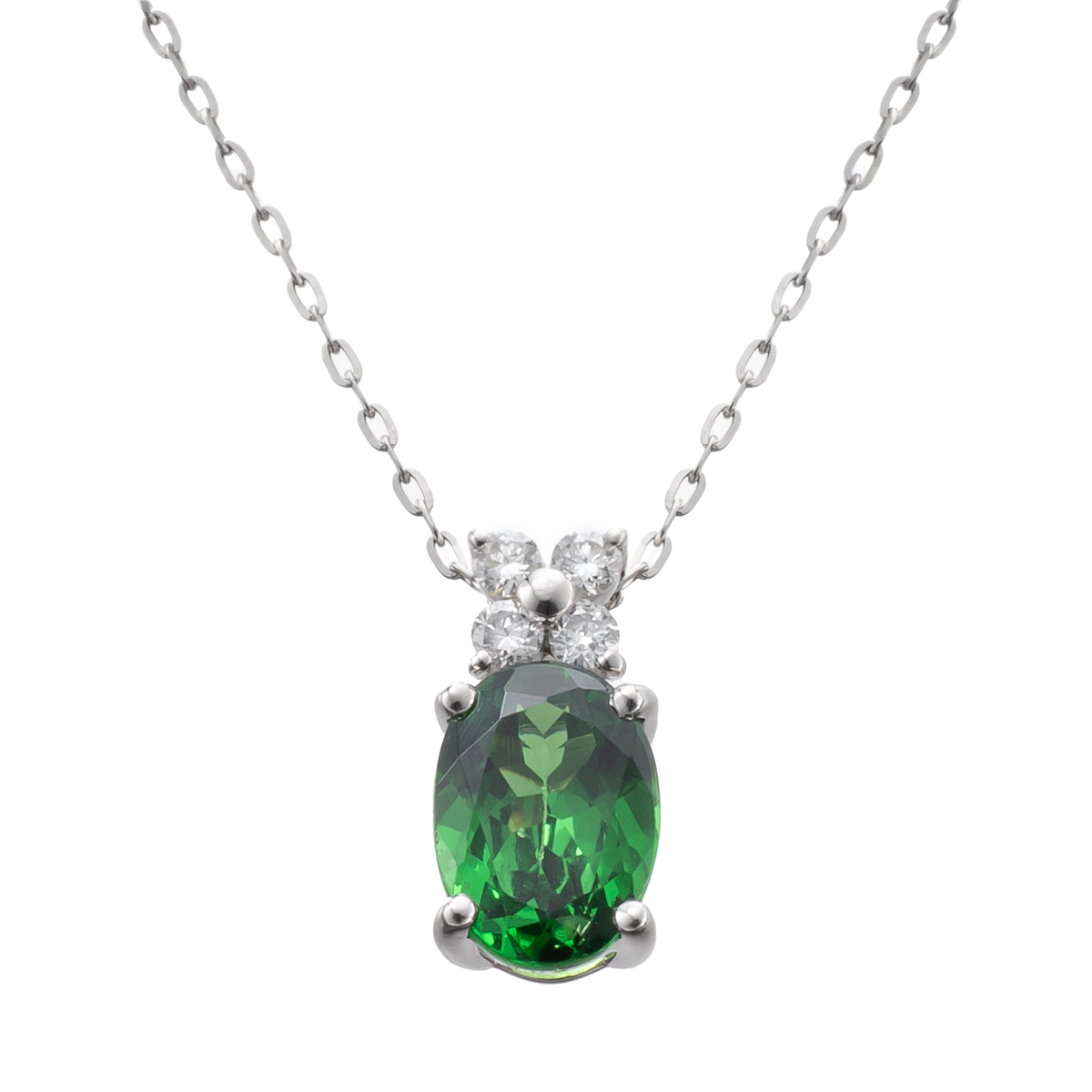 素材:[ツァボライト] オーバルシェイプ 爪留め 1石 0.60ctUP [ダイヤモンド] ラウンドシェイプ 爪留め 4石 合計0.04ctUP 総重量(約) 1.3g 長さ(約) 45.0cm バチカンの内径(約) 3.0×1.0mm 幅(約) 0.6mm チェーンの形状 アズキ 留具の形状 引き輪 アジャスターの有無 有(スライド式) チェーンの取り外し 可 ヘッドの縦×横(約) 9.0×4.3mm [地金] プラチナ900(本体)、プラチナ850(チェーン) [付属品] 鑑別書 ■受注発注商品のためデザイン・価値に影響のない範囲で仕様が変わる場合がございます ■素材の大きさ・形・色合い、製品のサイズは1点1点多少異なります ■『ツァボライト』は商業名で、宝石名は『グロッシュラーガーネット』です 【日本製】