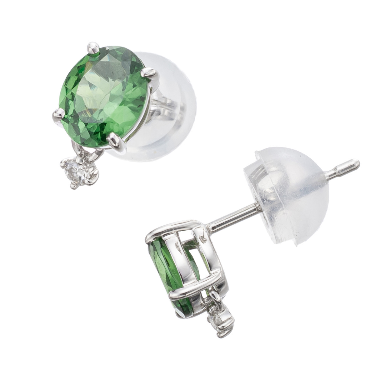 鮮やかな緑色が美しいツァボライト。オーバルシェイプ0.60ctUPの石をセットしました。さらに揺れるダイヤモンドが、横顔を印象的に演出します