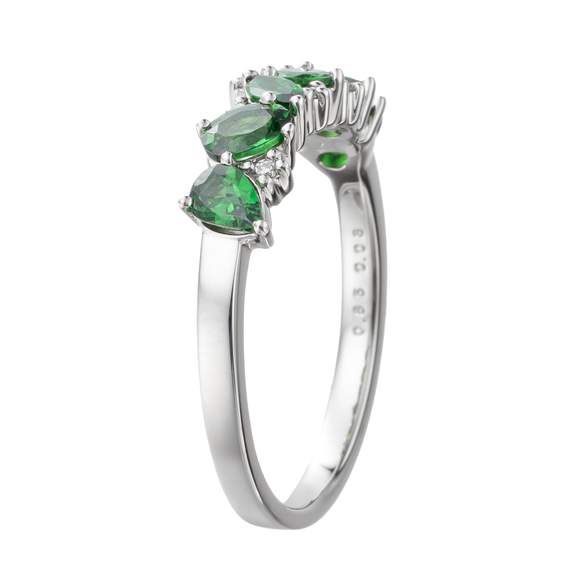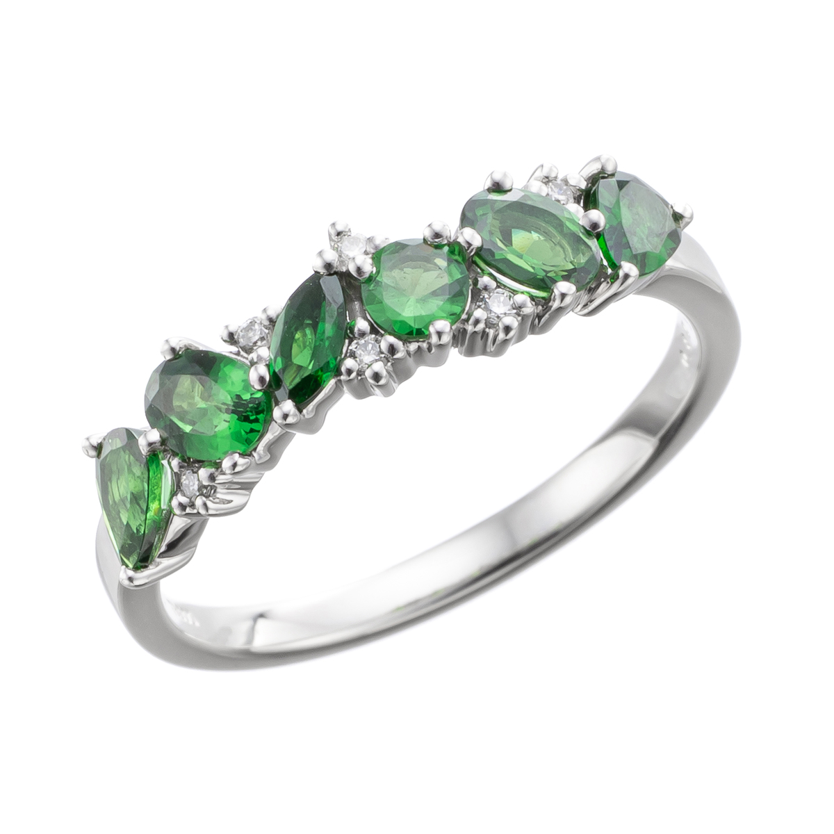 素材:[ツァボライト] オーバルシェイプ 2石、ペアシェイプ 2石、 マーキスシェイプ 1石、 ラウンドシェイプ 1石 全て爪留め、 6石合計0.80ctUP [ダイヤモンド] ラウンドシェイプ 爪留め 6石 合計0.03ctUP 最大幅(約) 5.0mm 最小幅(約) 1.5mm 総重量(約) 2.9g [地金] プラチナ900 [付属品] 鑑別書 ■受注発注商品のためデザイン・価値に影響のない範囲で仕様が変わる場合がございます ■素材の大きさ・形・色合い、製品のサイズは1点1点多少異なります ■『ツァボライト』は商業名で、宝石名は『グロッシュラーガーネット』です 【日本製】