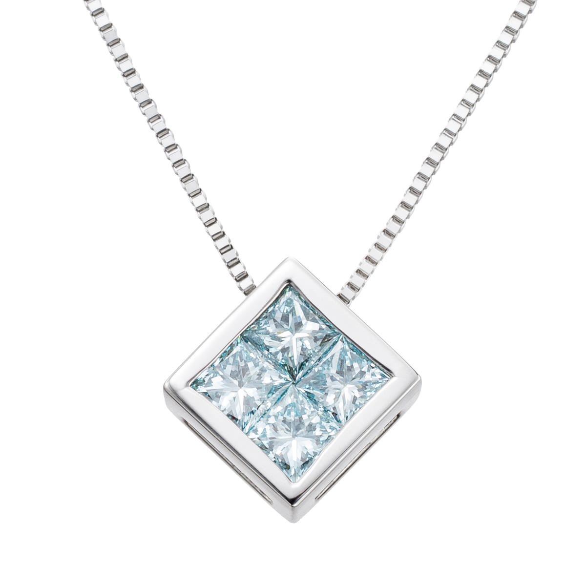 幻想的なアイスブルーの輝きが楽しめるペンダント。天然ダイヤモンドに人為的な処理を施し、ブルーに加工しました。氷のように透き通った上品な美しさが特徴です