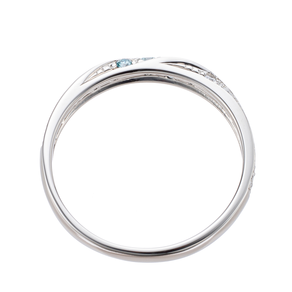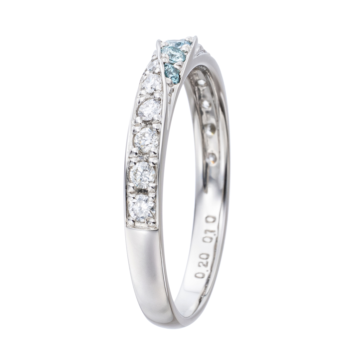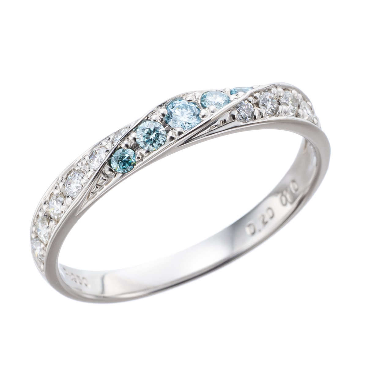 アイスブルーダイヤモンドと透明感のあるホワイトダイヤモンドのコントラストが美しいリング。連続性を感じる洗練されたデザインと潤沢なダイヤモンドの輝きが魅力です
