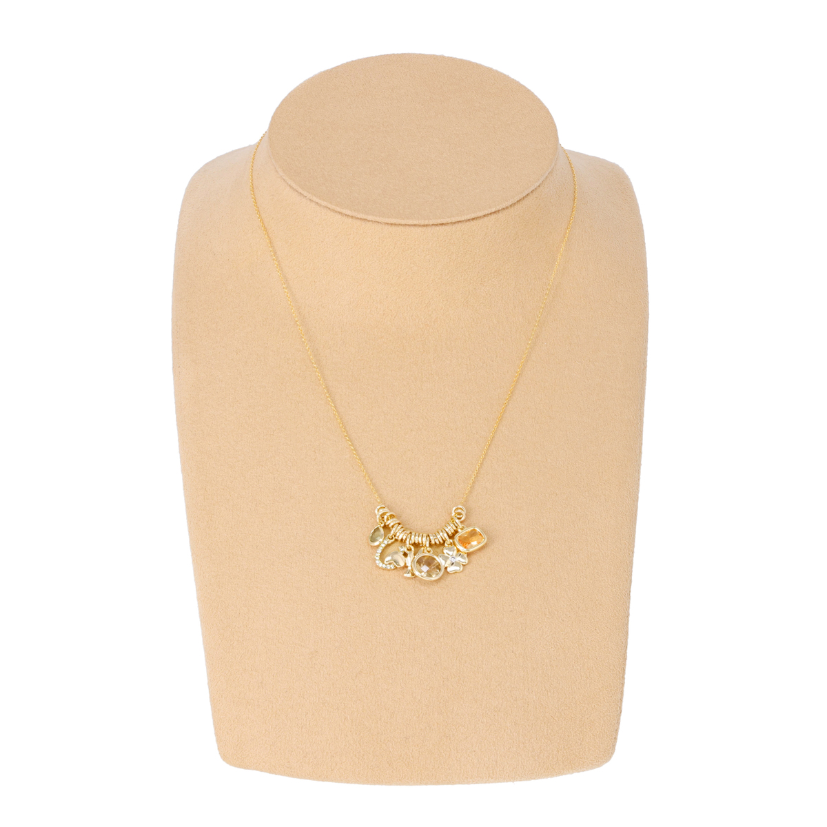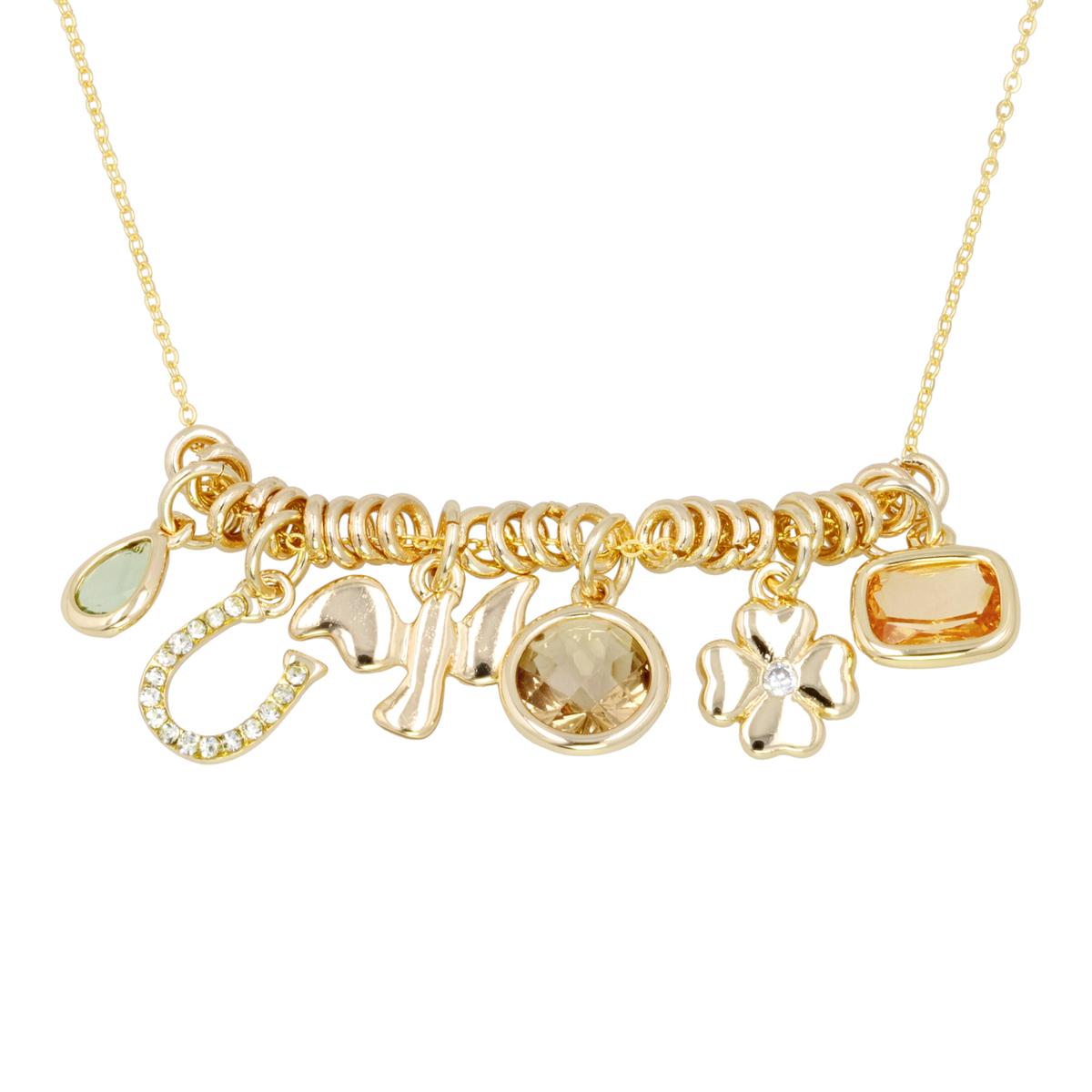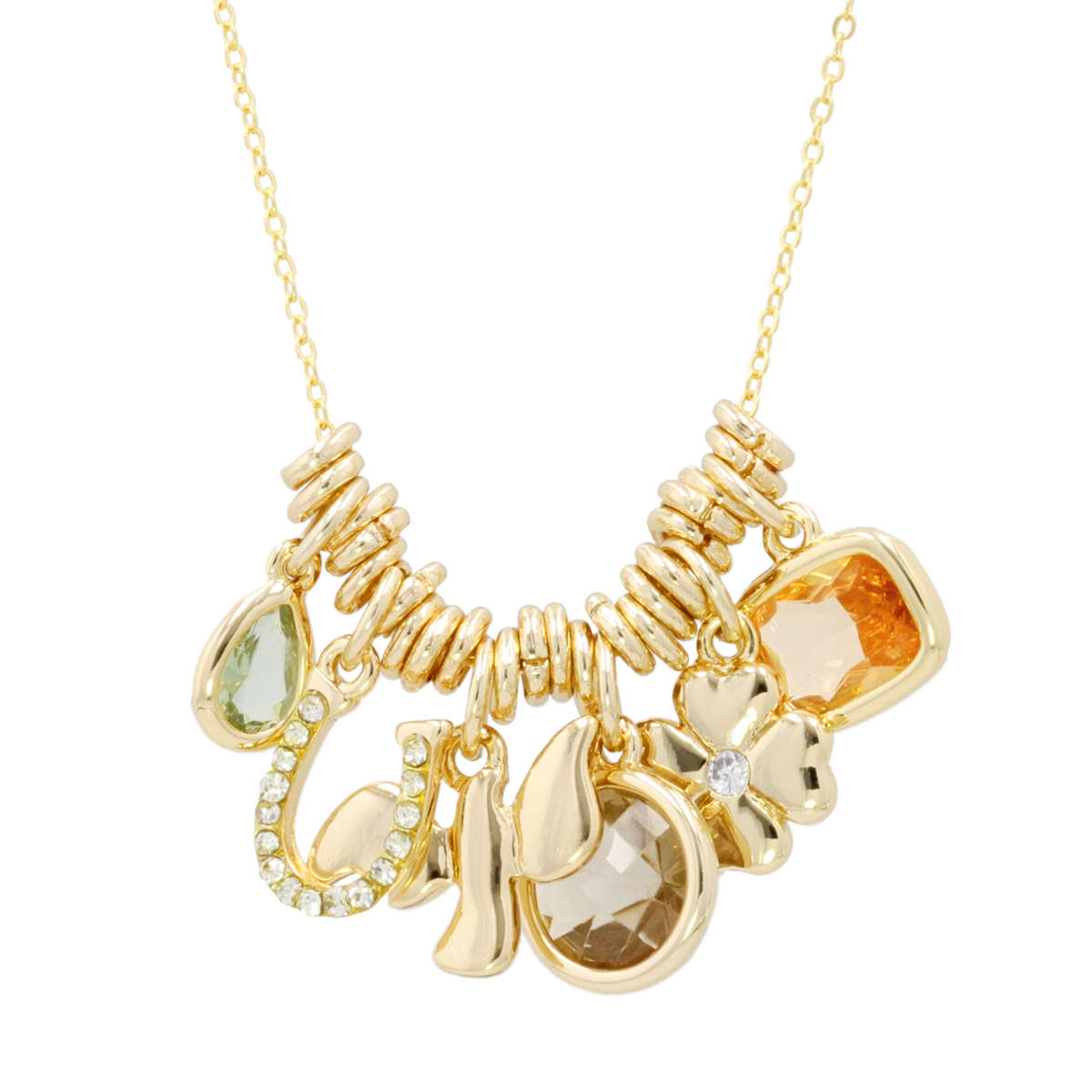 ゴールドカラーを基調にしたラッキーモチーフのネックレス。馬蹄は幸せの象徴、四葉のクローバーは希望・信頼・愛・幸運を示すモチーフとして親しまれています。程よい存在感が胸元を明るく見せ、カジュアルにもきれいめにも合わせやすいデザイン。長さの調整ができるアジャスター付きで使い勝手の良い仕上がりです