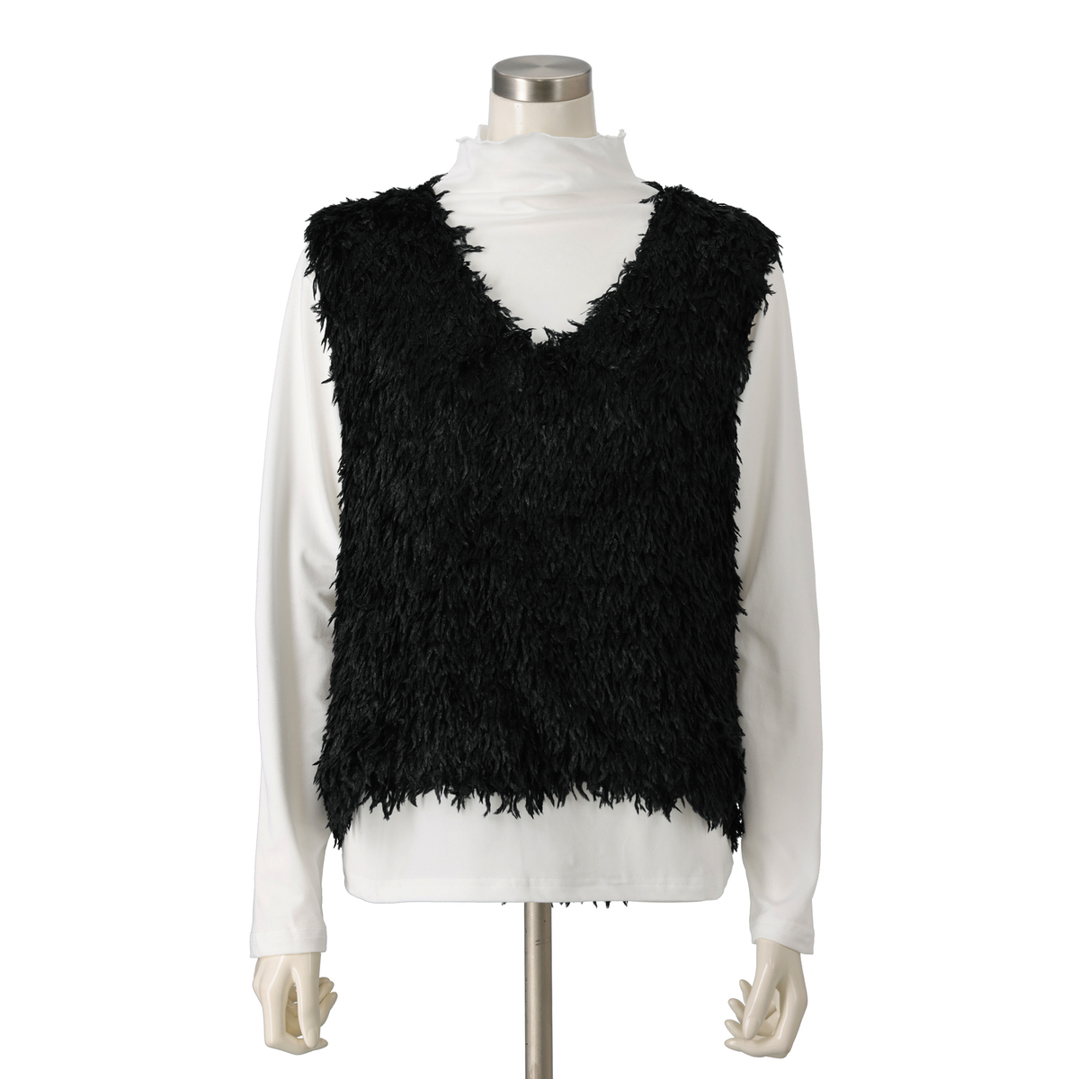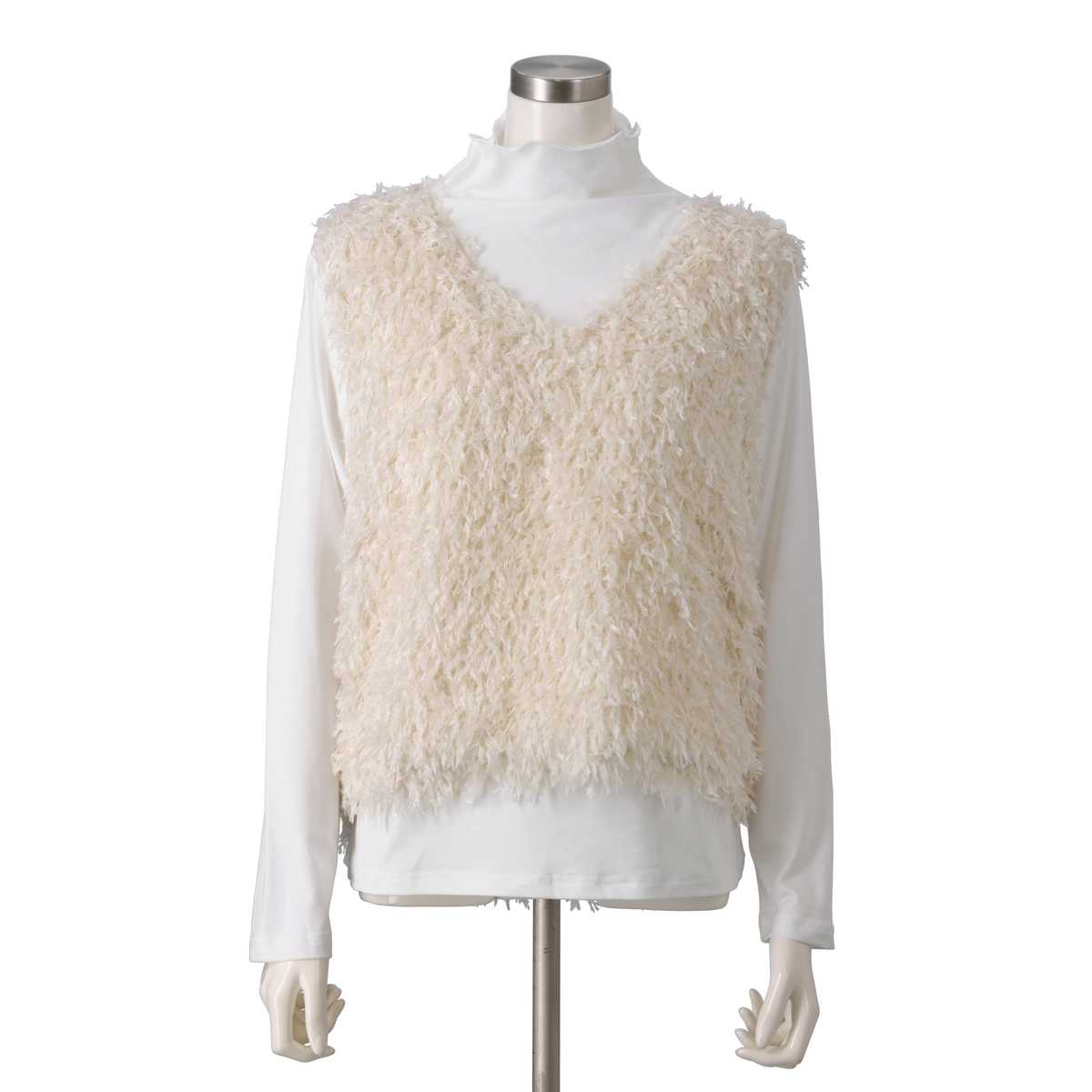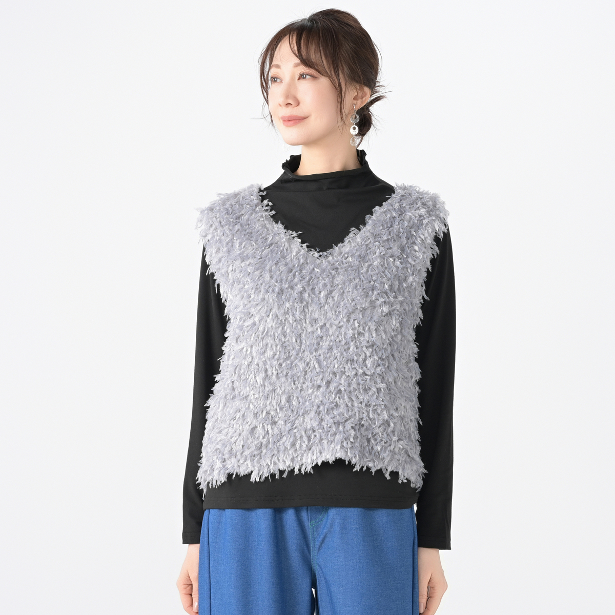 プルオーバーの衿口はメロウ始末でアクセントになり、シャギーベストのふんわりとしたシルエットが気になるウエストまわりを自然にカバー。ベストの深めのVネックがお顔まわりをすっきり見せてくれます
