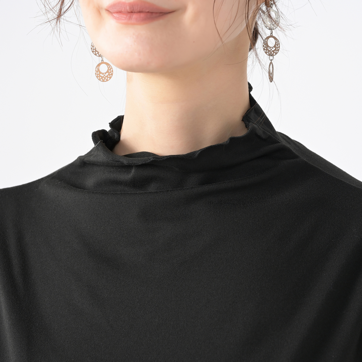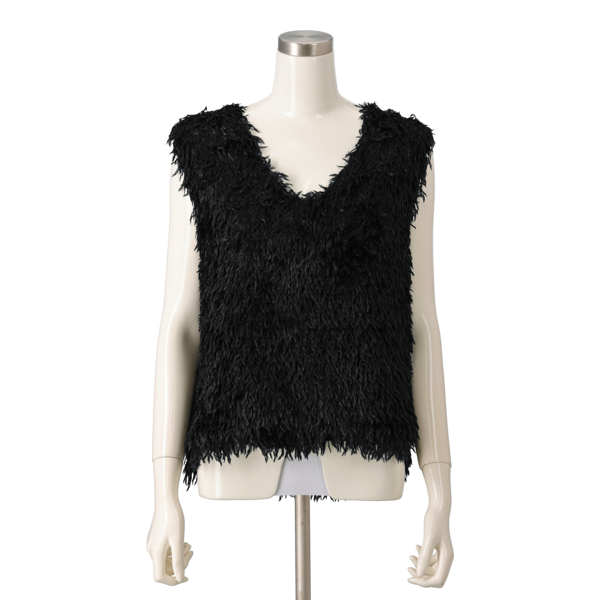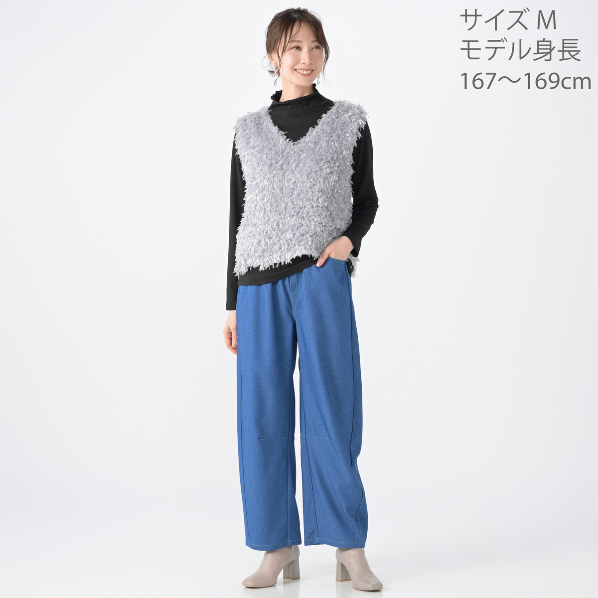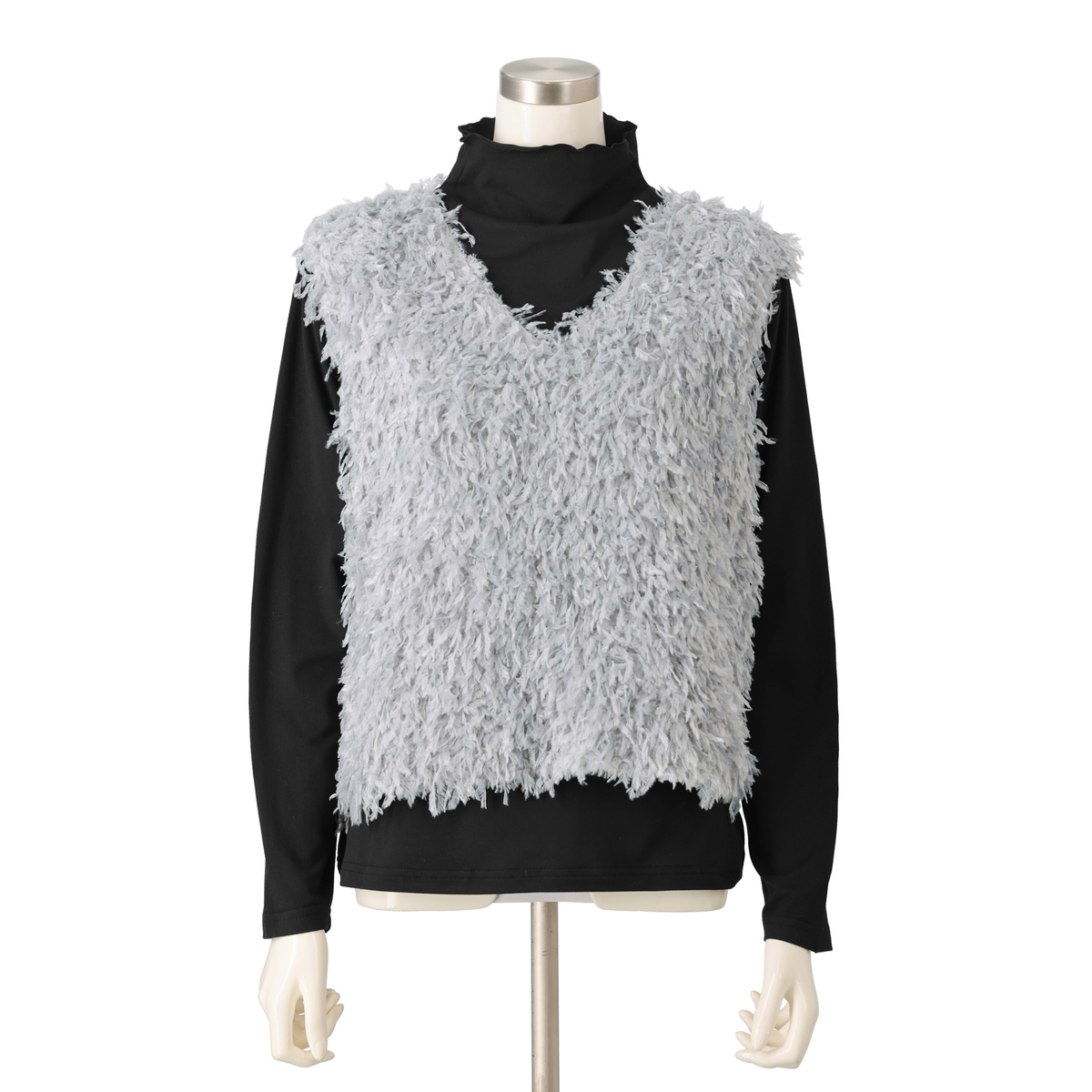 プルオーバーの衿口はメロウ始末でアクセントになり、シャギーベストのふんわりとしたシルエットが気になるウエストまわりを自然にカバー。ベストの深めのVネックがお顔まわりをすっきり見せてくれます