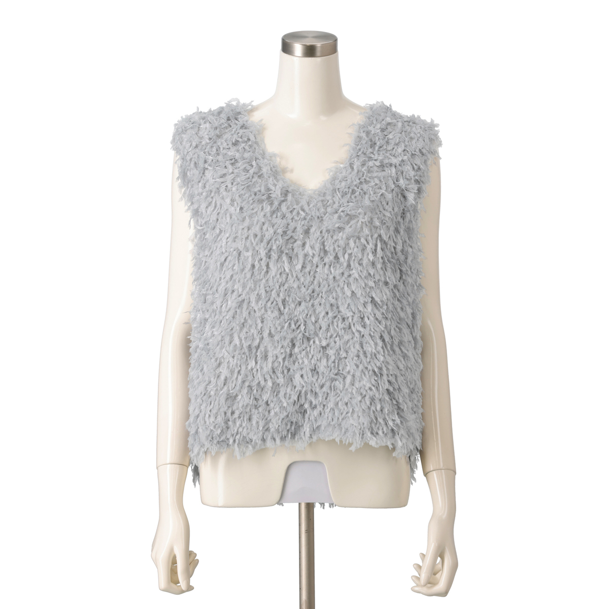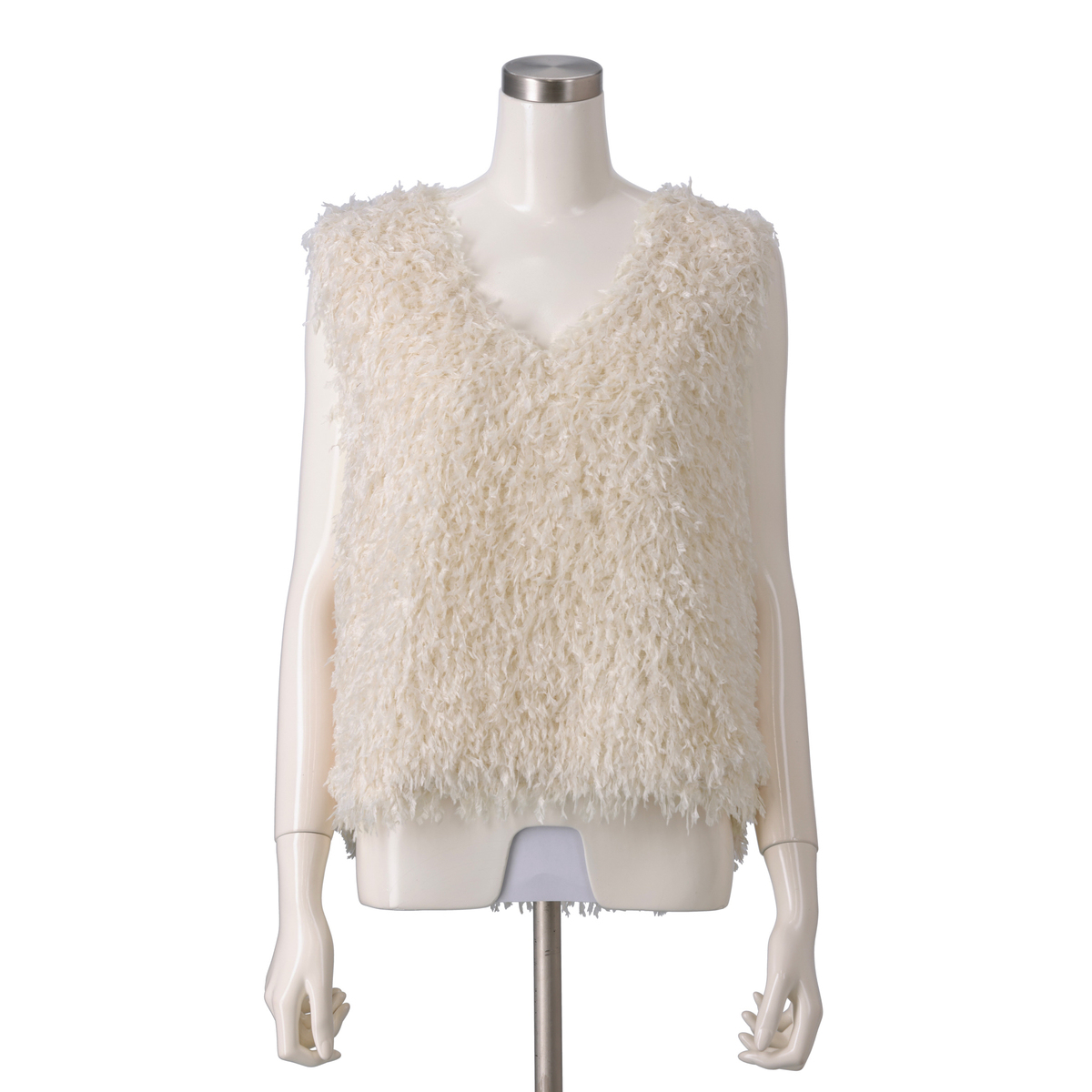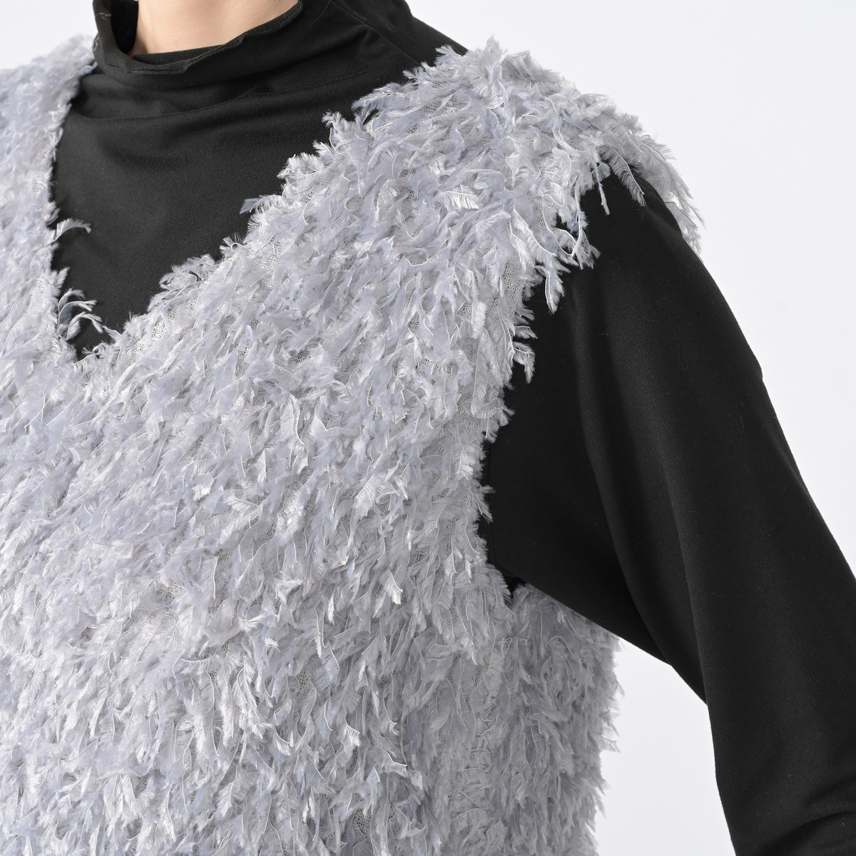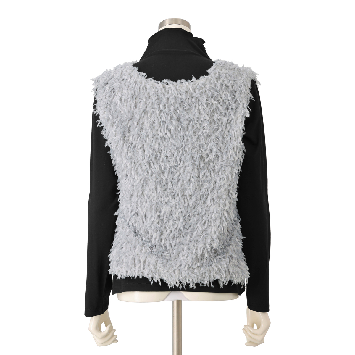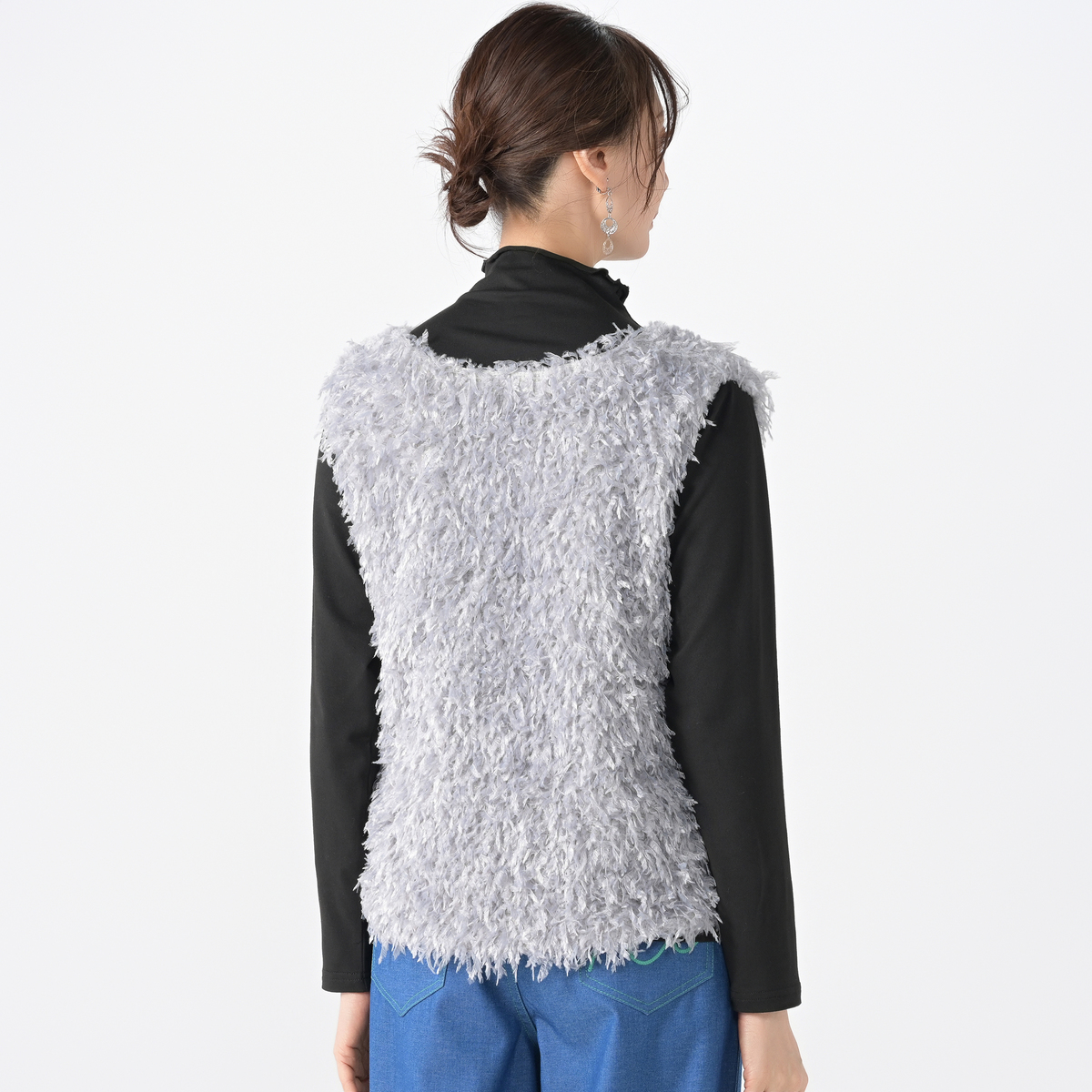 シャギーベストとプルオーバーのアンサンブルです。ベスト本体は、ふんわりとしたフェザーヤーンニット。裏地はジョーゼット素材で、なめらかな仕上がりです。ピーチベア天竺のプルオーバーがセットで、重ね着も単品使いも楽しめ、季節感とトレンド感を取り入れた着こなしが叶います