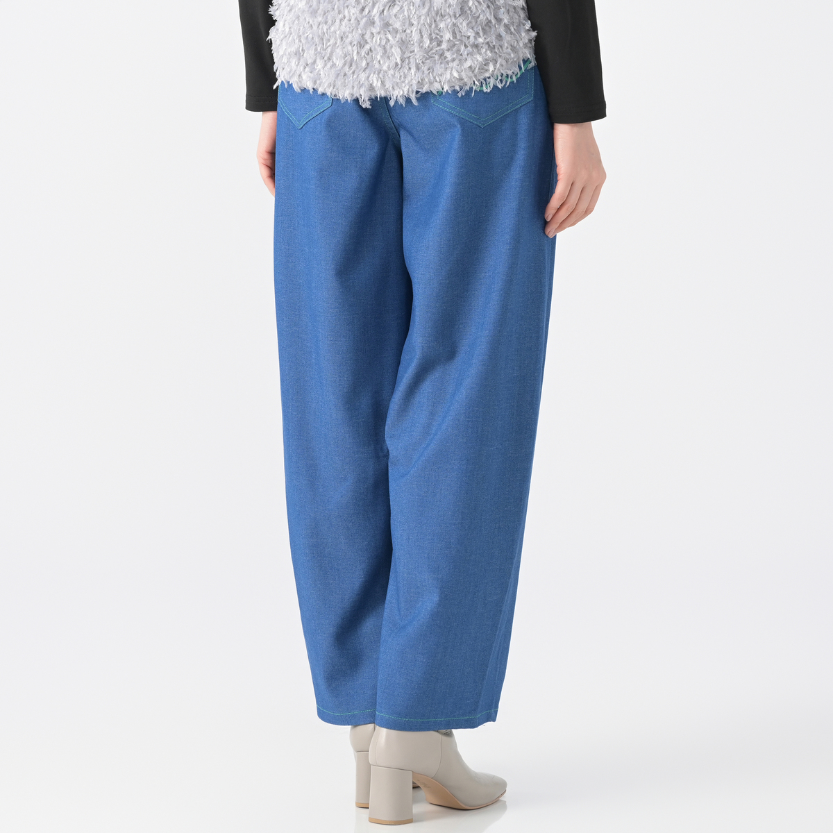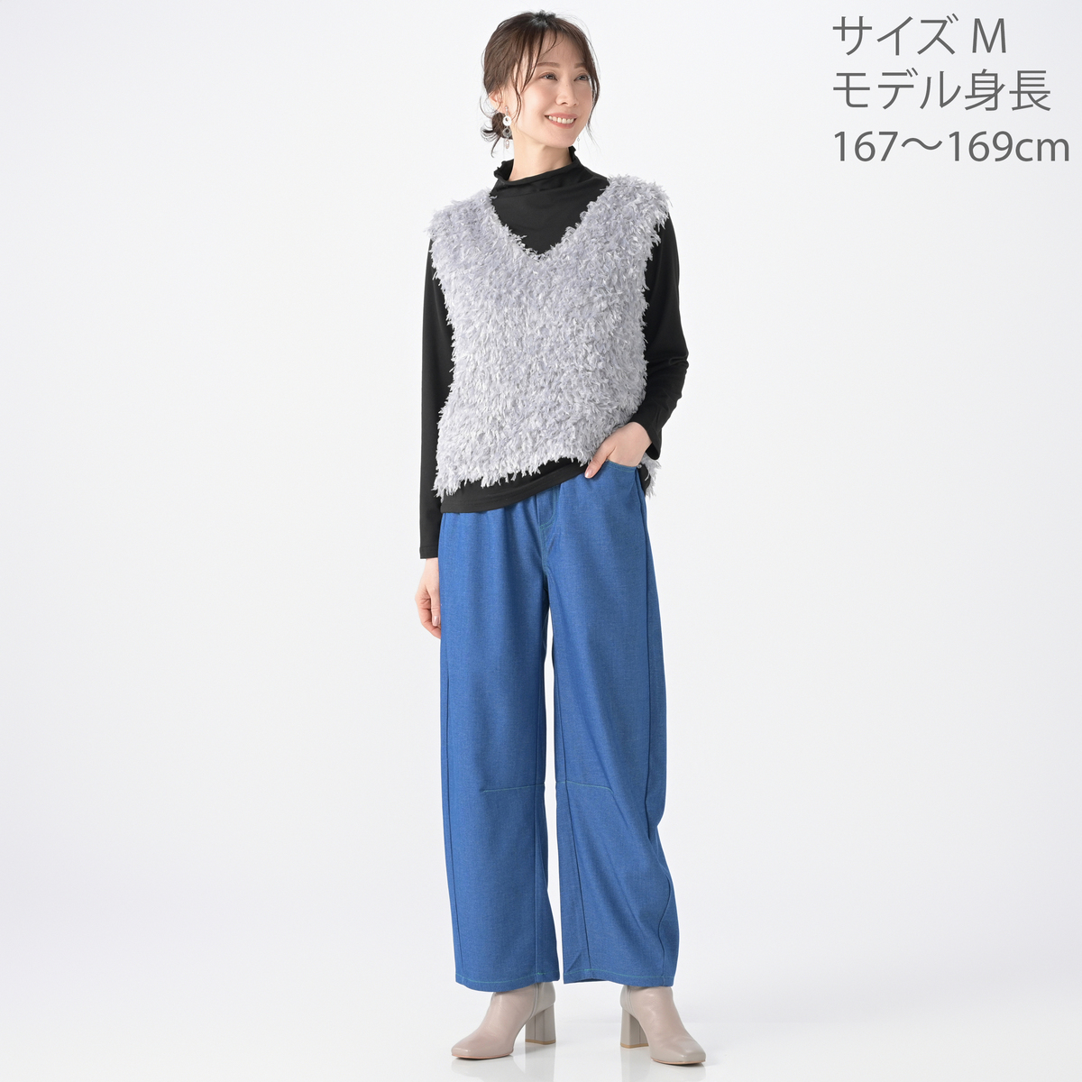 レーヨン混のストレッチデニムを採用し、しなやかで落ち感も。デニムでありながら柔らかくて動きやすく、肌馴染みも良いのでデイリーに活躍します。穿くほどに味わいが増し、表情変化が楽しめるのもデニムならでは。ボリュームニットやショート丈ジャケットとも好相性で、さまざまなスタイルで楽しめます
