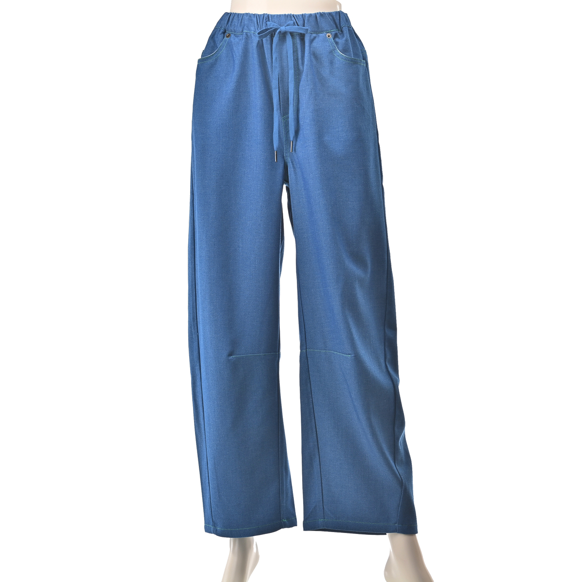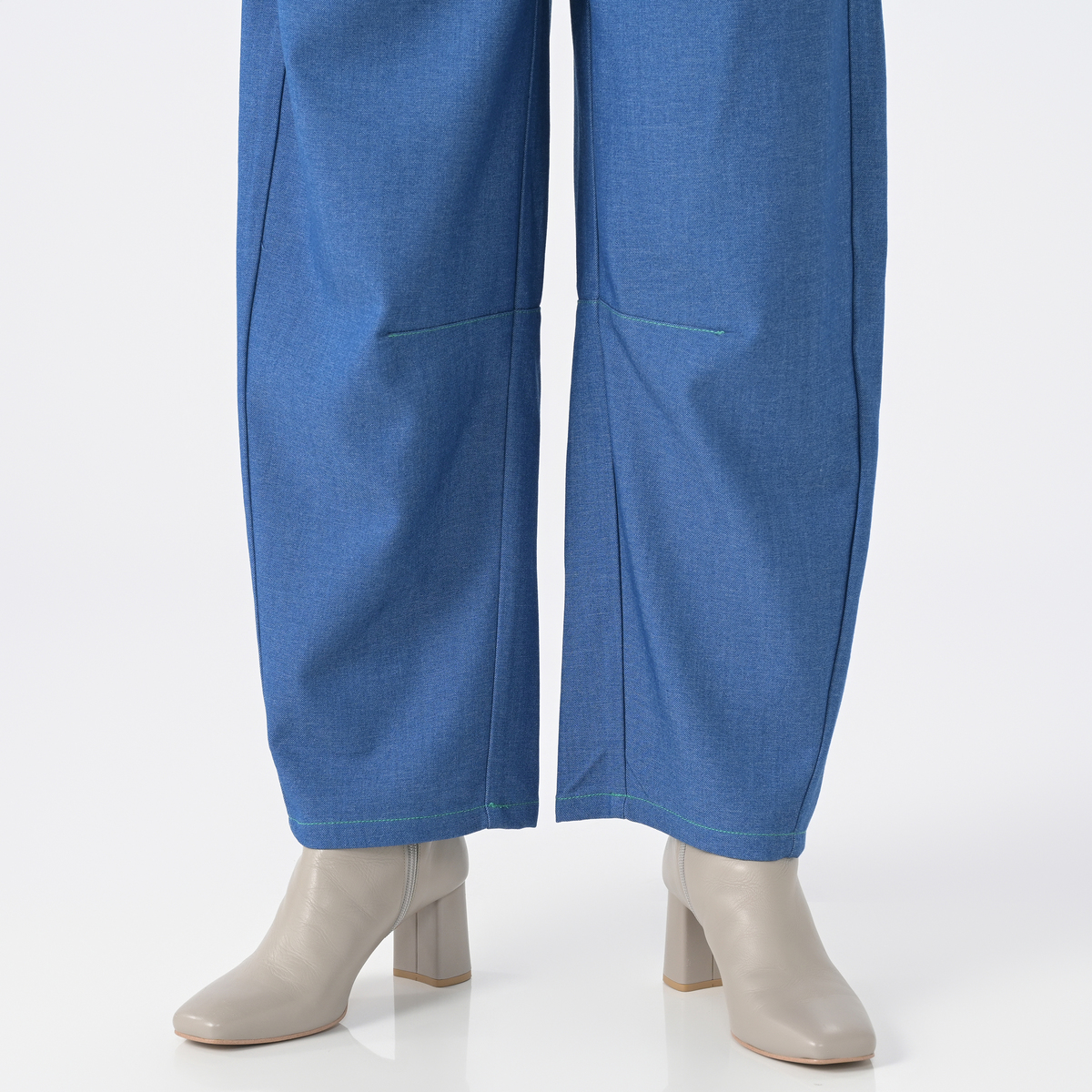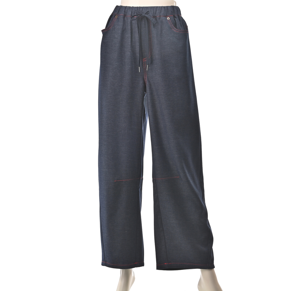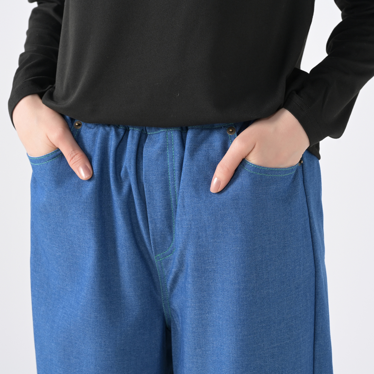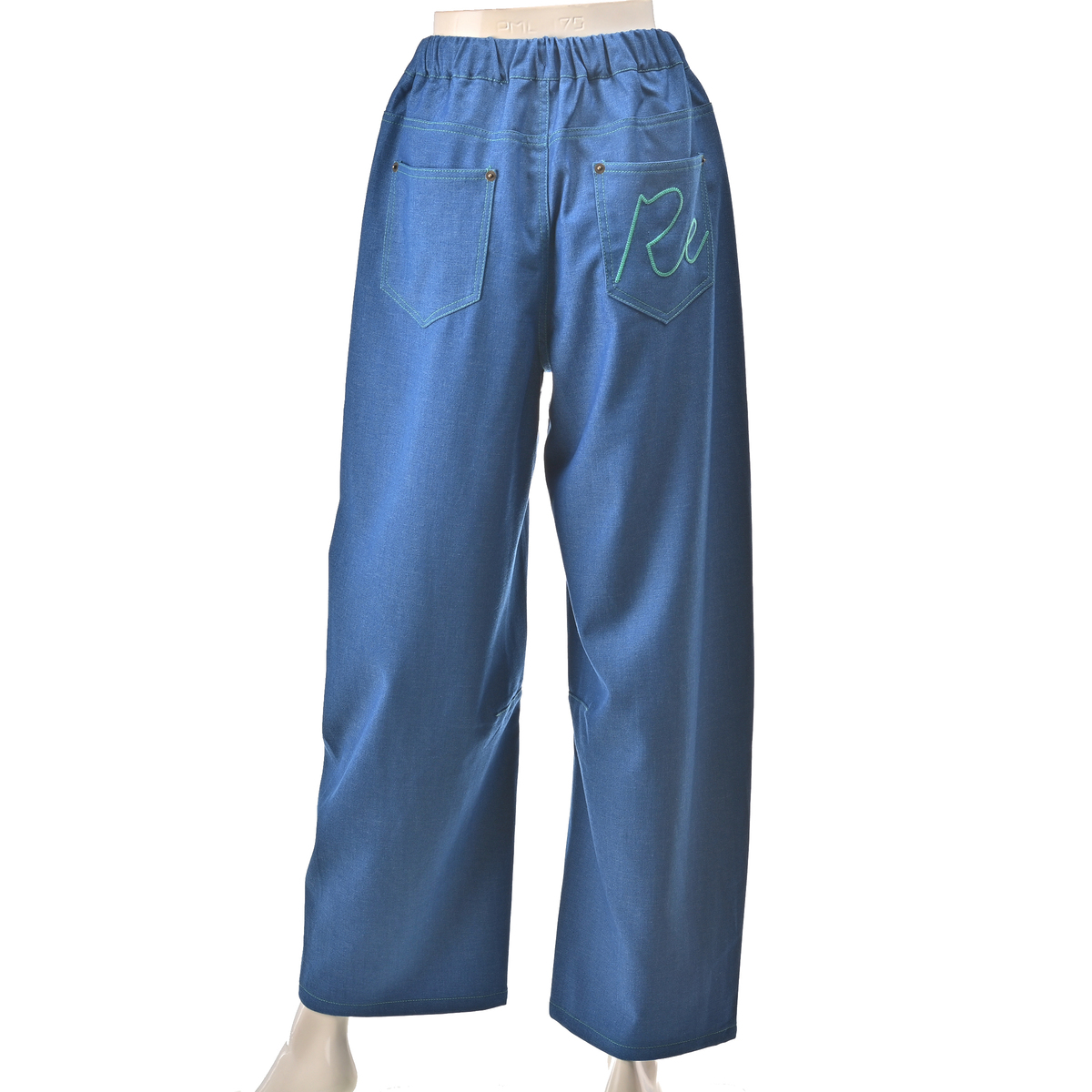 カーヴィシルエットのデニムパンツ。配色ステッチとチェーン刺繍が目を引くデザインです。丸みのあるラインが脚をきれいに見せ、体型カバーも。ウエストは総ゴム仕様で穿き心地よく、トレンド感とこなれ感を両立させています