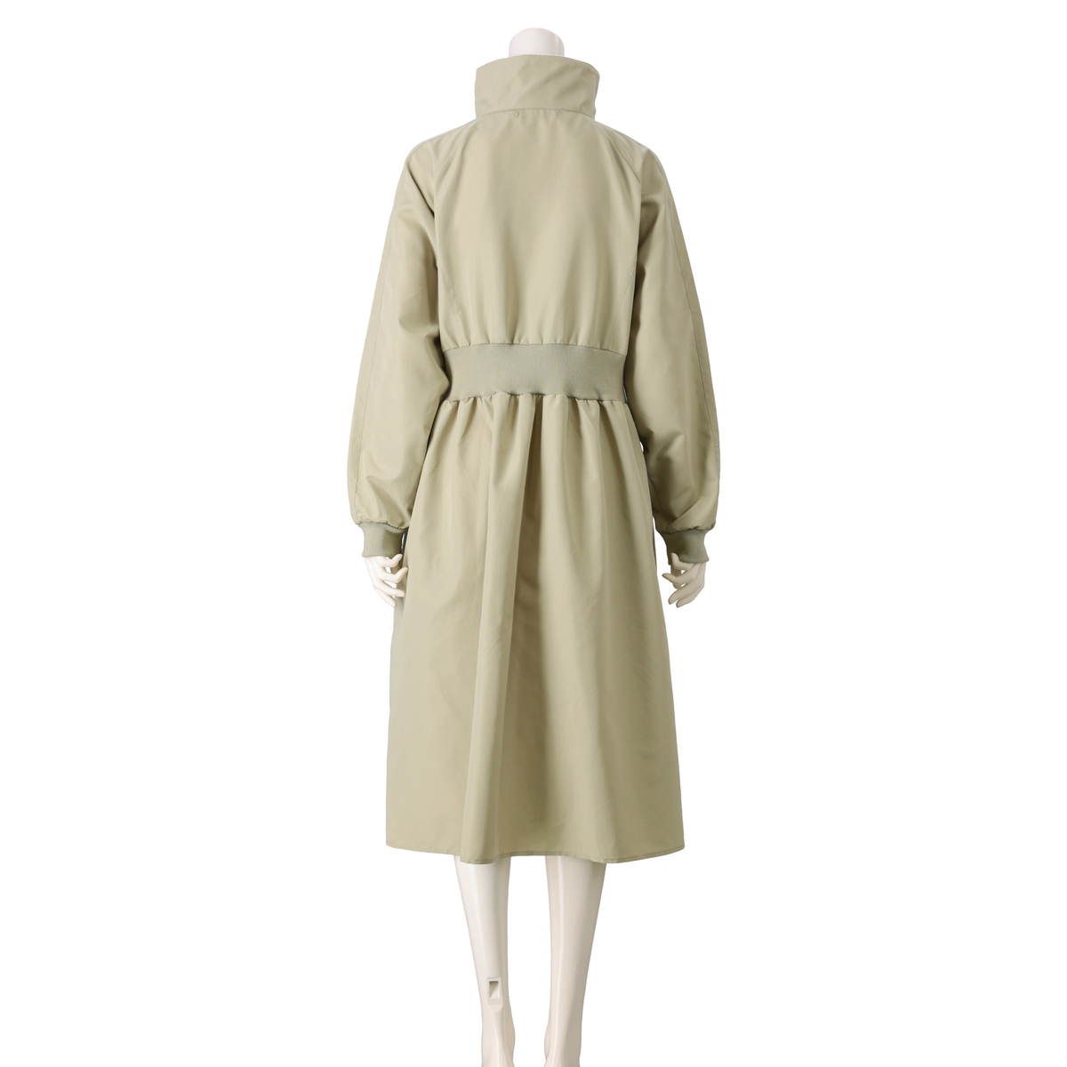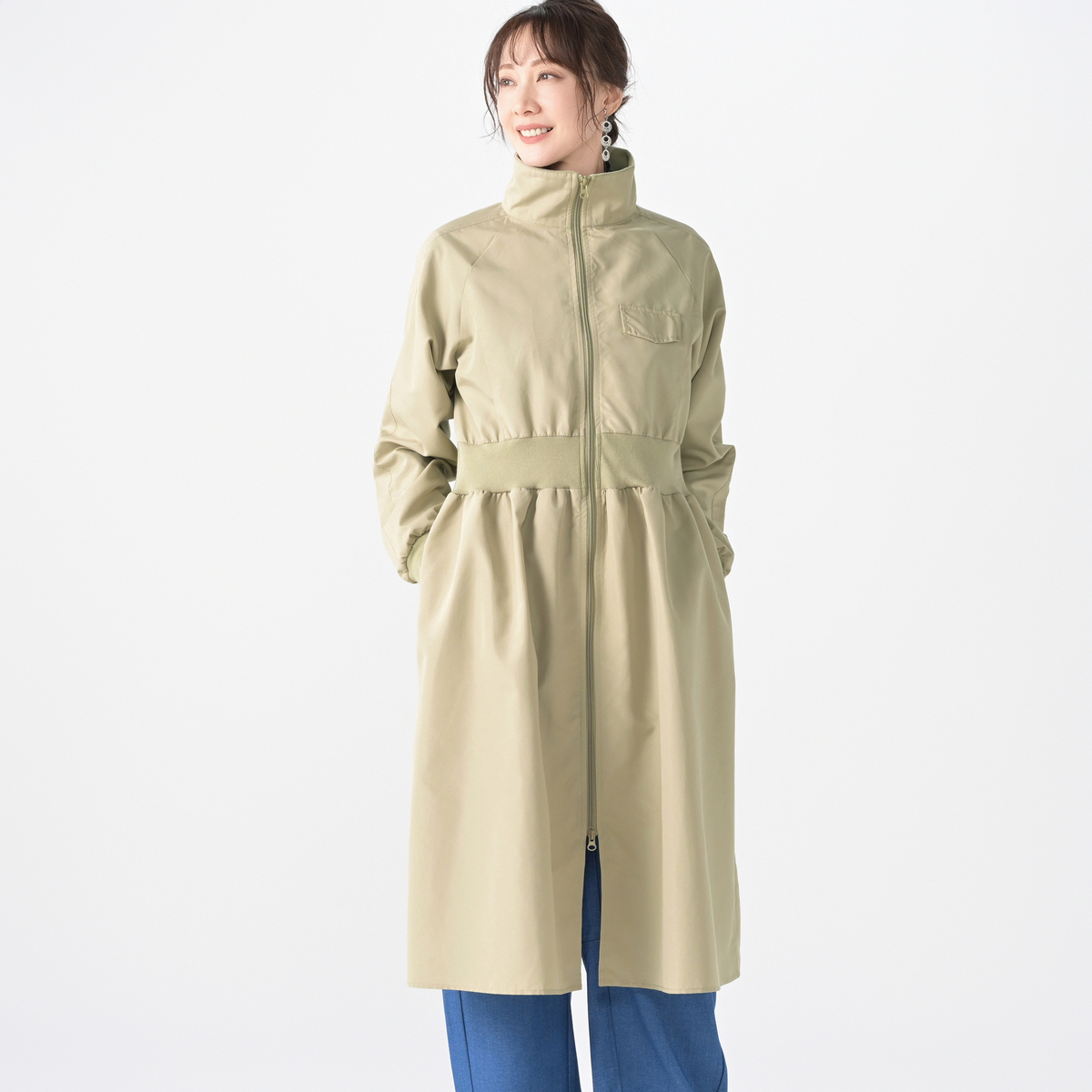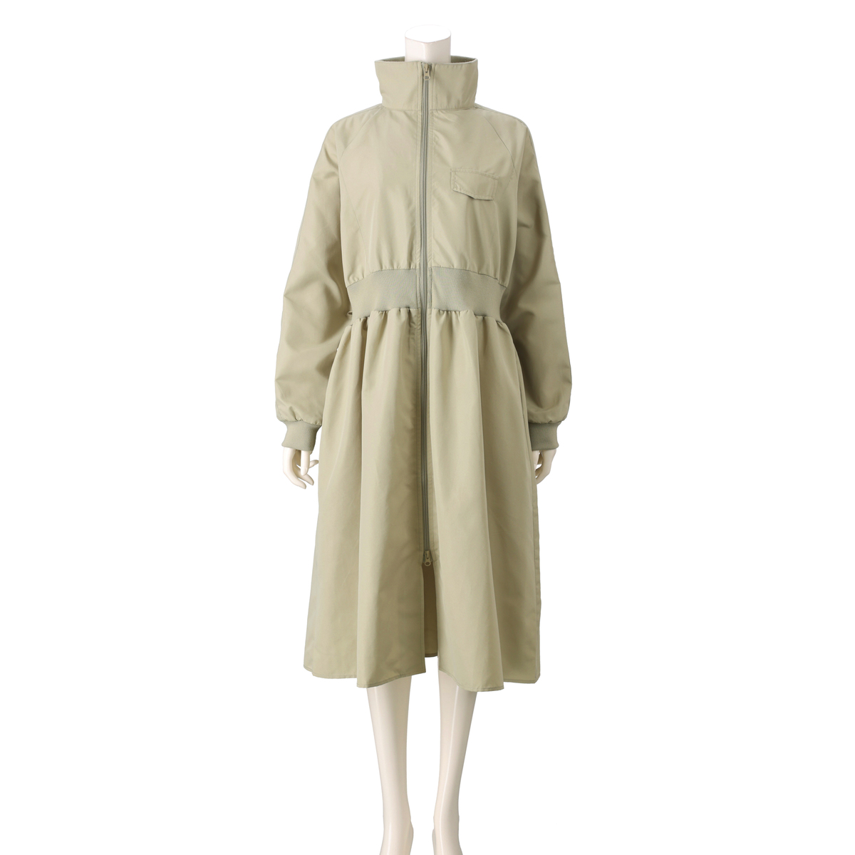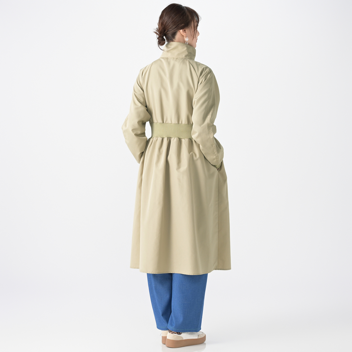 軽やかな着心地のロングコート。異素材切替でメリハリをつくり、本体のピーチタフタと編立リブの組合せがすっきりとした印象を引き立てます。衿裏や袖口、ウエストにリブを集約し、ワントーンでも変化のある表情に。上品なピーチスキン加工の高密度タフタが、落ち着いた雰囲気を添えています