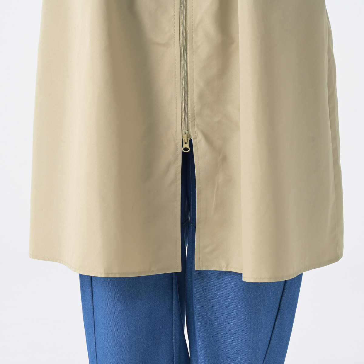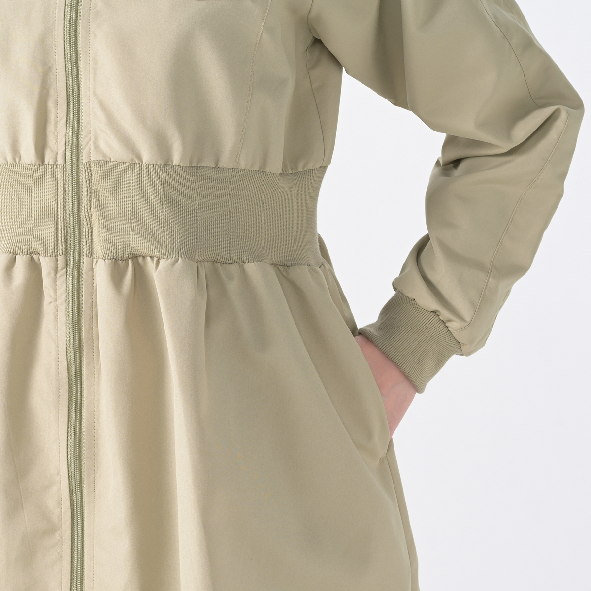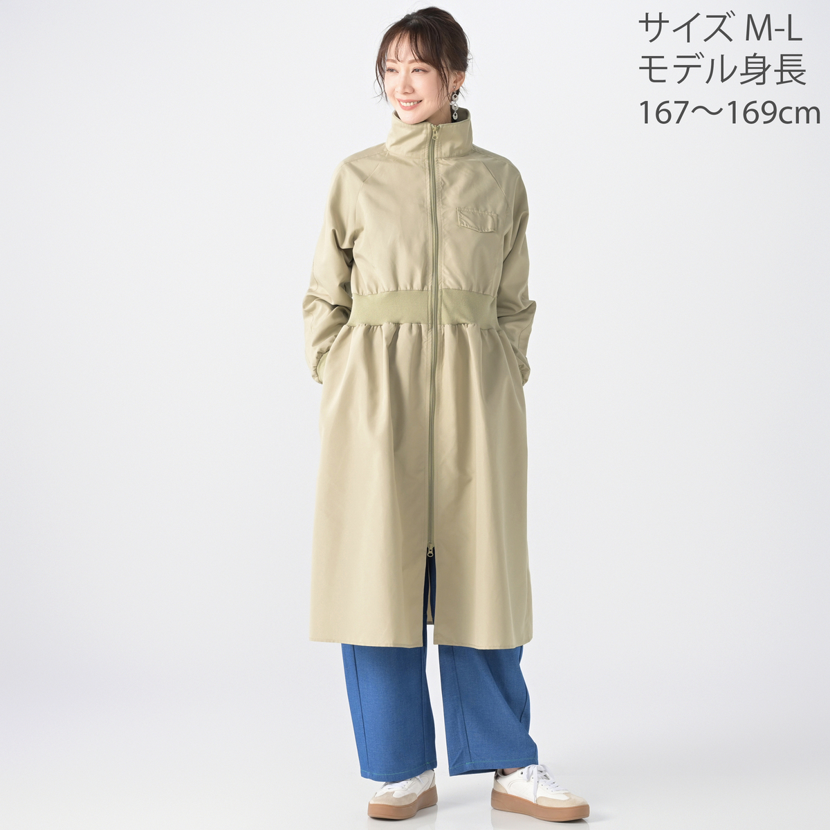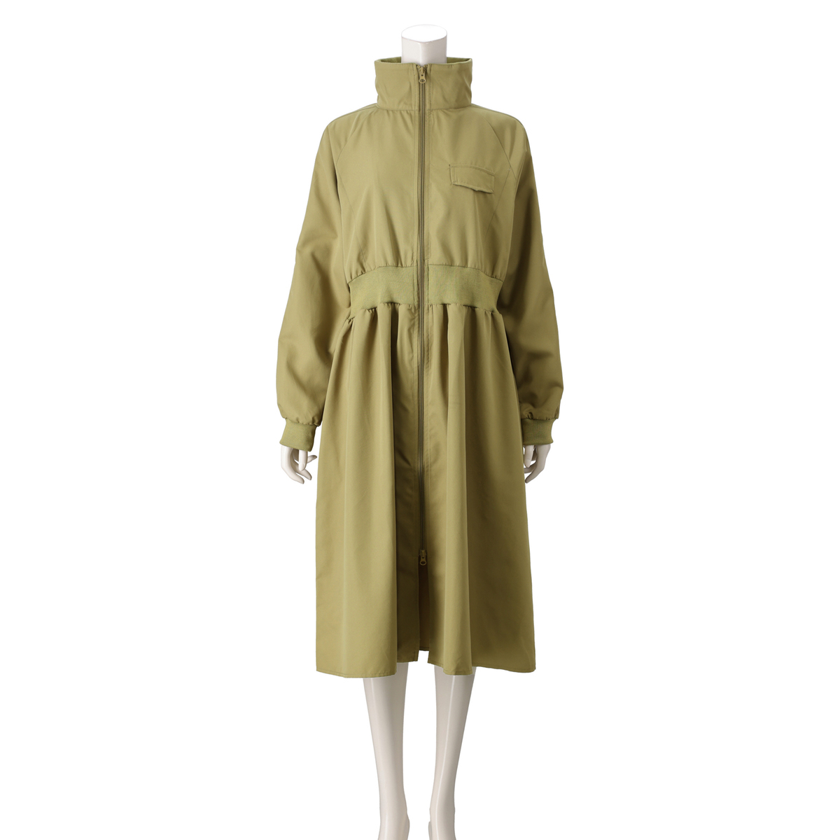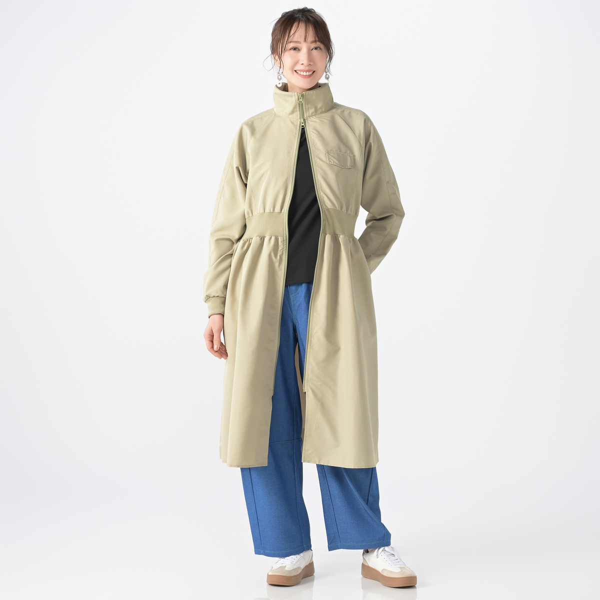 軽やかな着心地のロングコート。異素材切替でメリハリをつくり、本体のピーチタフタと編立リブの組合せがすっきりとした印象を引き立てます。衿裏や袖口、ウエストにリブを集約し、ワントーンでも変化のある表情に。上品なピーチスキン加工の高密度タフタが、落ち着いた雰囲気を添えています