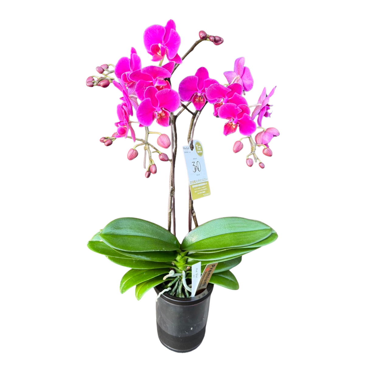 椎名洋ラン園の特選胡蝶蘭。輪が大きく濃いピンクが存在感を放ち、輪の周りが白く縁取られたあまり見ない胡蝶蘭です。リビングに飾るのに丁度よいサイズ感のミディ胡蝶蘭で、贈り物にもおすすめ。ギフトにも適したドレスBOXに入れてお届けします