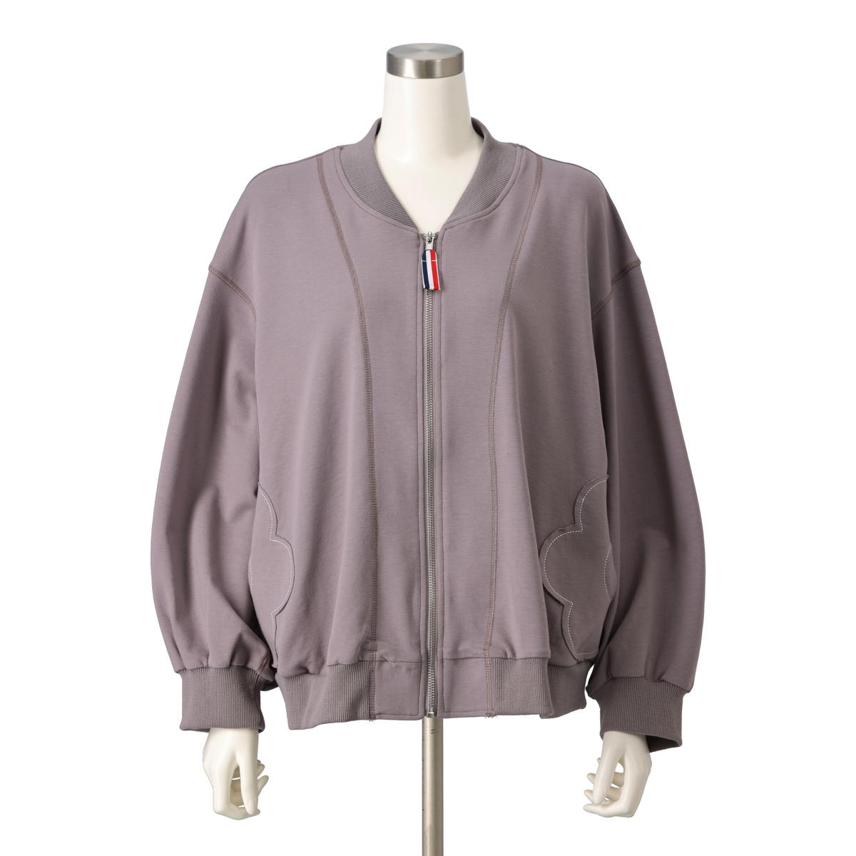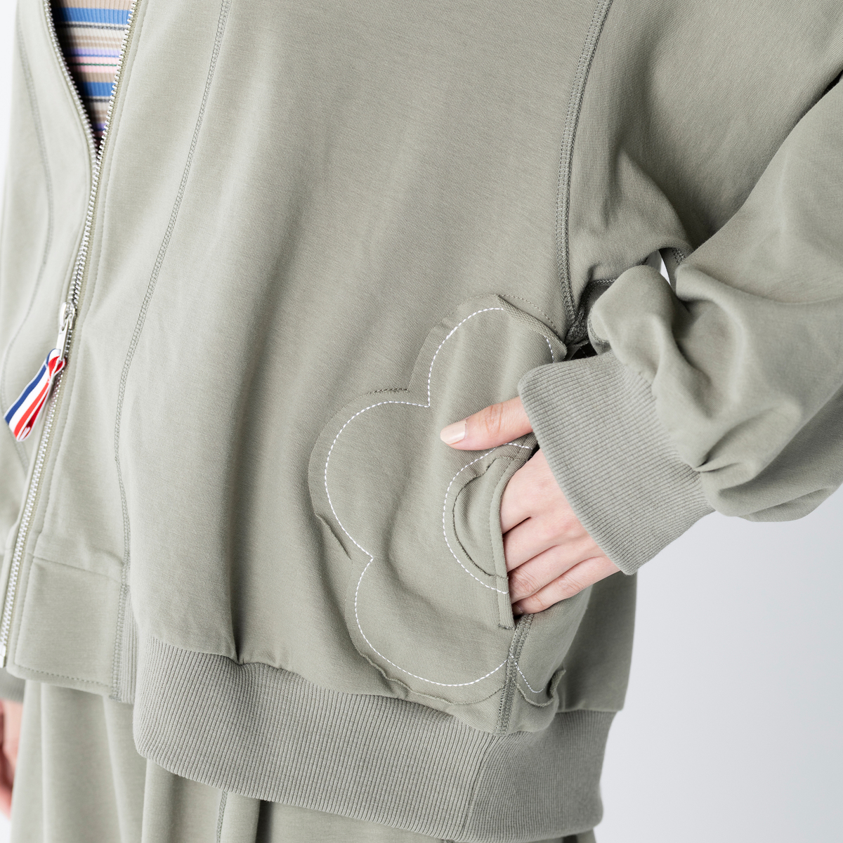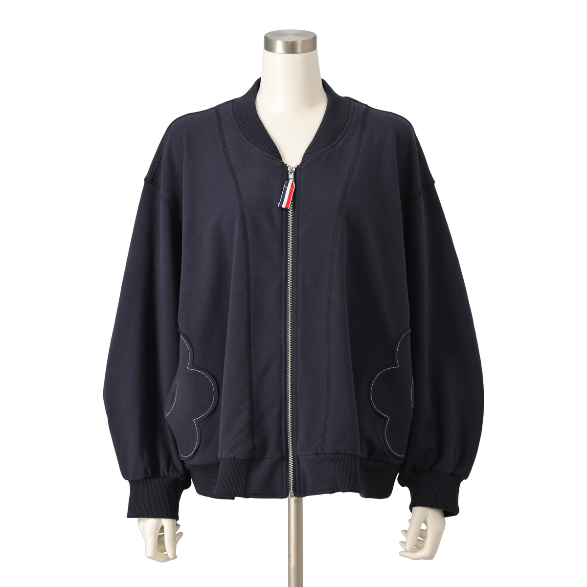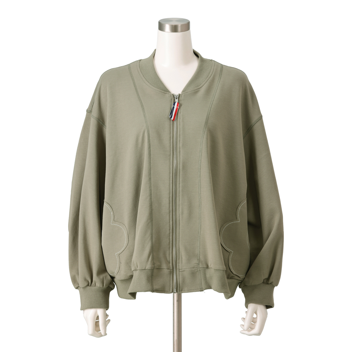 程よい厚みでストレッチ性のある裏毛素材を使用したスタジャンシルエットのブルゾン。正方形に近いバランスのパターンなので若々しく着こなせます。両脇に身頃と共布で花のアップリケを施し、さりげないアクセントになっています