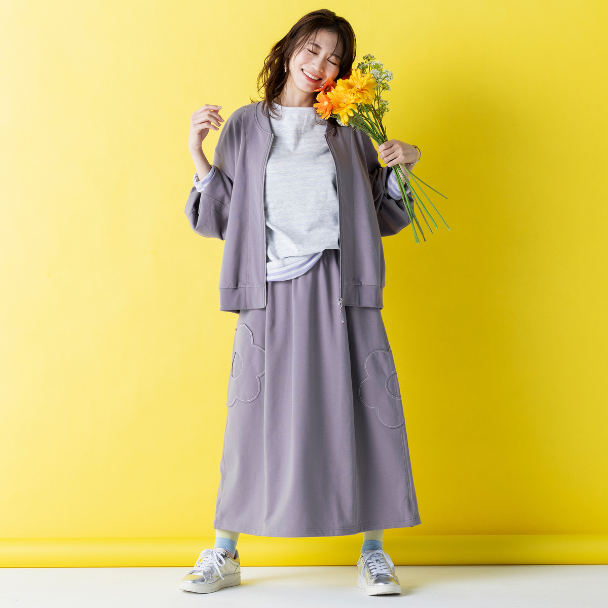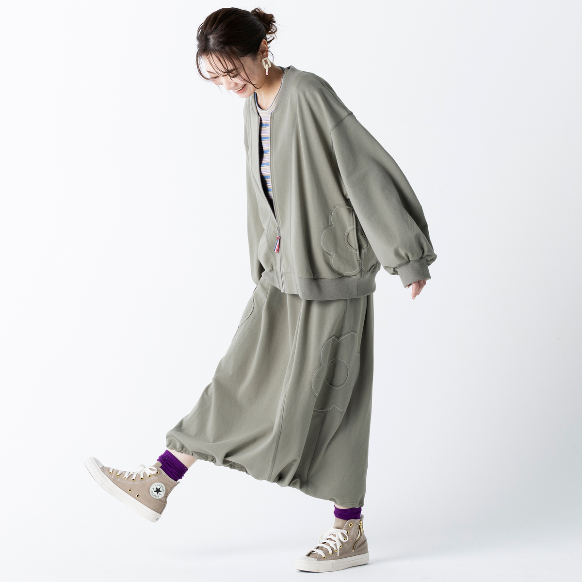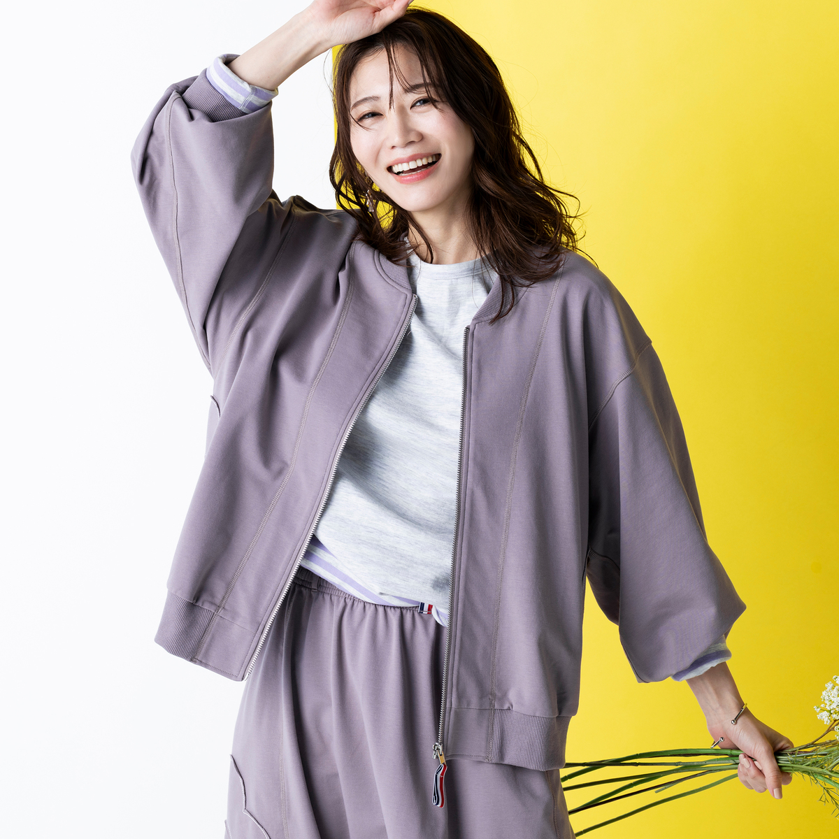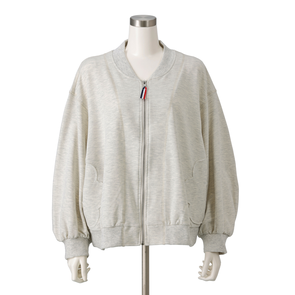 程よい厚みでストレッチ性のある裏毛素材を使用したスタジャンシルエットのブルゾン。正方形に近いバランスのパターンなので若々しく着こなせます。両脇に身頃と共布で花のアップリケを施し、さりげないアクセントになっています