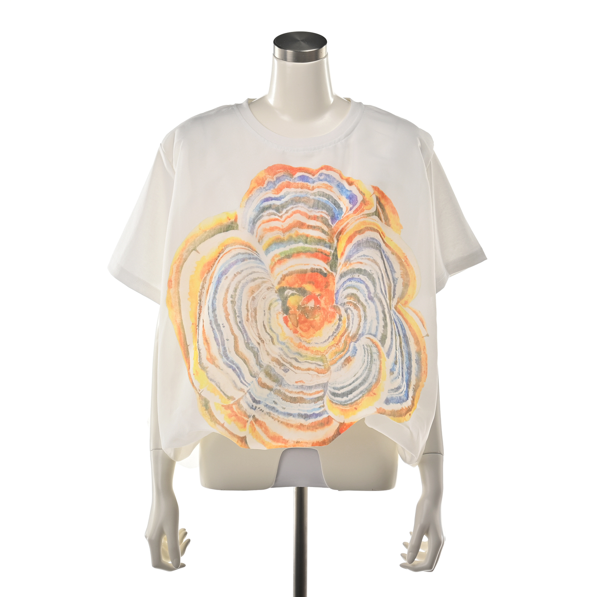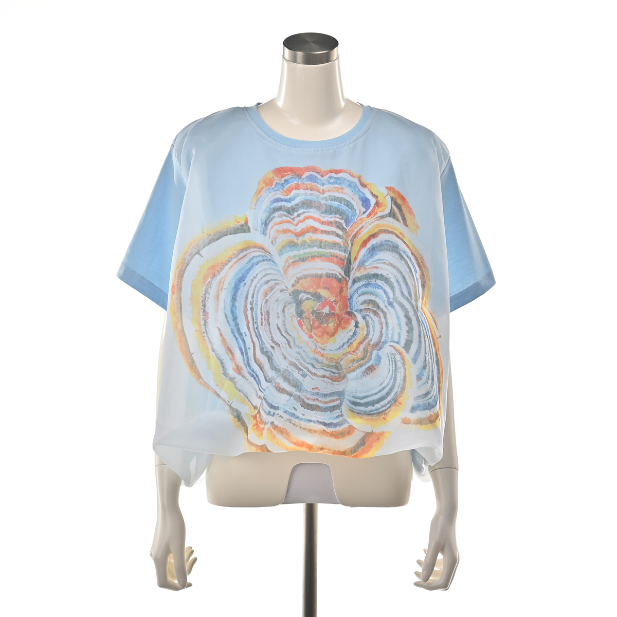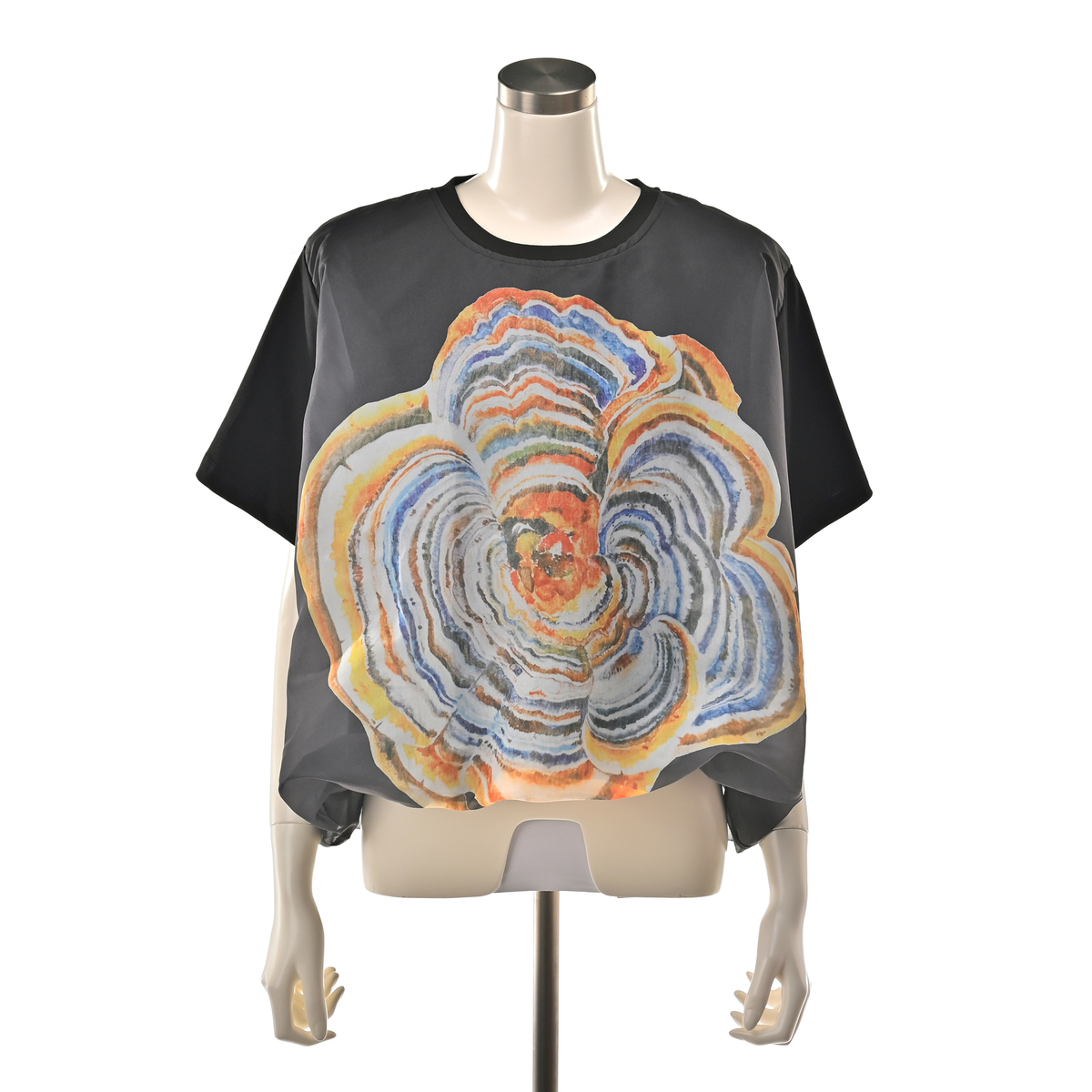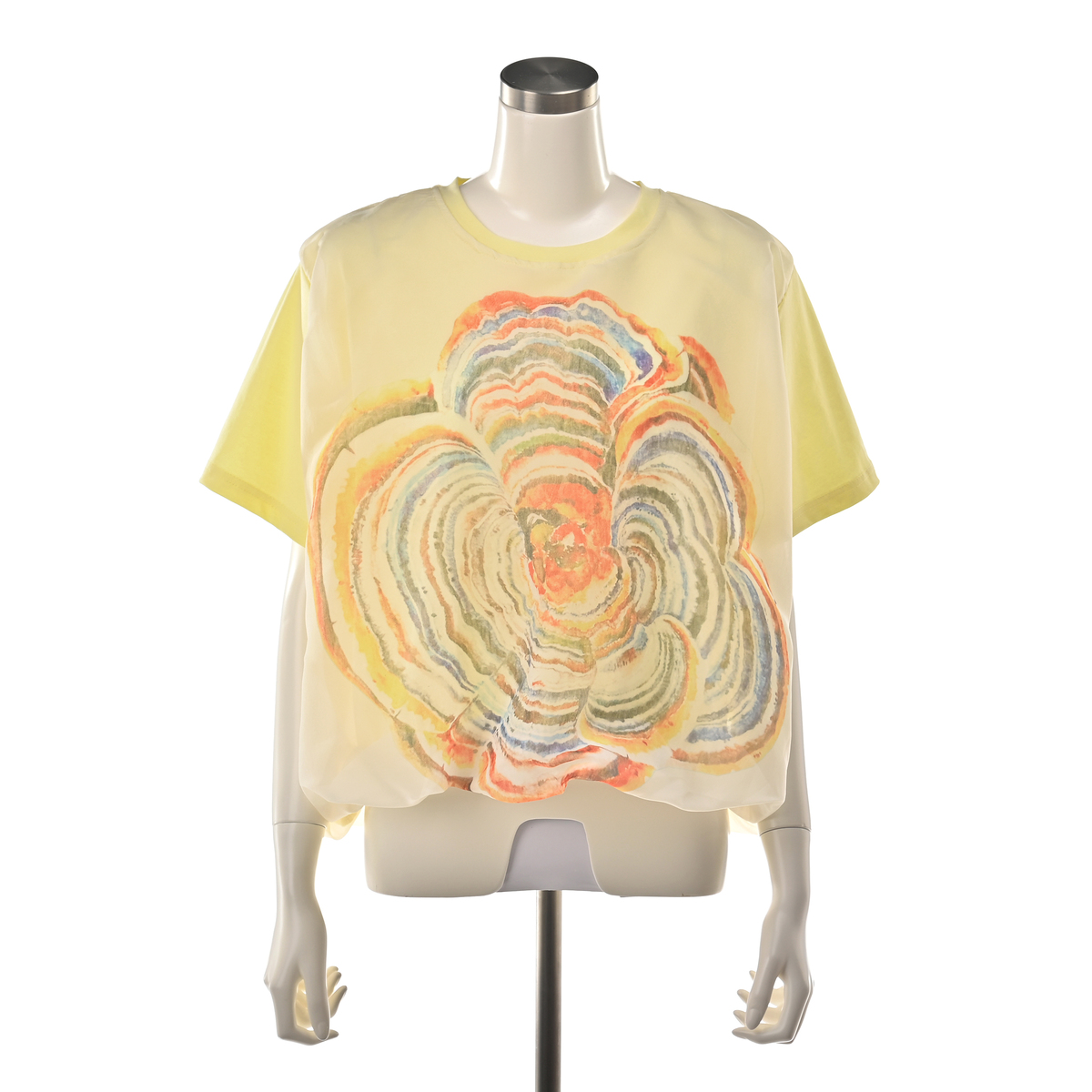 シアー素材にプリントを施したブラウスです。前身頃に大きくあしらったフラワープリントが印象的で、多くの色を使いながらも派手になり過ぎない仕上がり。裾を絞ったコクーンシルエットで、フォルムにほどよい丸みを持たせています