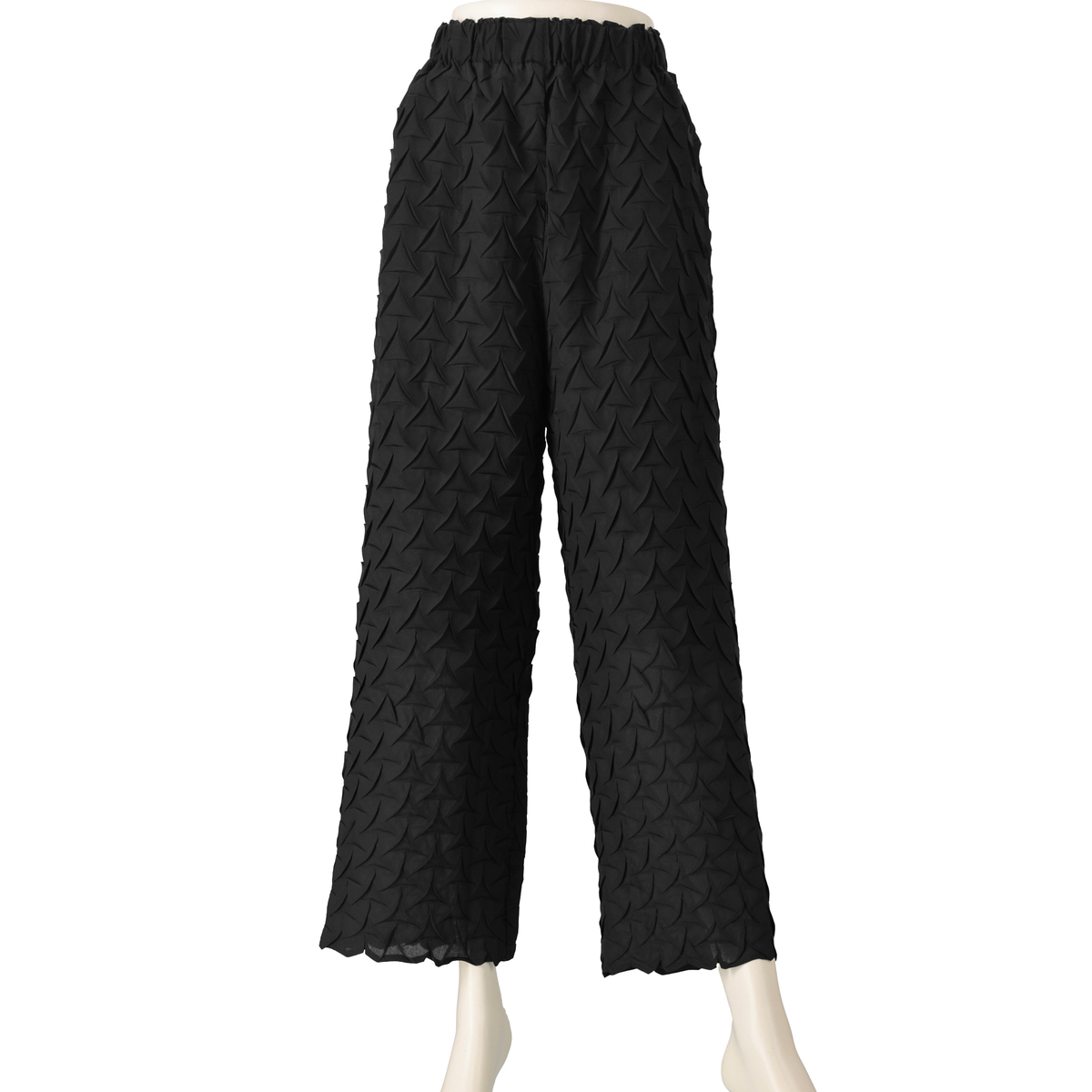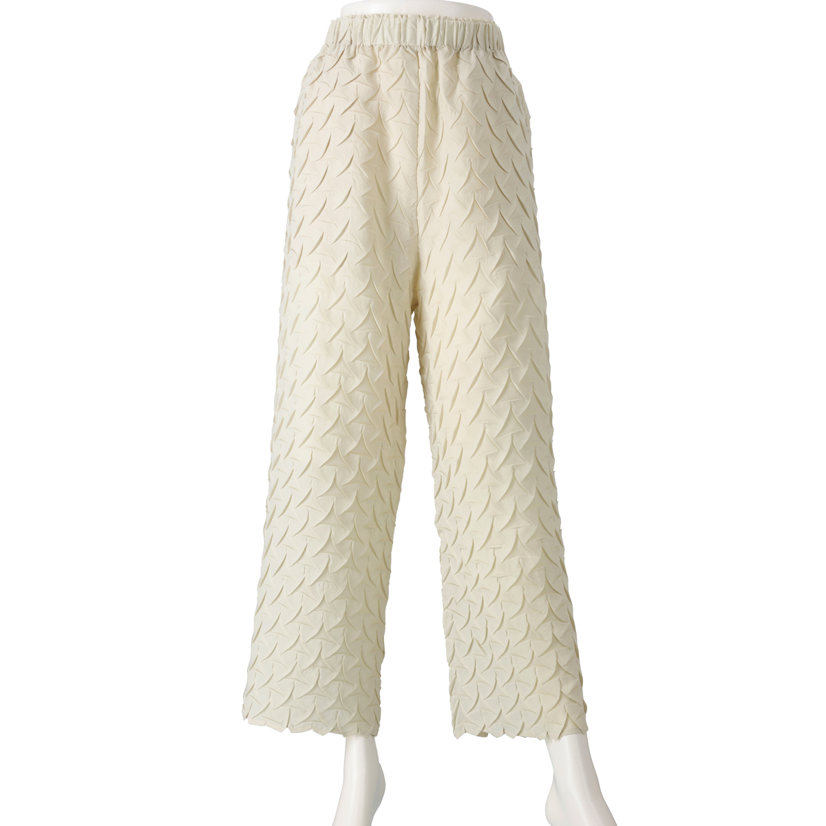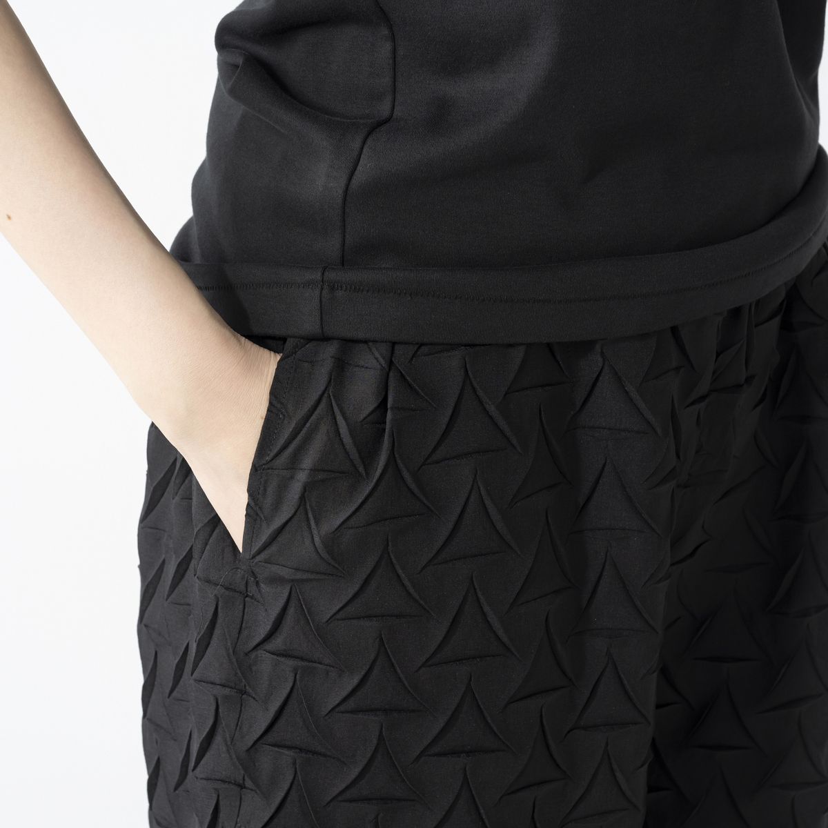 幾何学柄をプリーツで表現した軽やかなパンツ。未加工の布帛生地から半製品を作り、後加工でプリーツを施して完成。さらっとした肌触りと軽快なストレッチ性があり、フォーマルからカジュアルまで幅広く着用できます