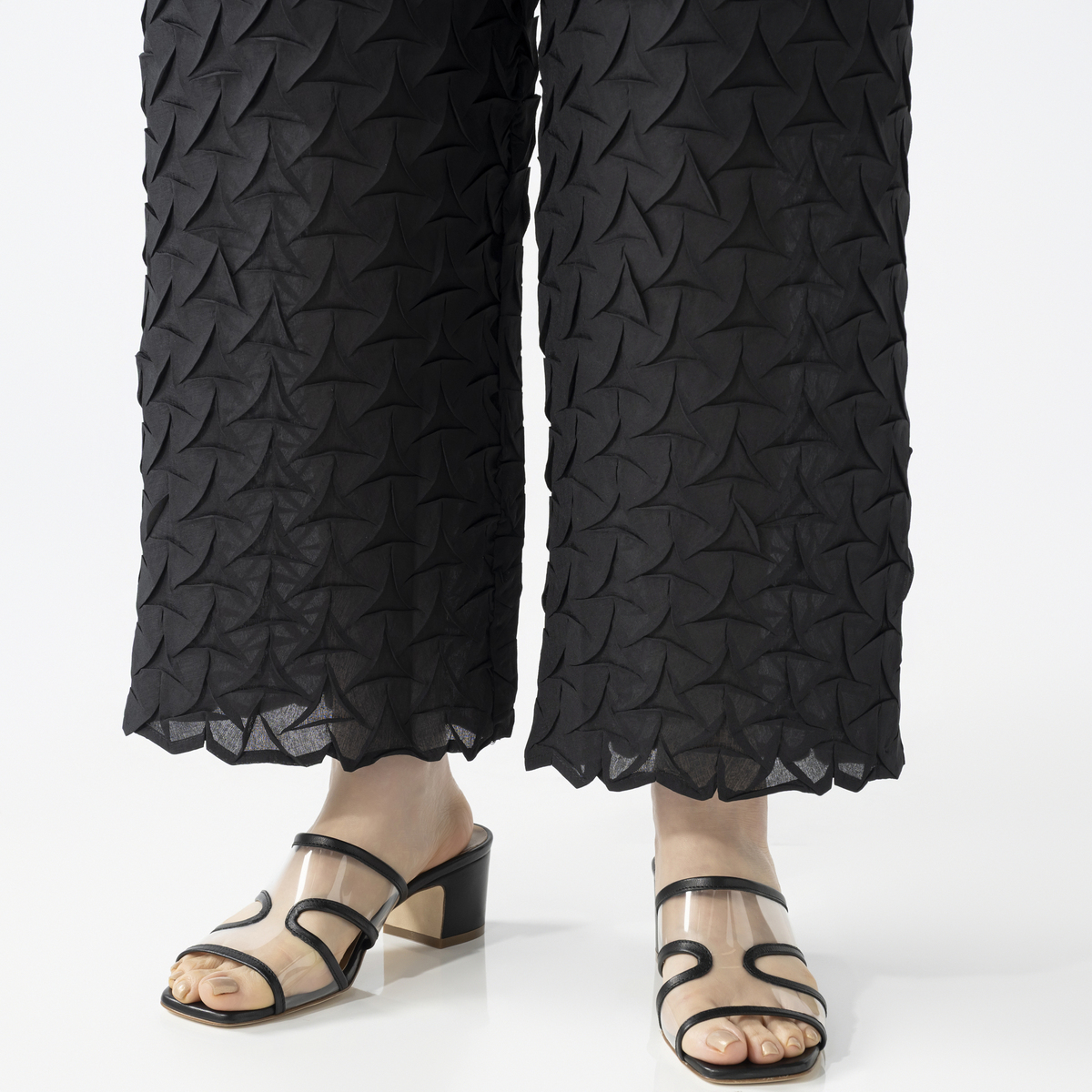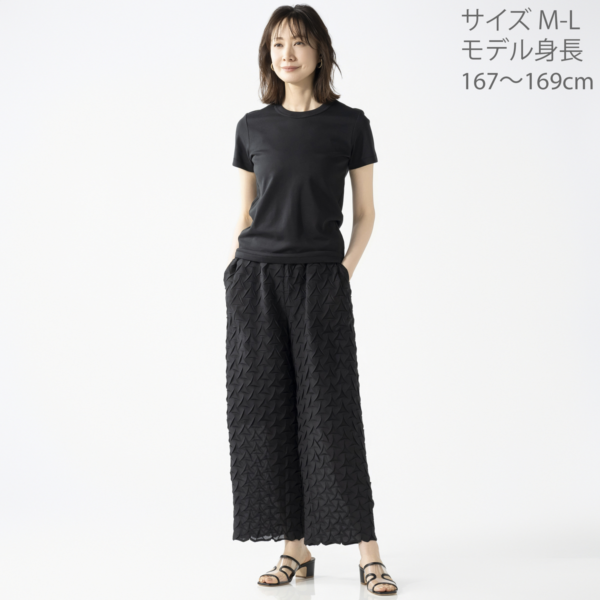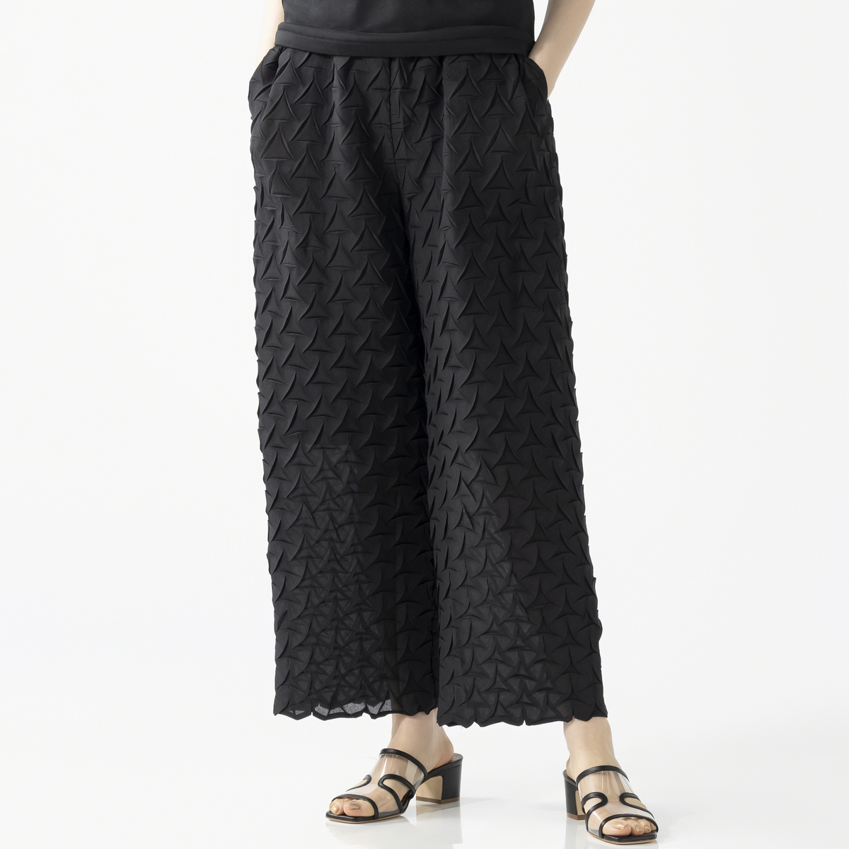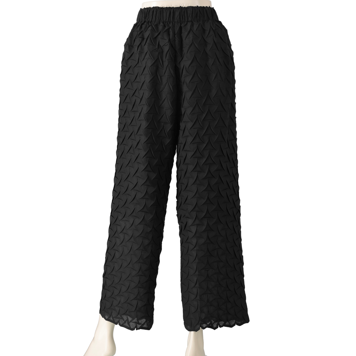 幾何学柄をプリーツで表現した軽やかなパンツ。未加工の布帛生地から半製品を作り、後加工でプリーツを施して完成。さらっとした肌触りと軽快なストレッチ性があり、フォーマルからカジュアルまで幅広く着用できます