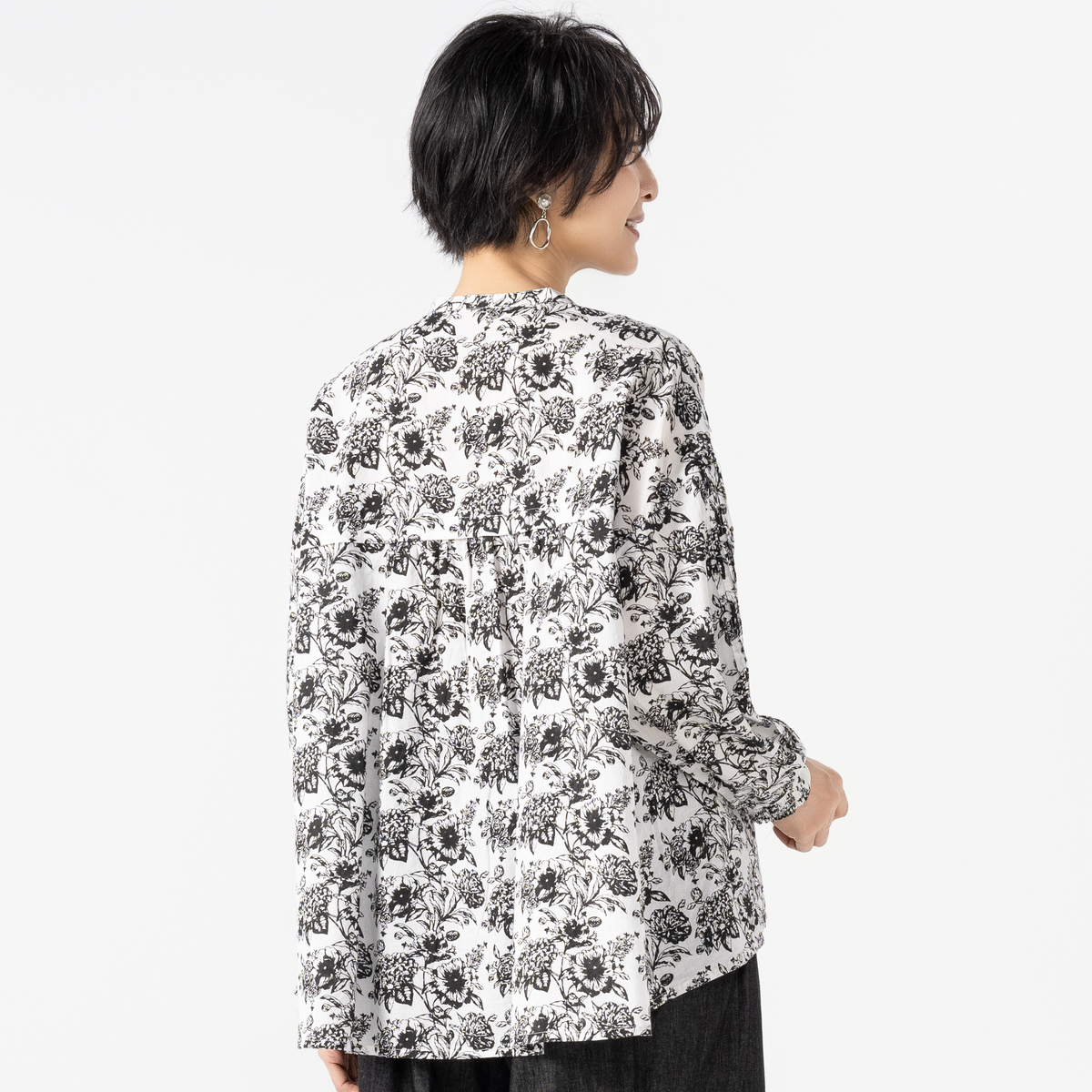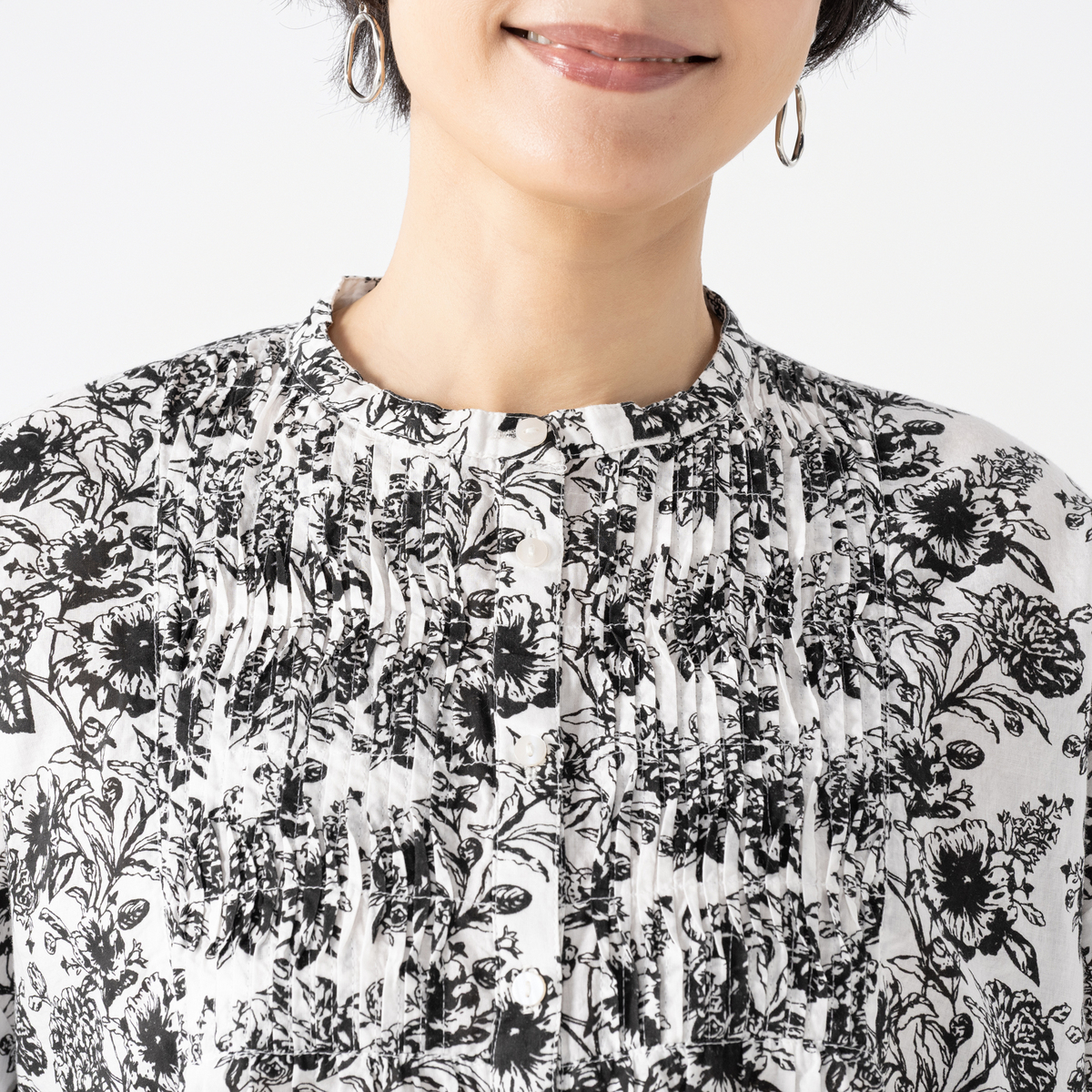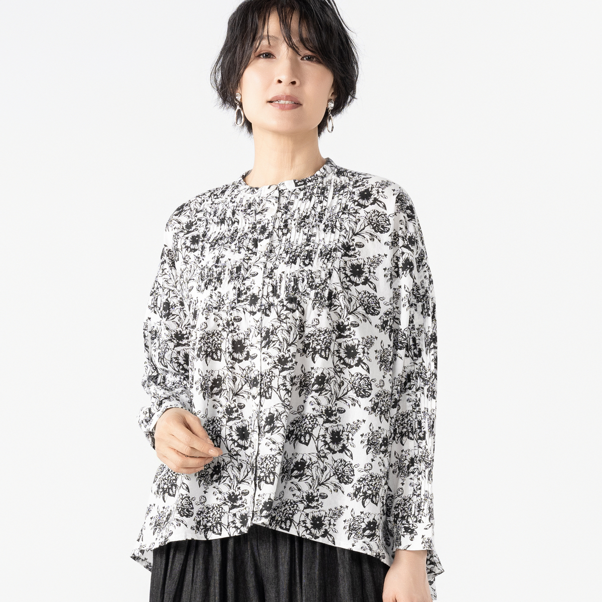 胸元にあしらった波状のピンタックが印象的なブラウス。規則的でありながら揺らぎを感じさせるラインが、やさしい存在感を放ちます。背面には切替とギャザーを施し、シンプルな中にも奥行きのあるシルエットに。スタンドカラーと前開き仕様で、羽織としても着用できます。袖口はシャーリングカフス仕様で、袖のボリューム感を調整できるのもポイントです