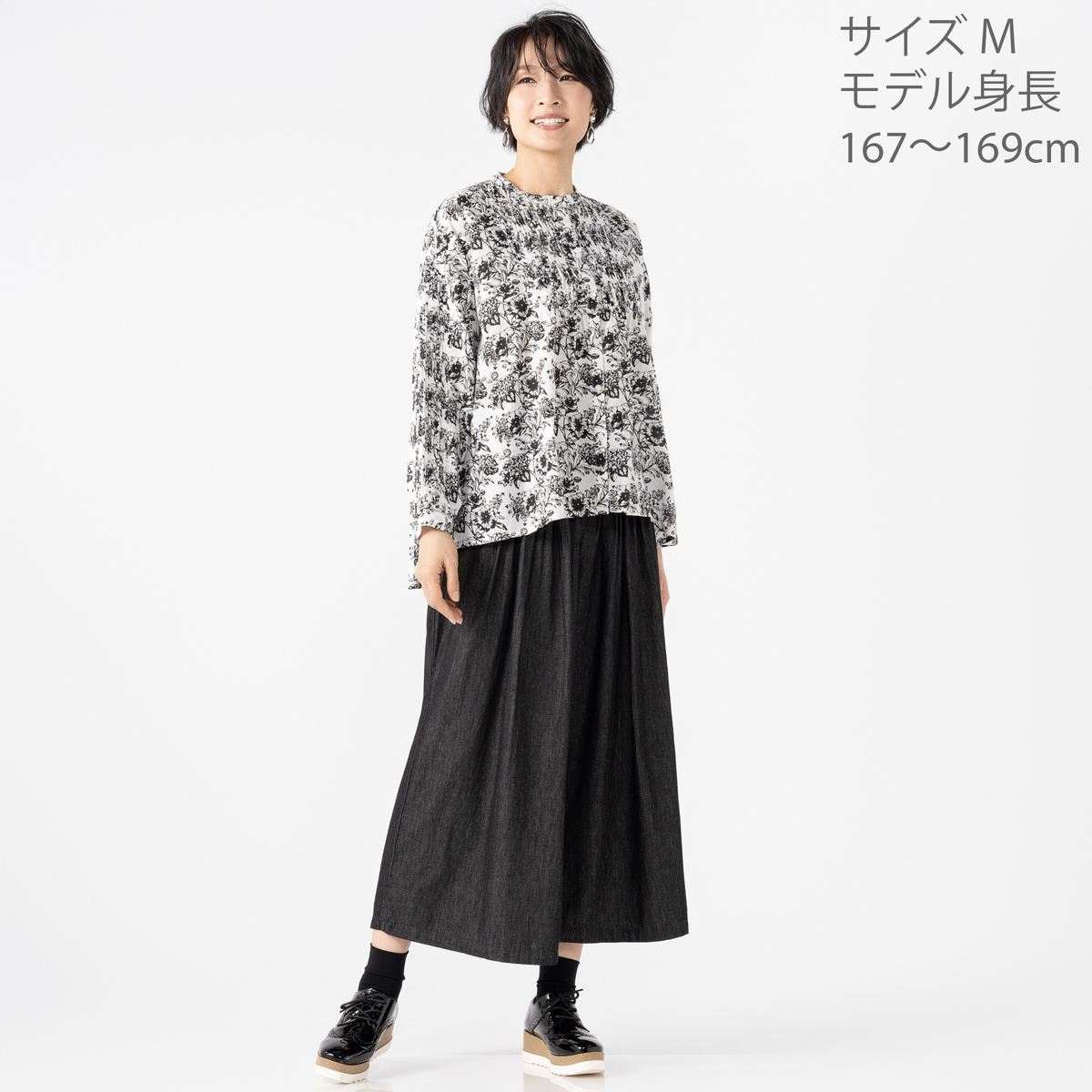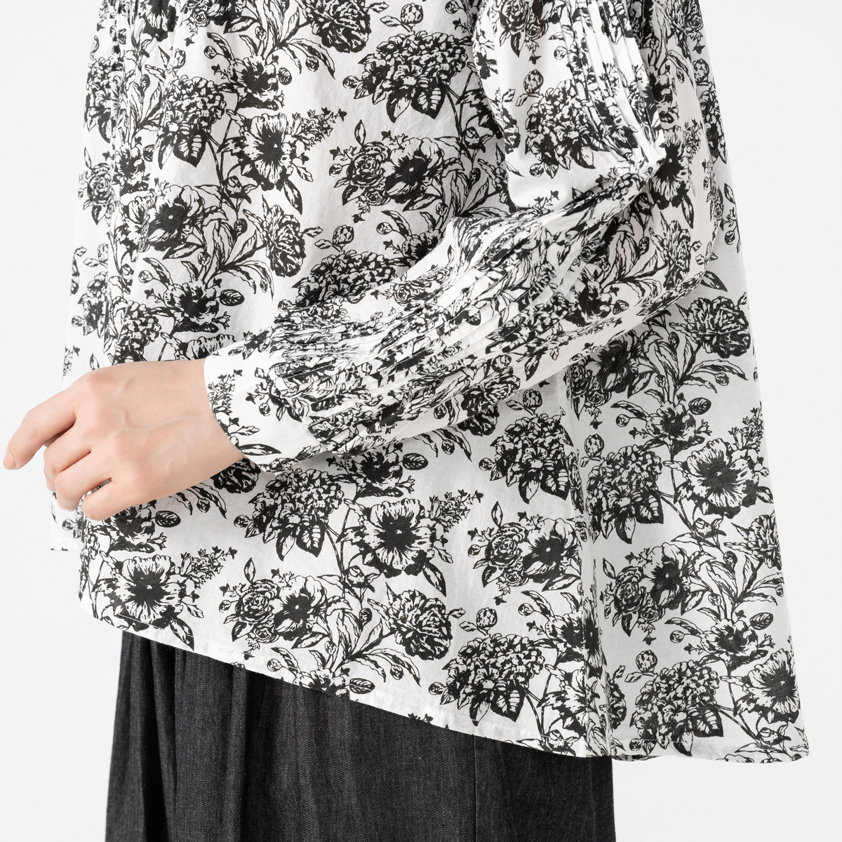 やわらかくナチュラルな風合いのコットン素材を使用。ピンタックやギャザーを入れても重たく見えず、自然な落ち感と軽やかな着心地を実現。肌にやさしくなじみ、季節の変わり目にも心地よく着用できる素材感が魅力です