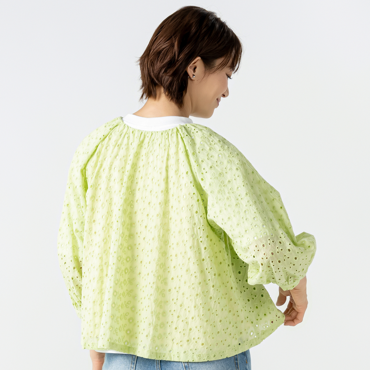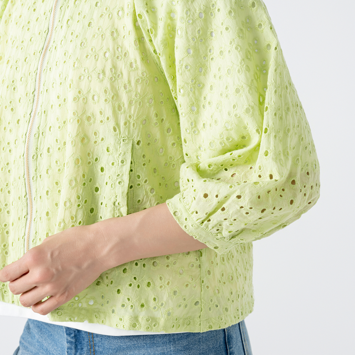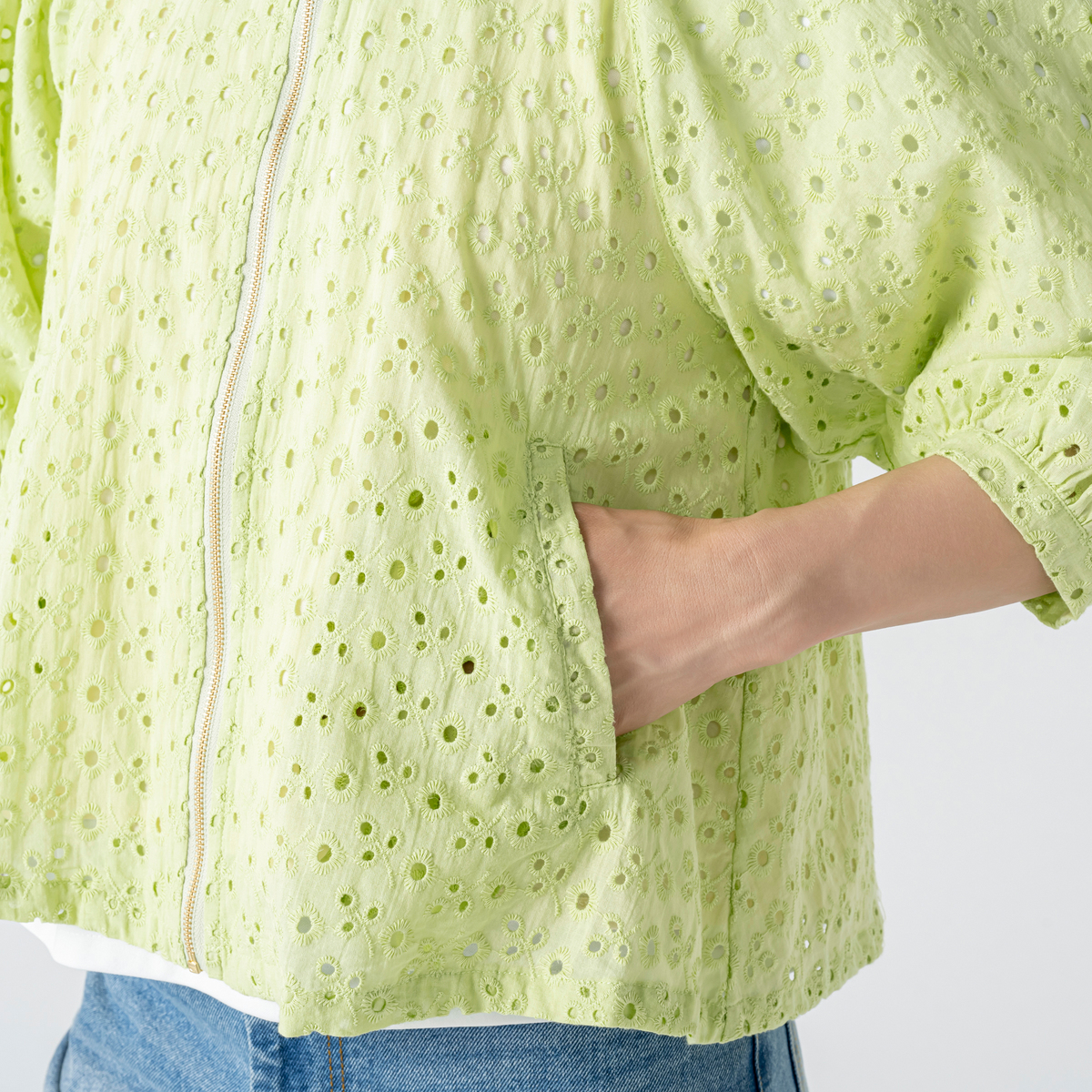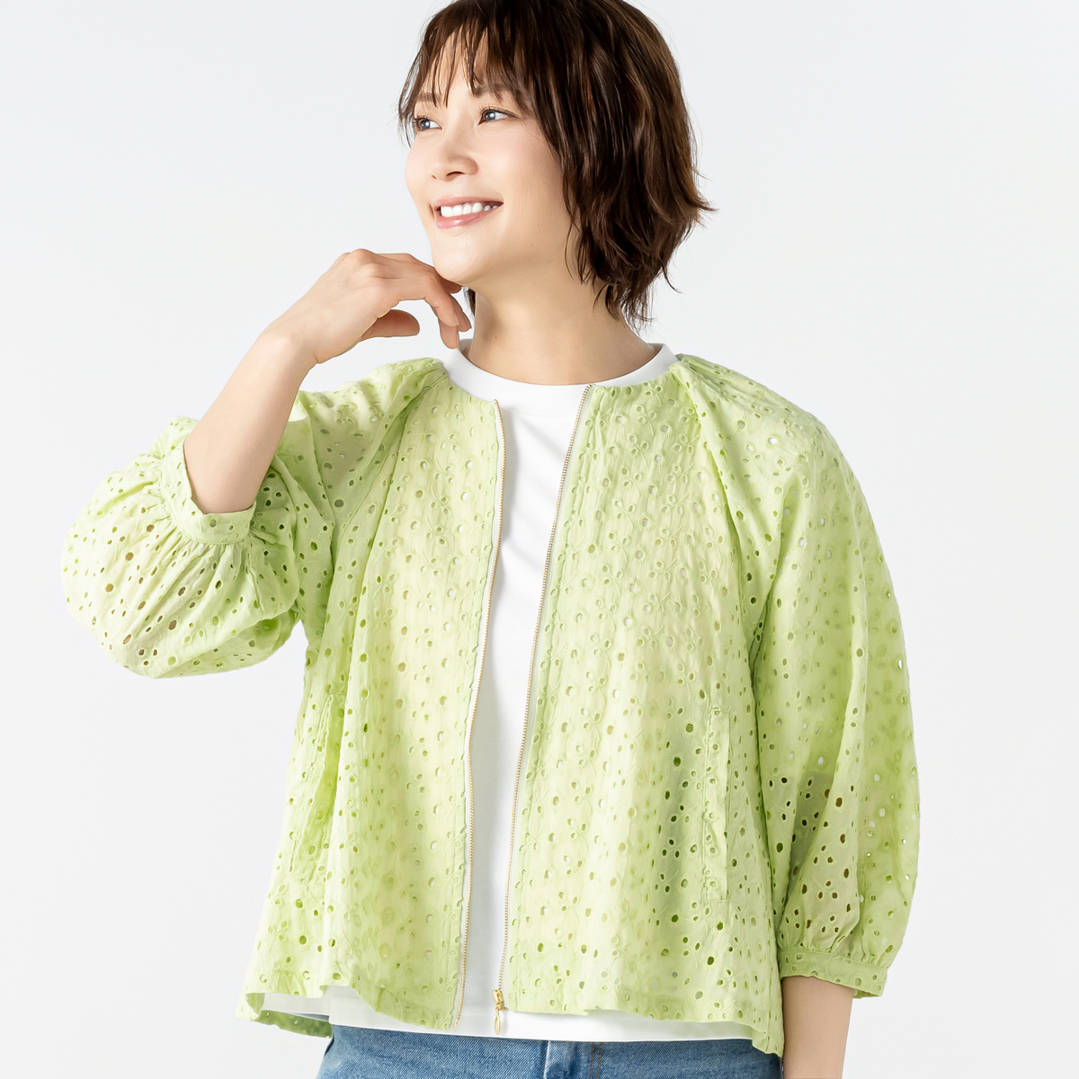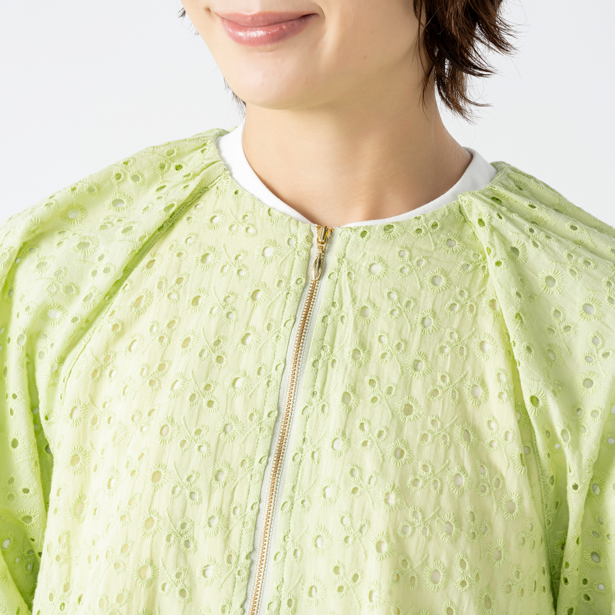 ふんわりとした袖が印象的な刺繍レースブルゾン。エニワイズ加工により繊維中に油脂分を含み、しっとりとなめらかな風合いを感じる着心地です。上品なレースの表情が着こなしに軽やかさを添え、羽織るだけで柔らかなニュアンスが生まれます