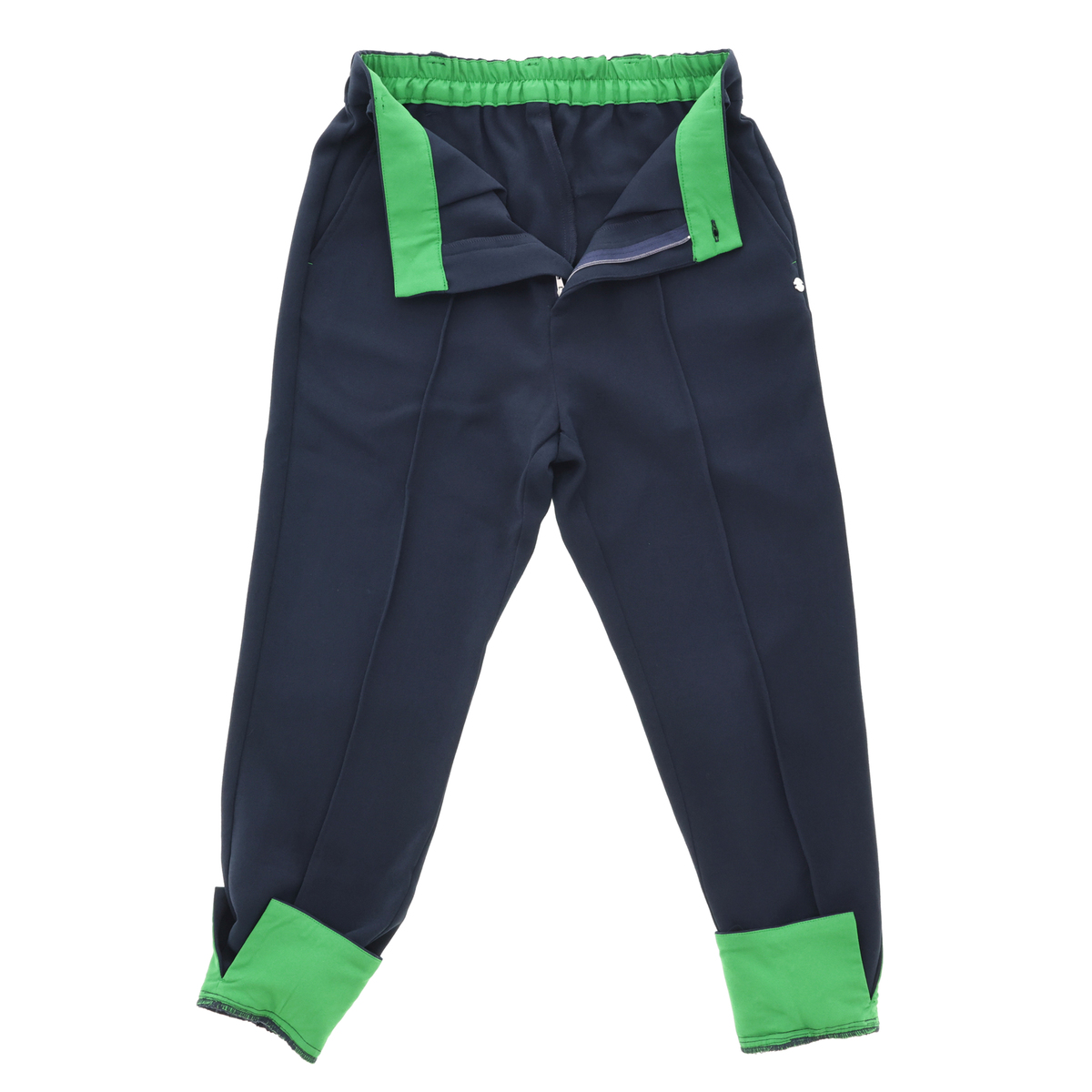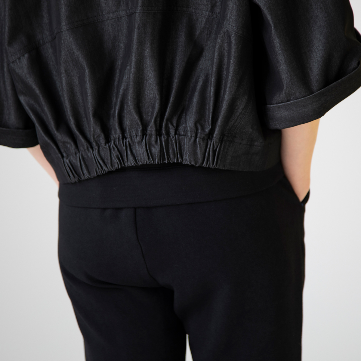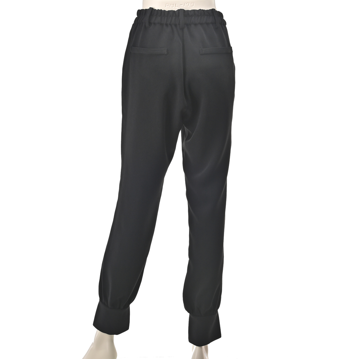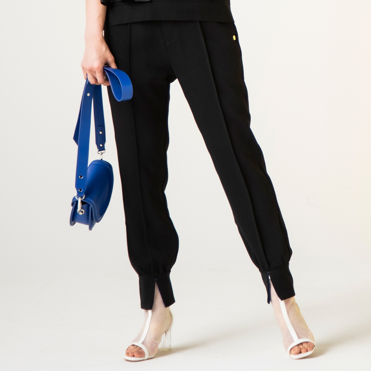 ジョグパンツを直線的なフォルムで構成することで、穿いた瞬間に“きちんとした印象”に。ウエストは後ろゴムで快適、前はフラットに整います。ヒップから裾までシャープなラインが脚をまっすぐ長く演出。テーラードパンツのような端正さを感じさせます