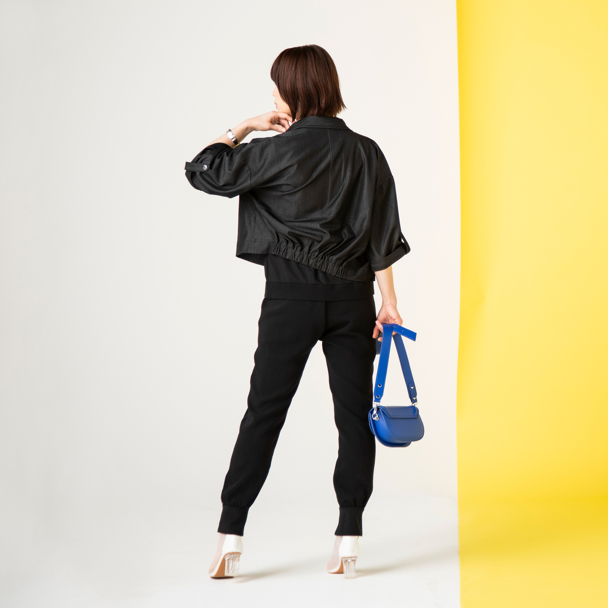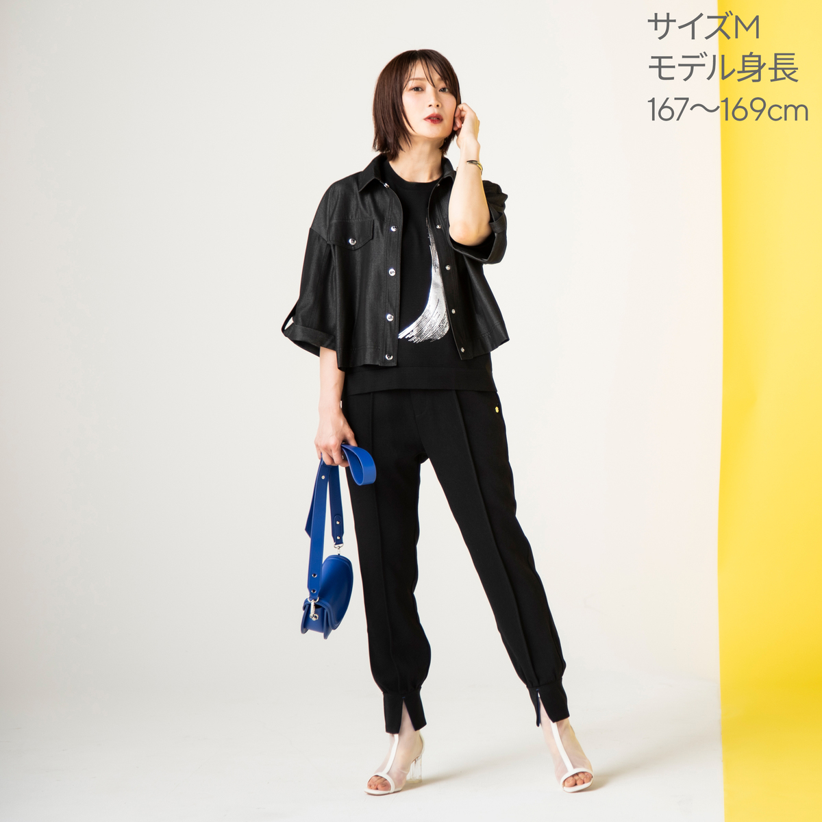 ベルスリーブにターンバック仕様を組合せ、オリジナルドットボタンで袖に表情をプラス。後ろ裾のゴムが背中のラインを自然に整え、後ろから見ても洗練された印象にまとめます
