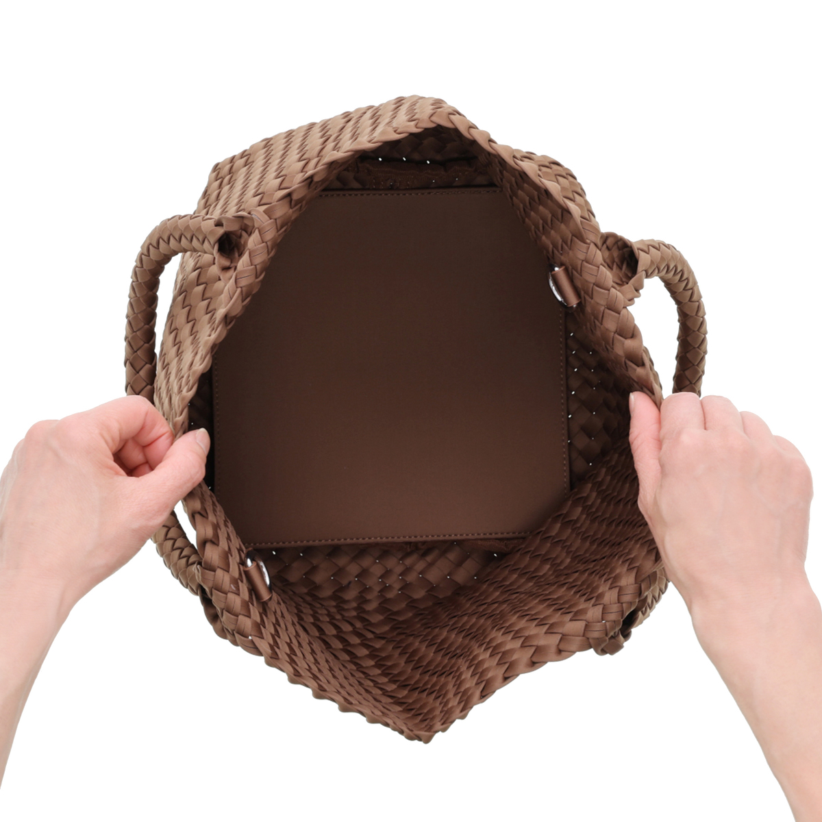 三種類の太さの違う紐を用い、ハンドルまで一体で手編みしたバッグ。統一感と温かみのあるデザインが魅力です。内側からも外側からも両面メッシュに見えるきれいな仕上がりで、メッシュ紐が2重構造のため、強度も上がります
