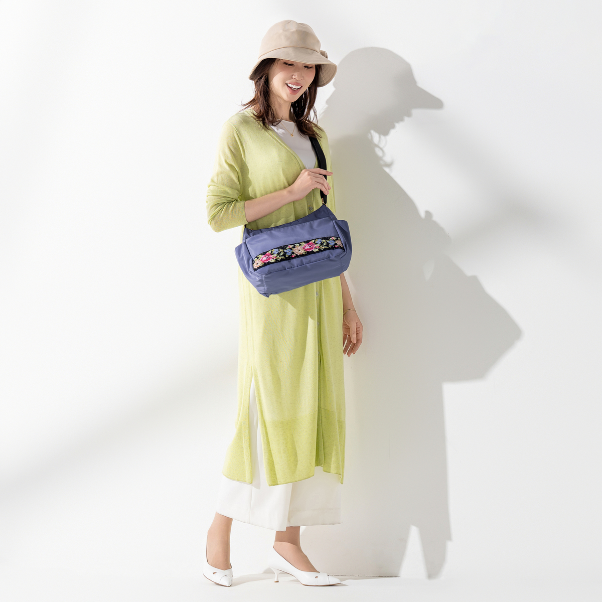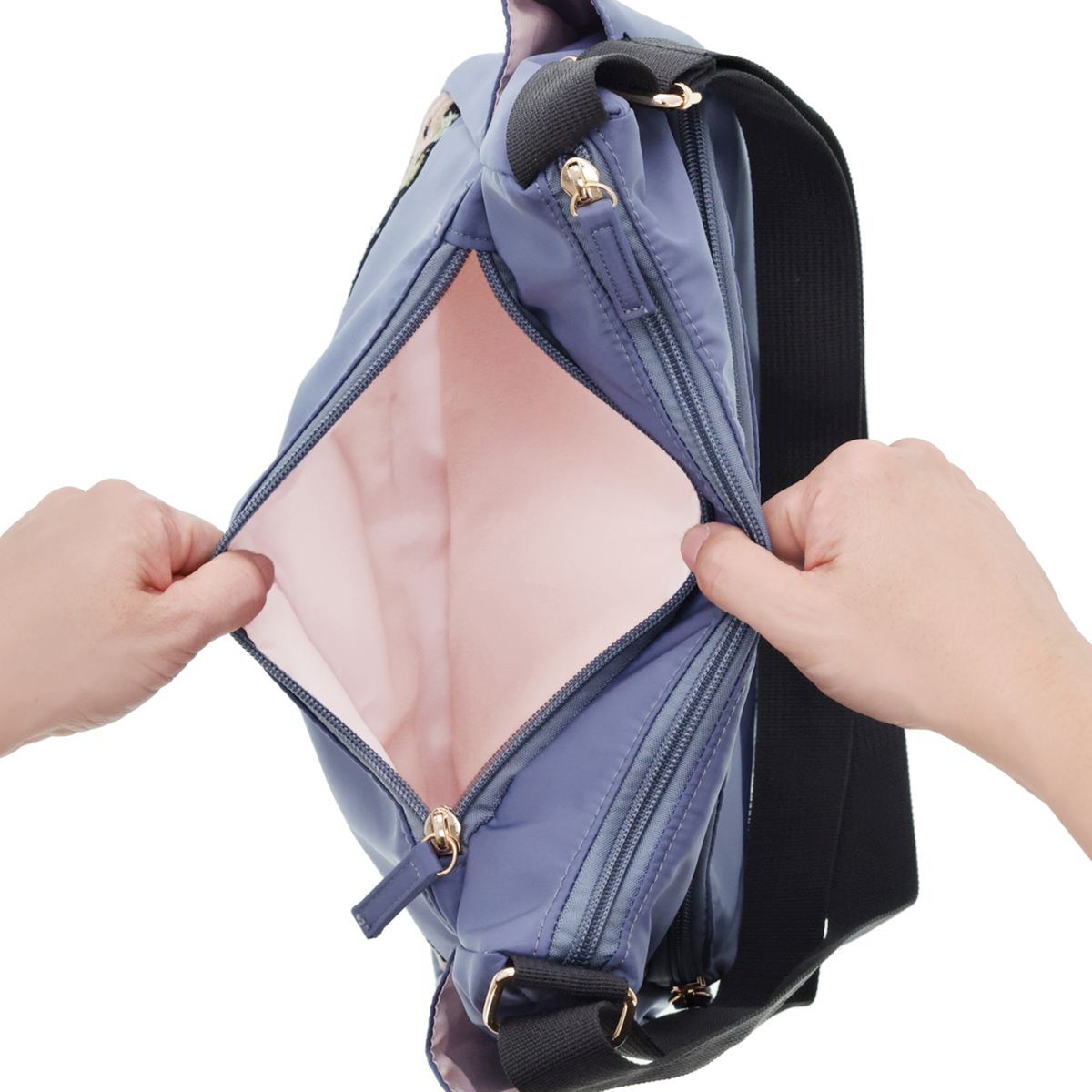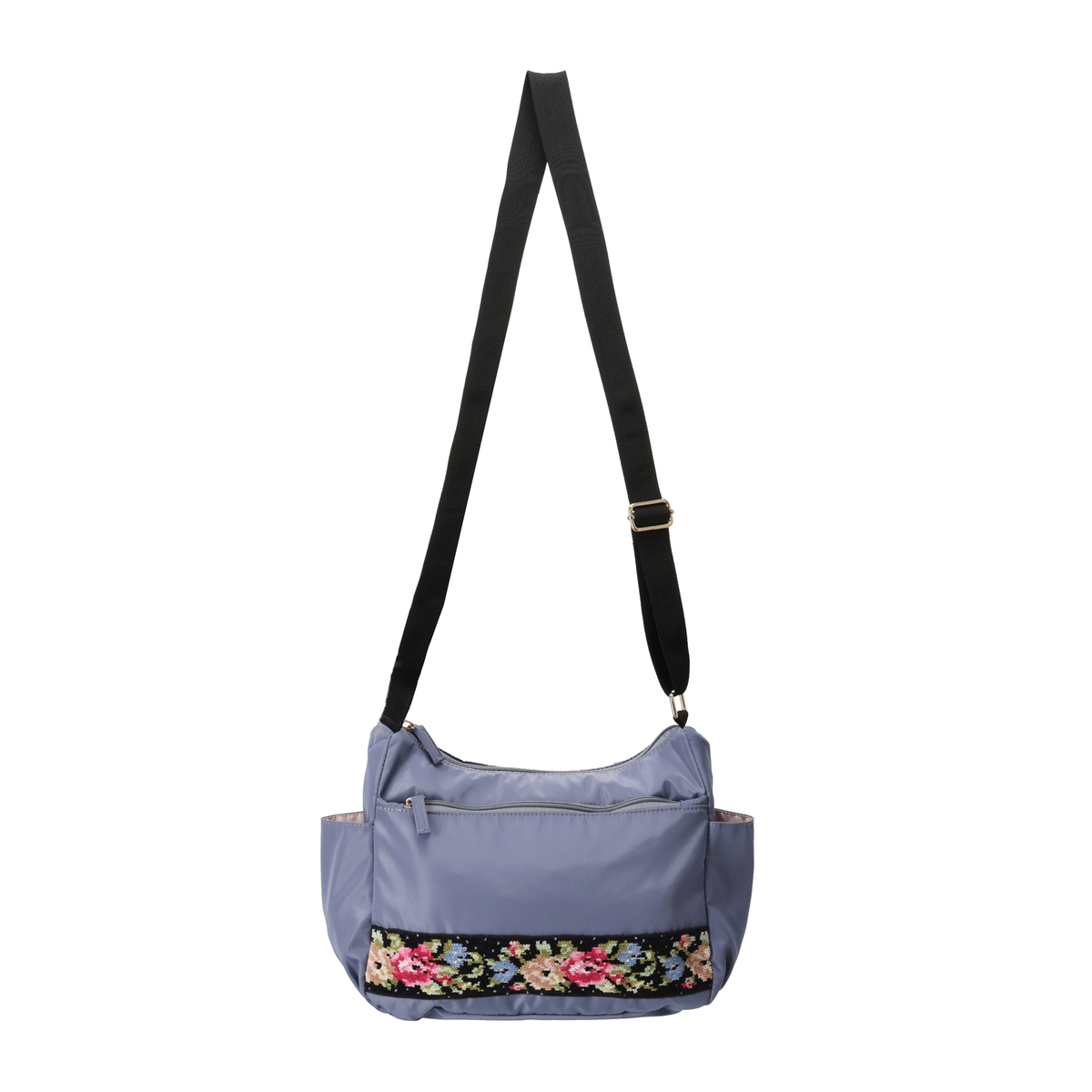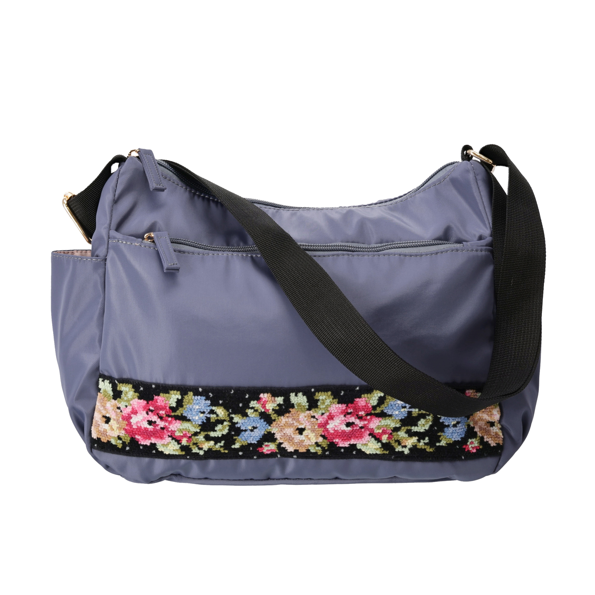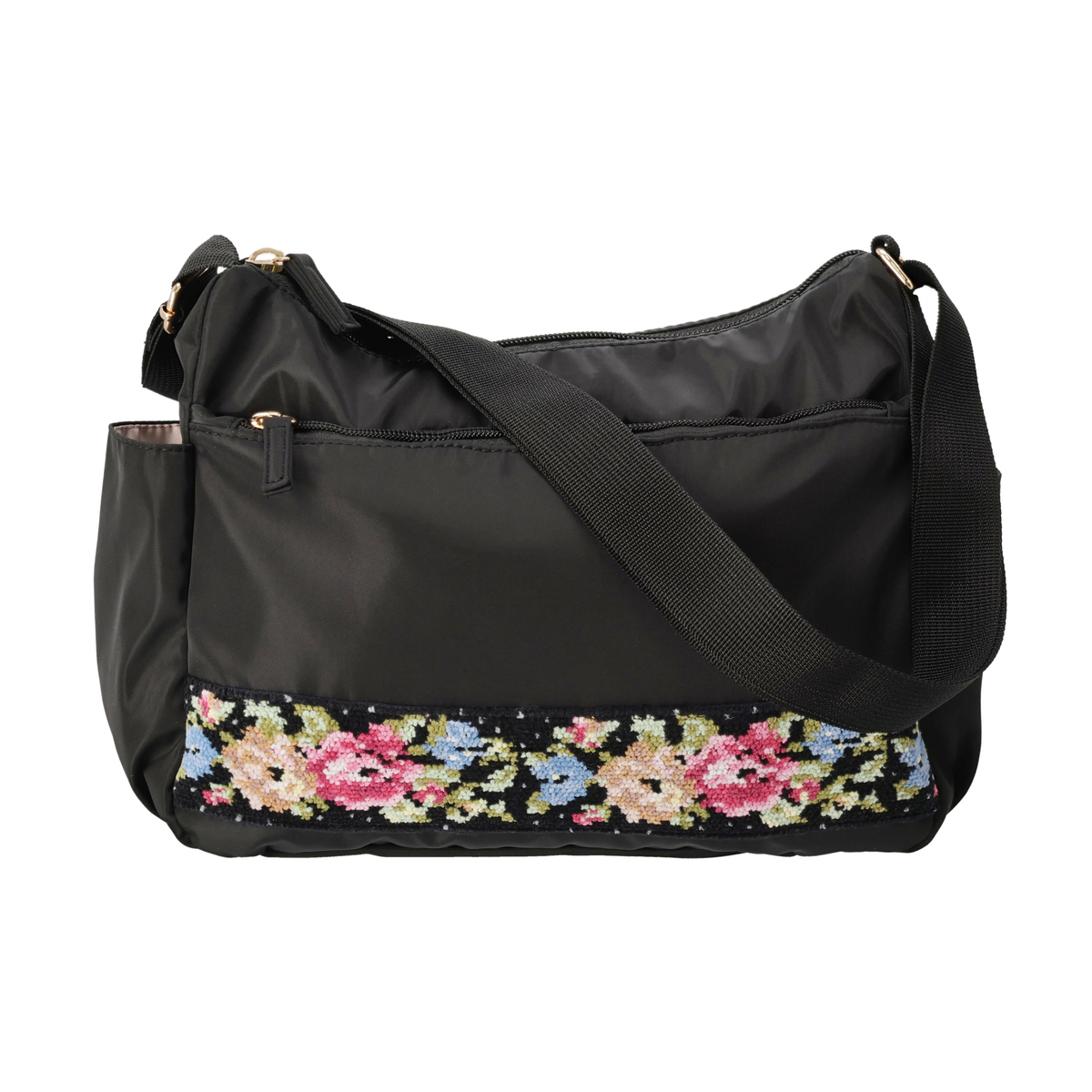斜め掛けも可能で、約205gと軽量なショルダーバッグです。正面には、花柄が鮮やかなシェニール織生地を使用。外側には前後のファスナーポケットとサイドのオープンポケット、内側にも3カ所のポケットを備え、収納力も十分。淡いピンクの裏地がさりげないポイントになります。表生地には撥水加工を施しています