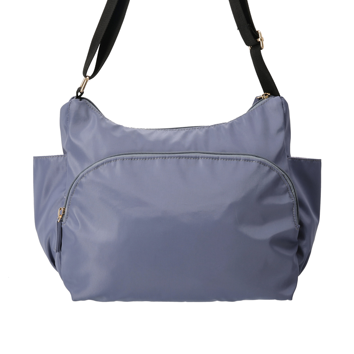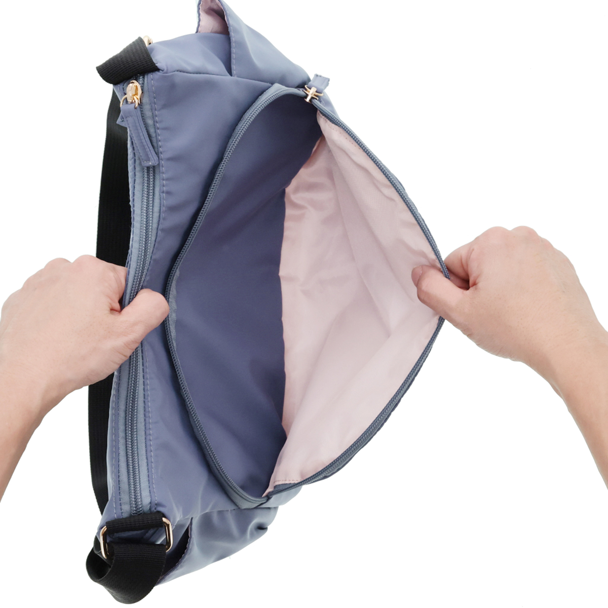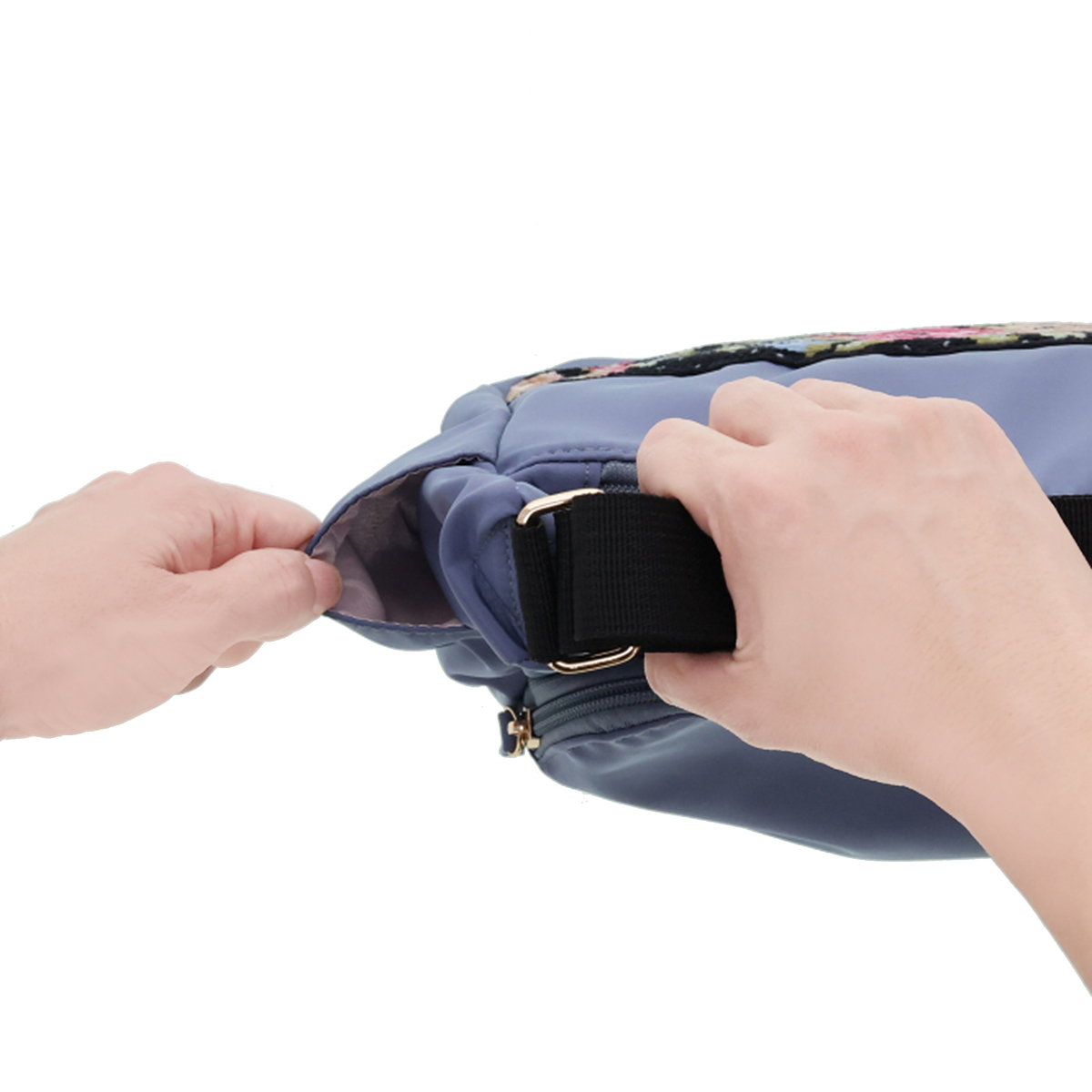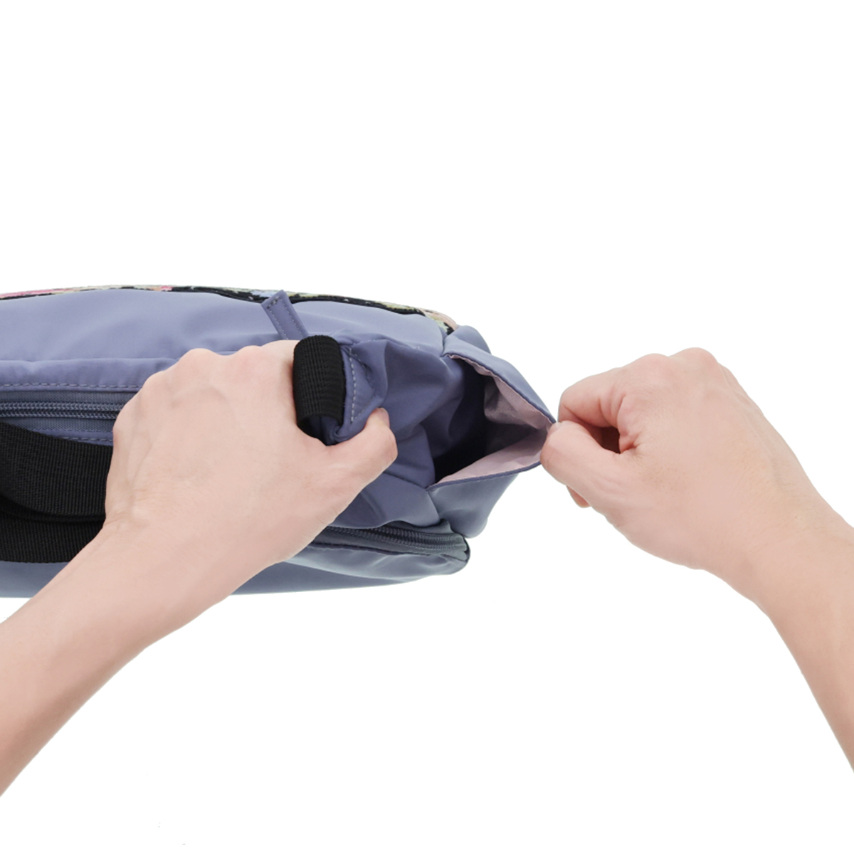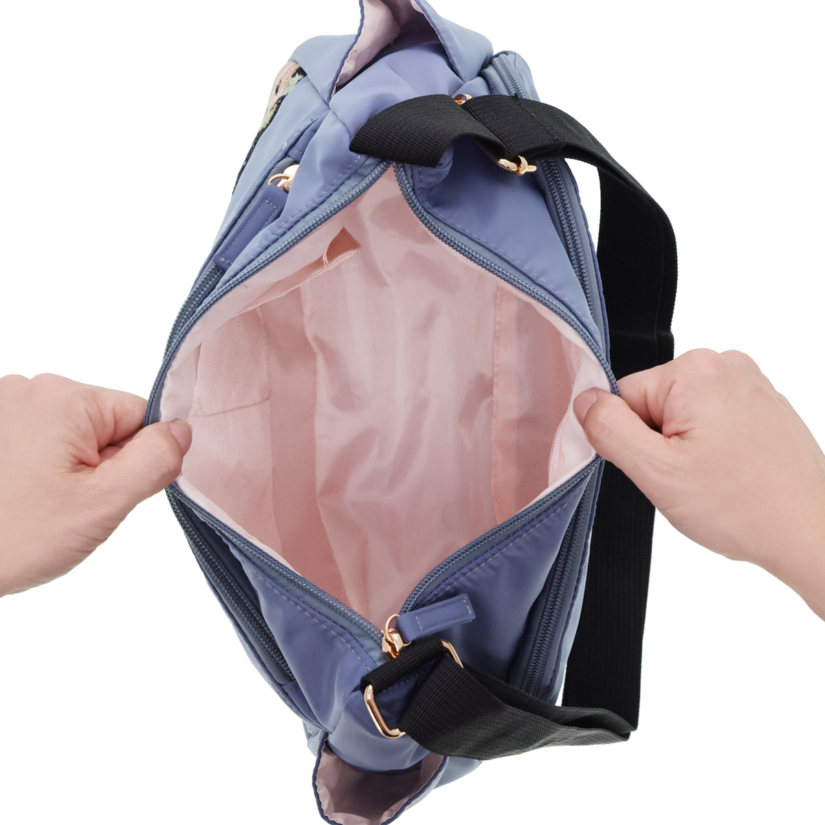 斜め掛けも可能で、約205gと軽量なショルダーバッグです。正面には、花柄が鮮やかなシェニール織生地を使用。外側には前後のファスナーポケットとサイドのオープンポケット、内側にも3カ所のポケットを備え、収納力も十分。淡いピンクの裏地がさりげないポイントになります。表生地には撥水加工を施しています
