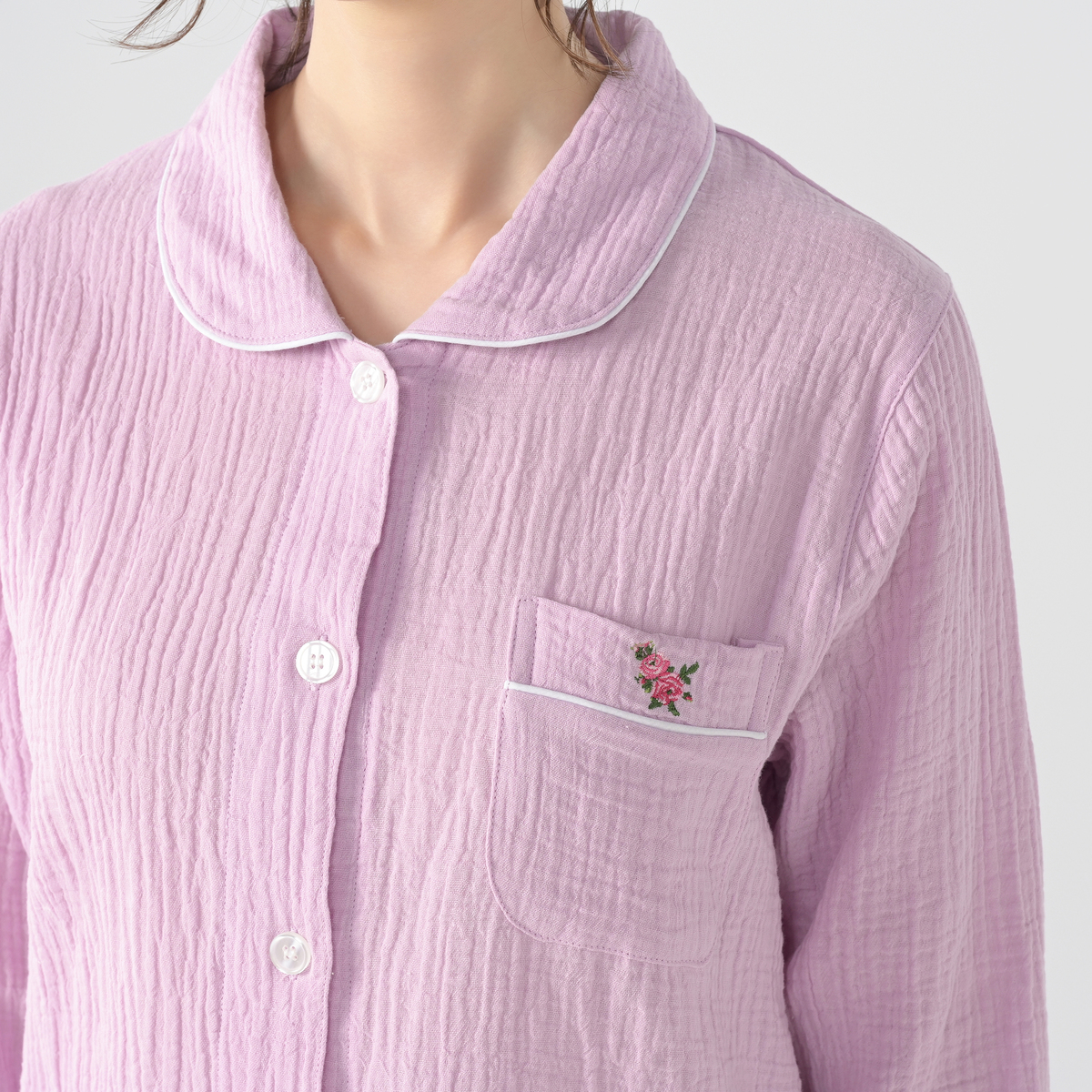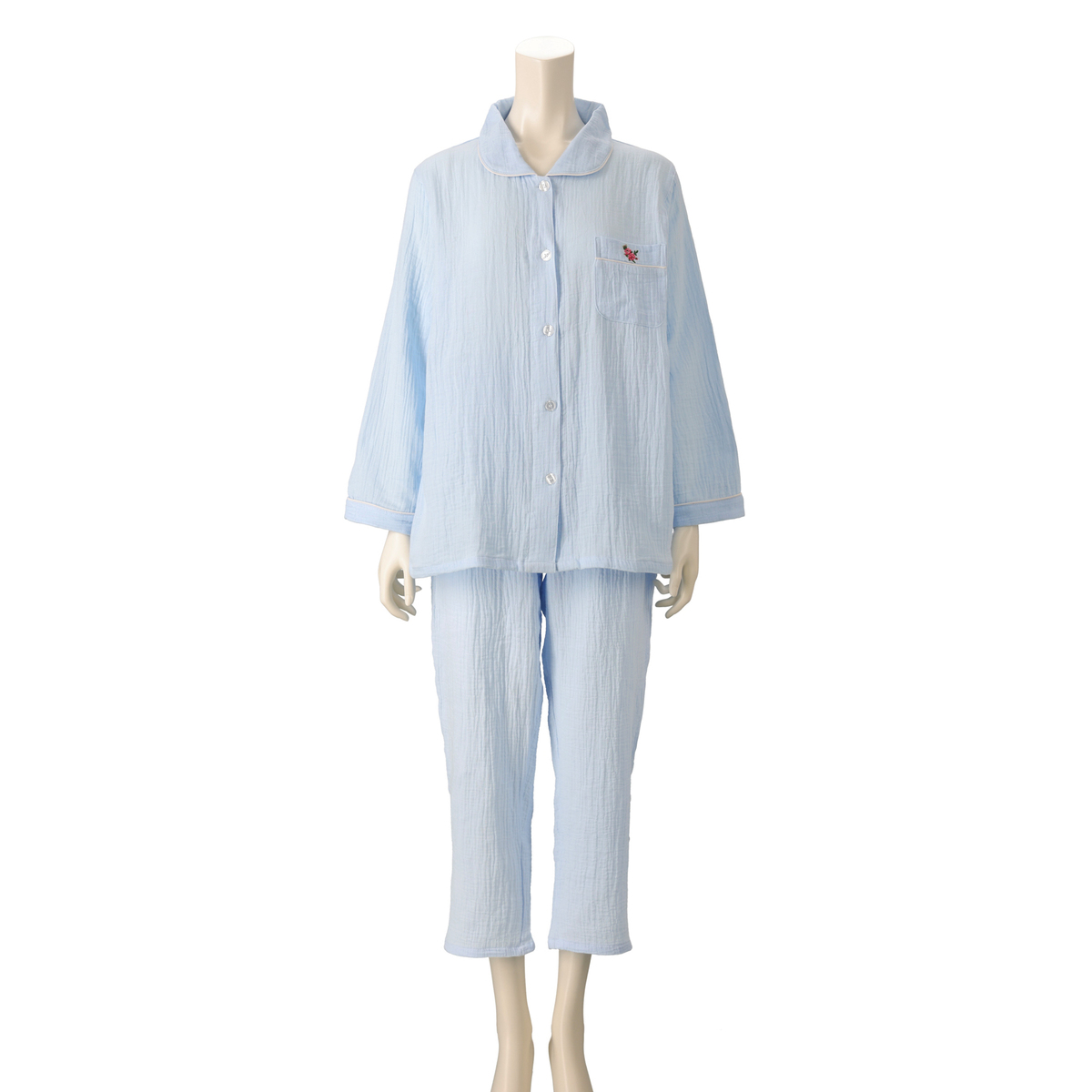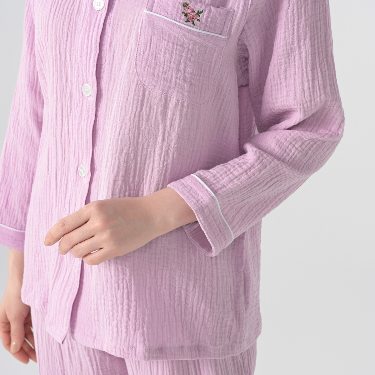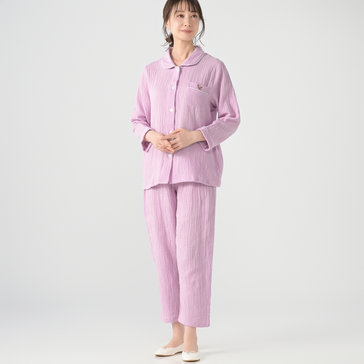 綿100%生地を使用した楊柳仕立てのダブルガーゼパジャマ。通気性があり、寒い季節も暖かく快適な着心地です