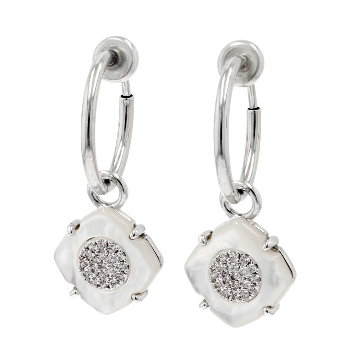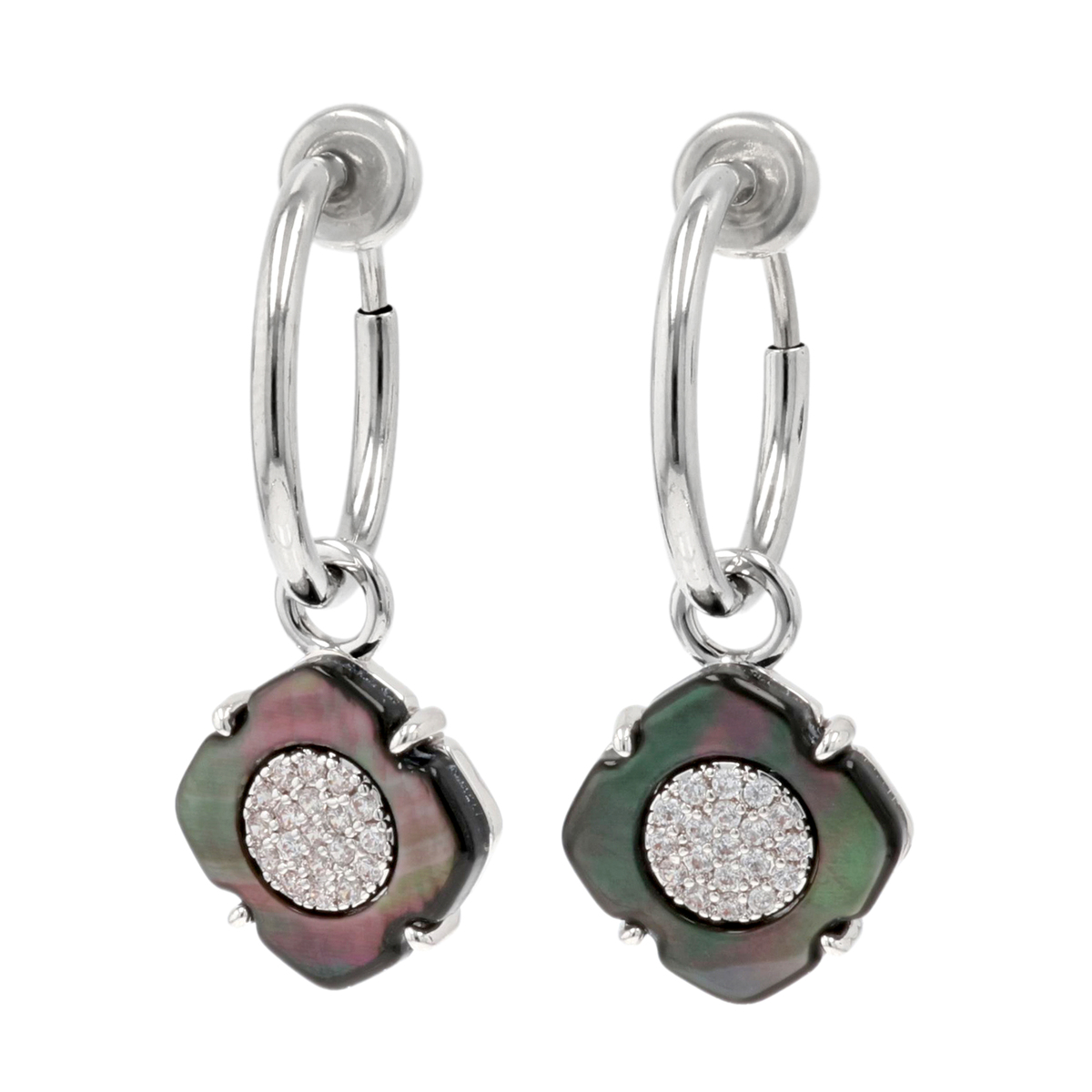 角度によって表情が変わる、白蝶貝または黒蝶貝を贅沢に使った、フラワーモチーフのイヤリング。上品なデザインで、シーンを選ばず活躍します