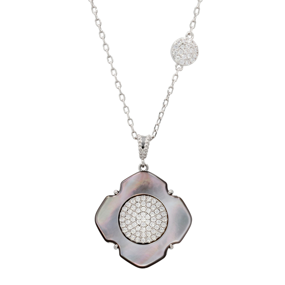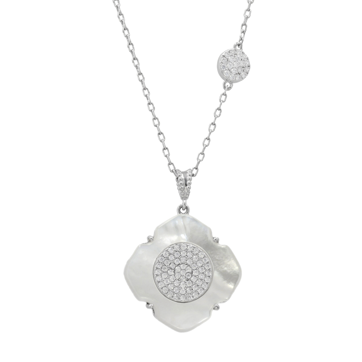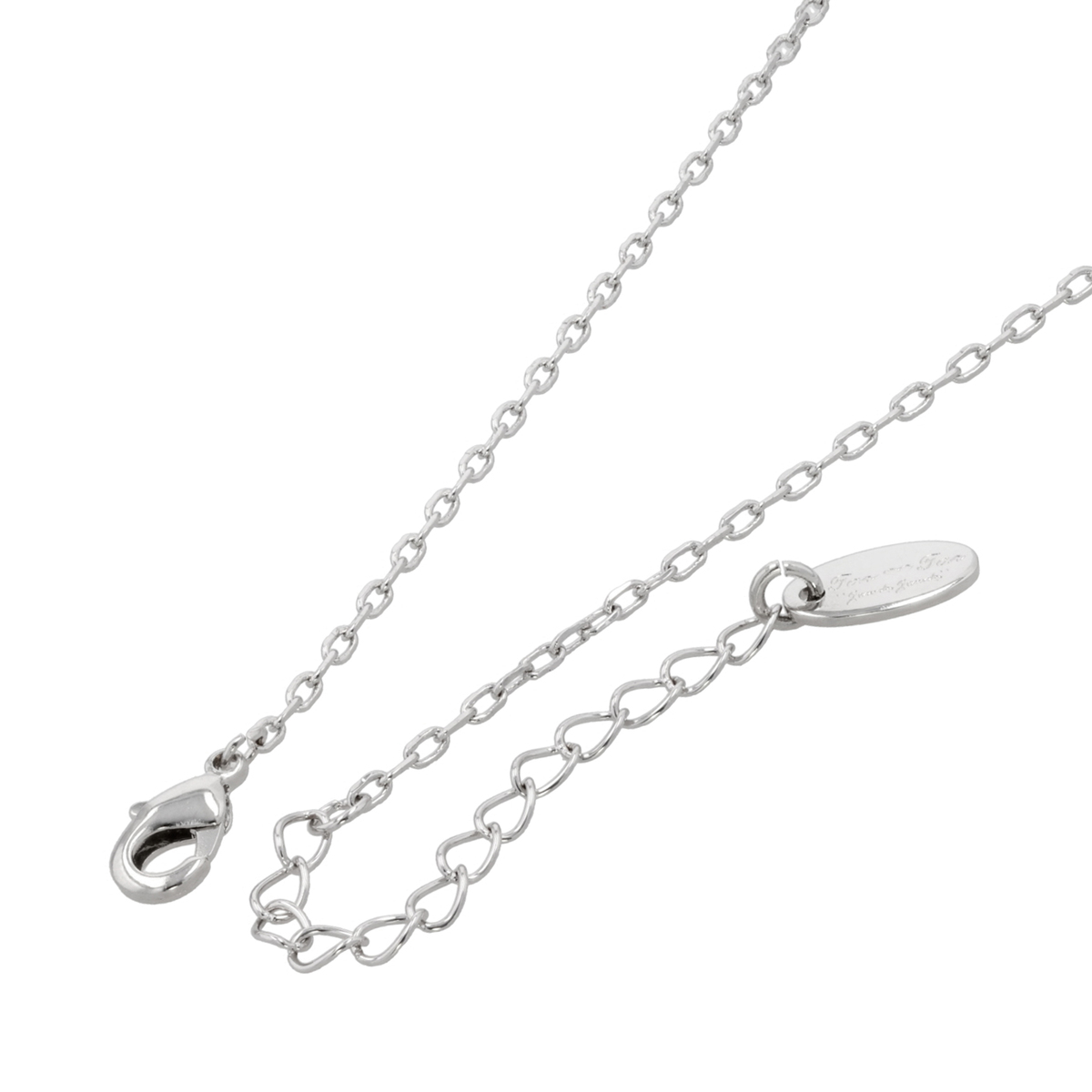 チェーンのアクセントには、キュービックジルコニアを敷詰めたラウンドモチーフを。洗練されたデザインで、装いにさりげない華やかさをプラスします
