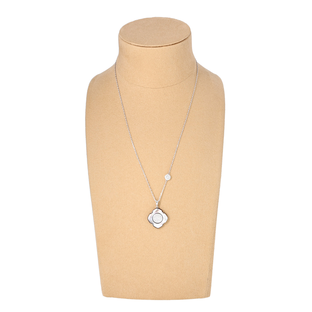 角度によって表情が変わる、白蝶貝または黒蝶貝を贅沢に使った、フラワーモチーフのネックレス。シンプルで高級感のあるデザインで、シーンを選ばず活躍します