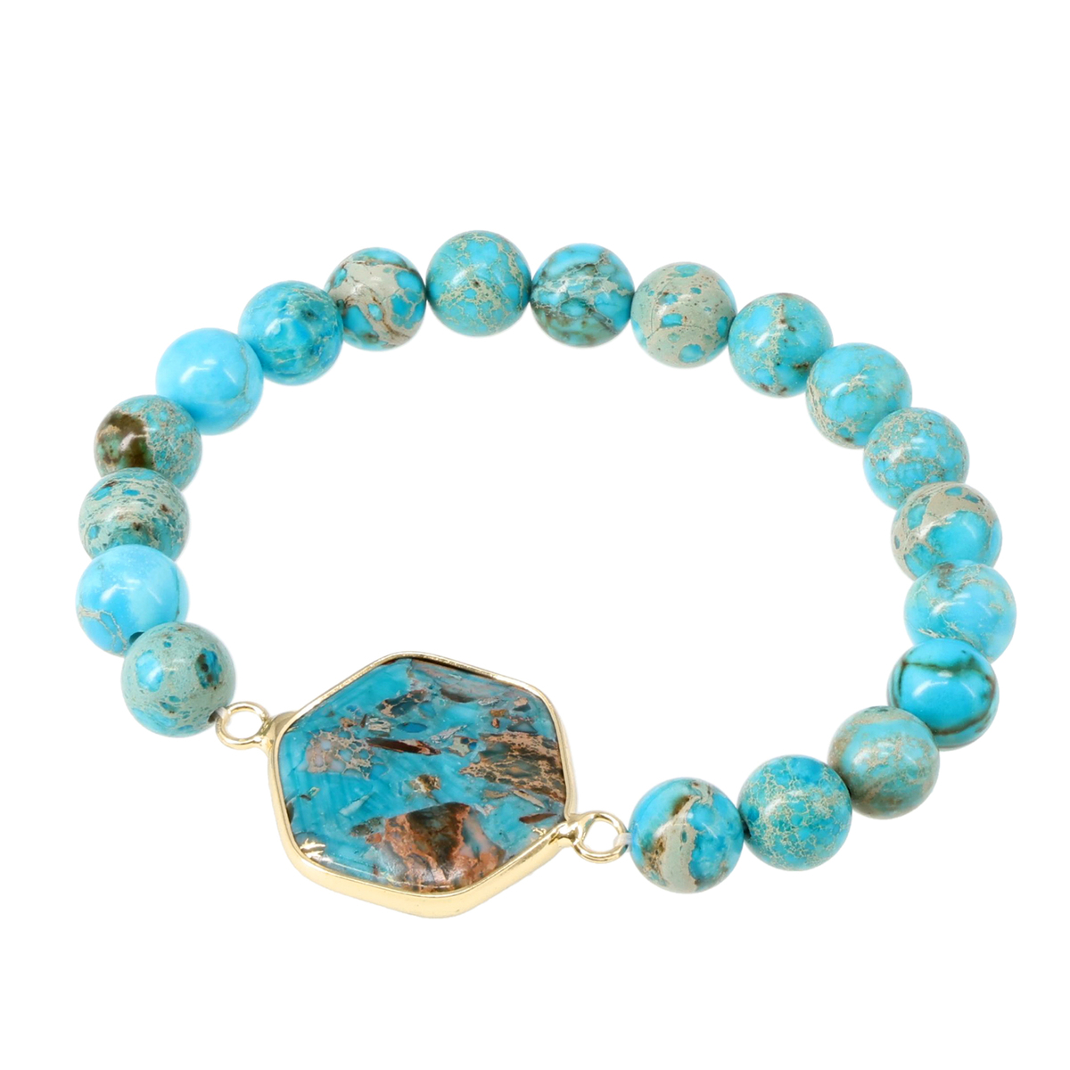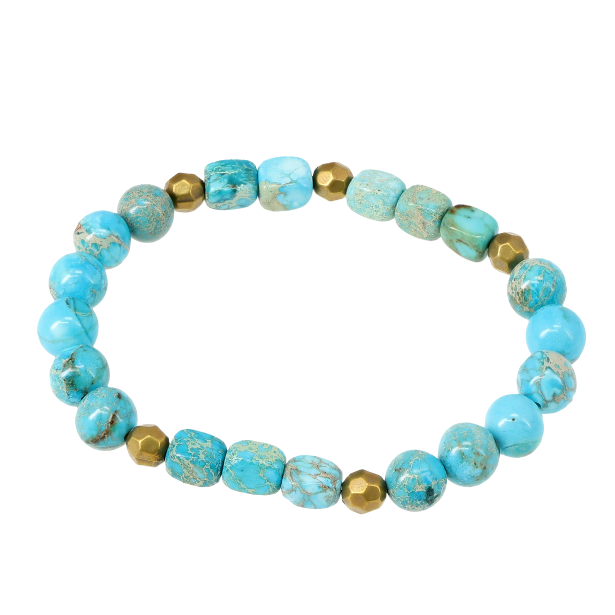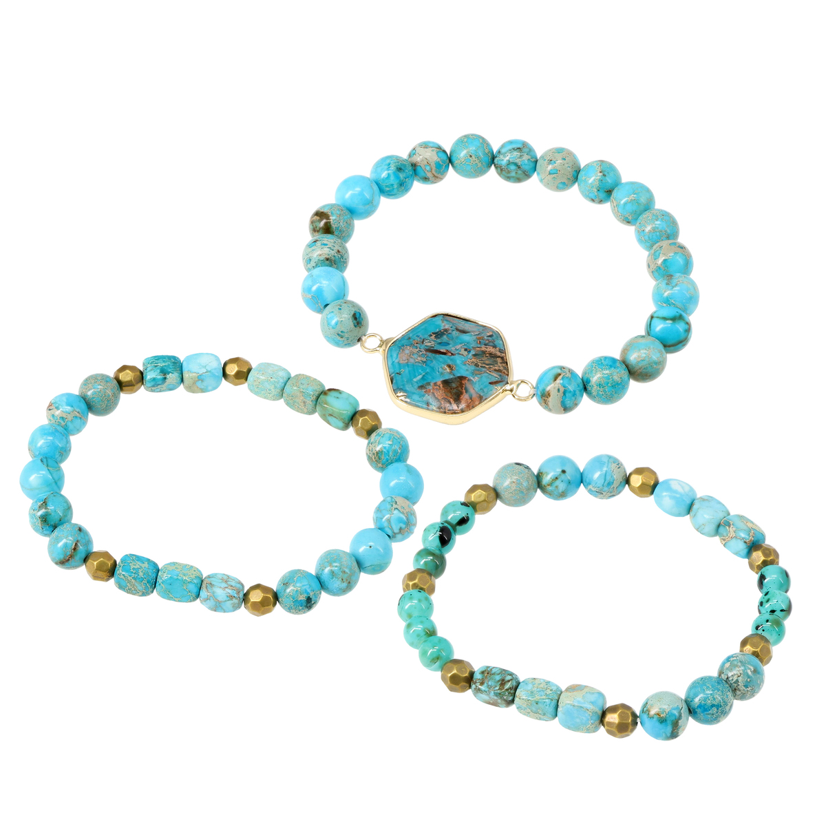 ターコイズカラーが印象的な3本セットのブレスレットです。少しずつ異なるデザインを自由に組合せることで、装いに個性と遊び心をプラス。ストレッチタイプで着脱が簡単なため、忙しい朝もスマートに身につけられます