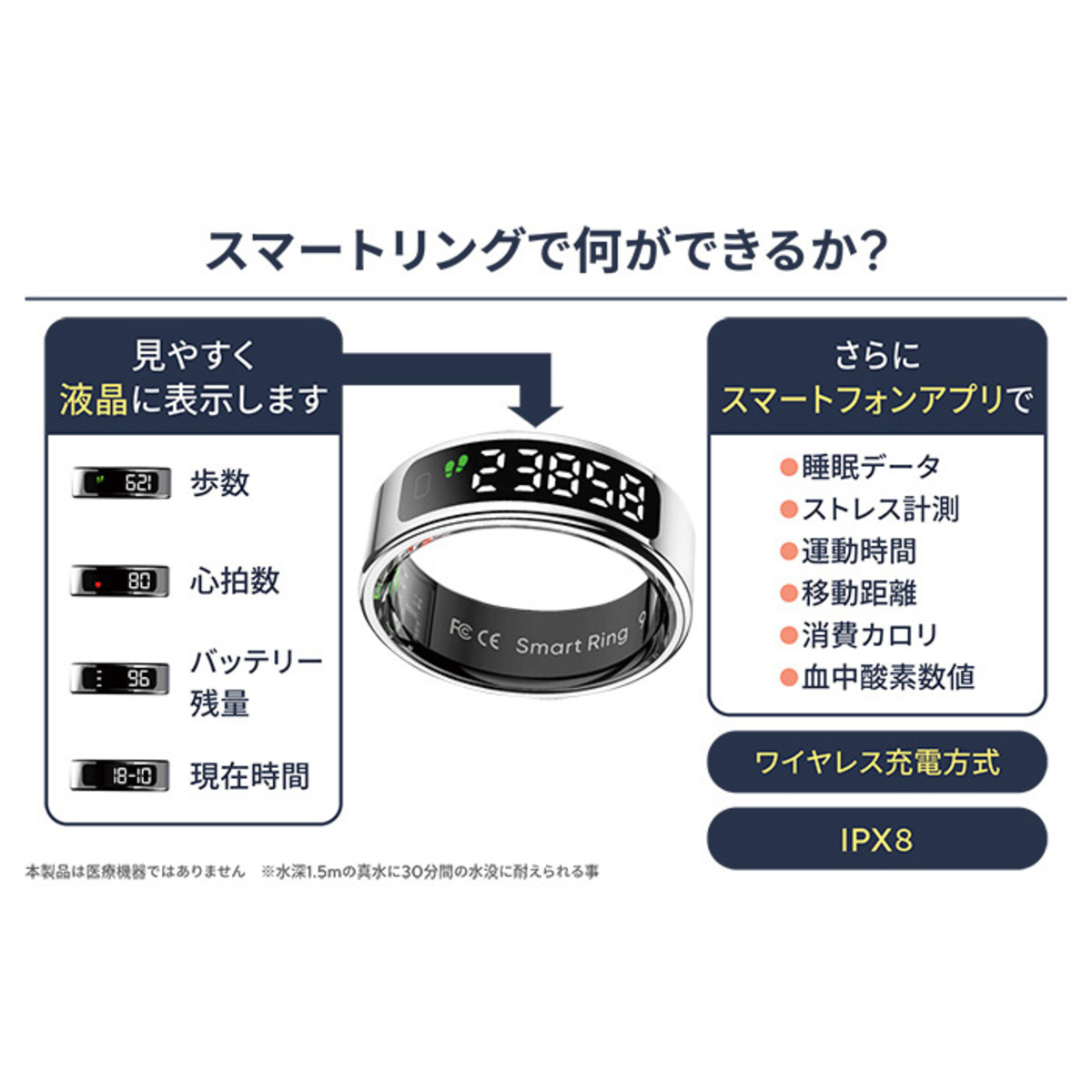 [商品内容] ・本体 ・充電スタンド ・充電用USBケーブル(Type A to C) ・シリコンカバー ※ACアダプターは付属しておりません [サイズ]内径(約) 7番(13号〜14号):1.79cm 8番(16号〜17号):1.83cm 9番(18号〜19号):1.91cm 10番(20号〜21号):2.00cm 11番(23号〜24号):2.08cm 12番(25号〜26号):2.16cm 13番(28号〜29号):2.23cm ※内周は目安 [重量]約4.7g(13番) [充電時間]約1時間 [使用可能時間]約3日間 [対応OS]iOS10以上 Android8以上 【中国製】 [注意事項] ※航空機内では使用しないでください。電波が影響を及ぼし、誤動作による事故の原因となるおそれがあります。ワイヤレス機能の航空機内でのご利用については、ご利用の航空会社に使用条件などをご確認ください ※本製品で測定できる数値はあくまで目安となる参考値であり、医療目的で使用できるデータではございません。測定する環境、装着の具合によって数値に大きな差異が出ることがございます。不具合ではございません ※ペースメーカーや除細動器などの医療機器を装着されている場合、本品の電波が機器の動作に影響を与える可能性があります。医師や医療用機器製造者に影響を確認してからご使用ください ※全ての機能は日常的な運動管理であるウェルネス・フィットネス目的の製品であり医療機器ではありません。病気などの診断、予防、治療の目的にはご使用いただけません ※本製品は精密機械であるため、落下やぶつけるなどの衝撃を与えないでください。性能や機能の異常、または外装の破損の原因になります ※ご利用の前に、付属のUSB充電スタンドにて1時間充電してからご利用ください ※化粧品、日焼け止めクリーム、アルコール、化学洗剤、防虫剤など刺激の強い薬品は本製品の金属部分やプラスチック部分を傷める恐れがありますので使用しないでください。付着した場合は、キレイな布でお拭き取りください ※車のダッシュボードなどの振動がある場所、高温になる場所での保管はおやめください。本製品の故障、破損の原因になります ※急激な気温の変化にさらさないでください ※本製品を充電する前に、リングに汚れがある場合は、必ず汚れを拭き取ってから、充電してください。故障の原因になります ※肌に違和感や異常を感じた場合、直ちにご使用をおやめください ※本製品を分解しないでください ※保管の際は小さなお子様の手の届かぬ場所で保管してください ※本製品は精密機器です。ご利用に際しては本製品の取扱説明書をご熟読頂き正しくご利用ください ※商品は予告なしに一部を改良する場合がございます ※IPhoneは米国Apple Inc社における米国およびその他の国における登録・登録商標です。Android は Google LCCの商標です ※本製品はリチウムイオン充電池を含みます ・本製品に強い衝撃を与えないでください。 ・シャワーやサウナの粒子が細かな水分が発生する場所ではご利用頂けません。本製品の故障や、リチウム電池の膨張/ 発熱等の原因につながります。 ・充電を行う場合は付属の充電ケーブルを用いて充電を行ってください ・急速充電器やPD充電器は使用しないでください ※通常(5V/1A程度)のUSB充電器をご利用頂くか、パソコンの USBポートでの充電をおこなってください ※ケーブルを束ねた状態で充電をおこなわないでください ※バッテリーの経年劣化は保証対象外になります ※廃棄する場合はお住まいの自治体のルールに基づき廃棄してください ※装着時に本製品が熱をもつ(いつもとは異なる)等の異常を感じた場合はご利用を止めてください
