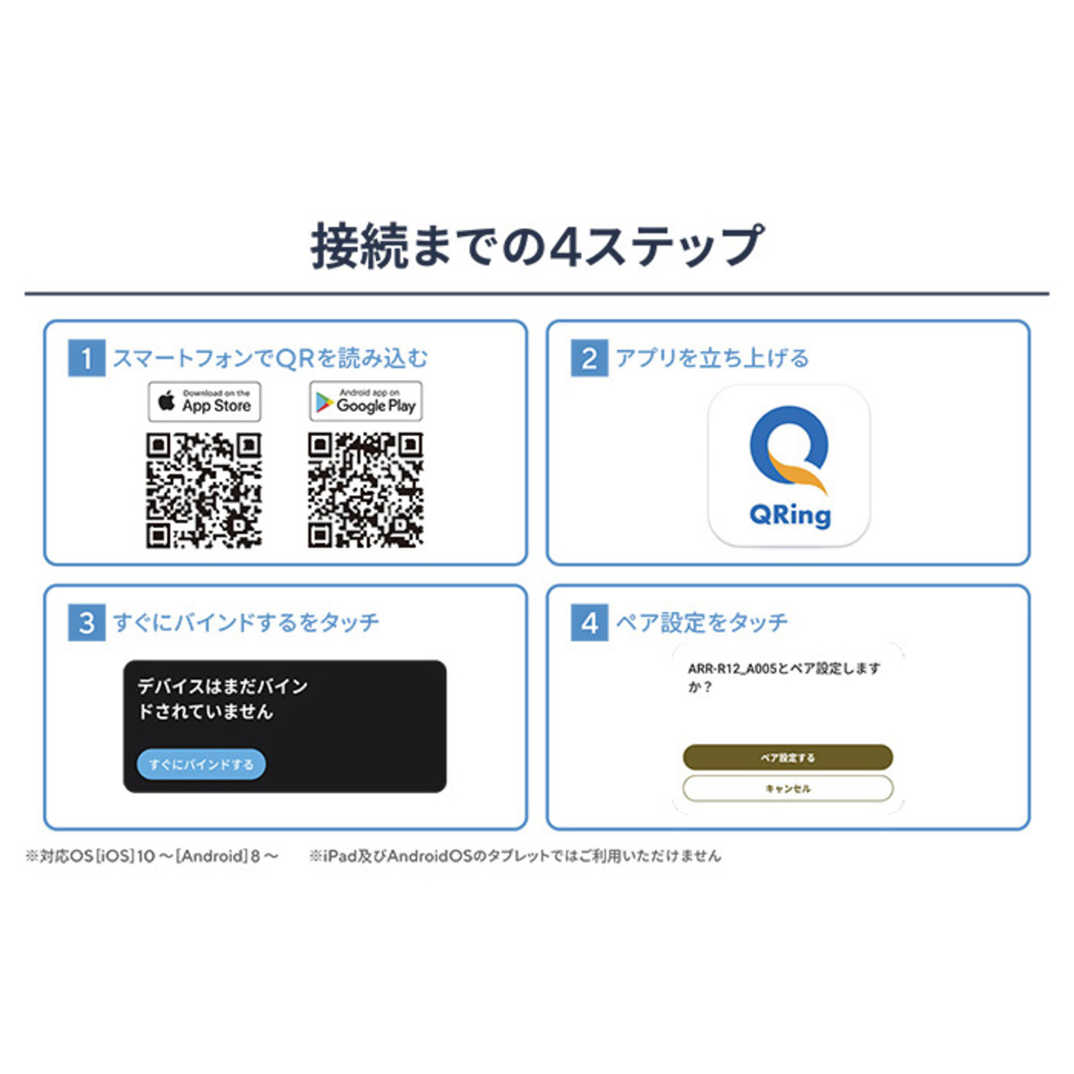 歩数や心拍数、睡眠データなどが測定できるスマートリング。無料アプリ「Qring」で日・週・月ごとにデータを保存、閲覧できます*1。iOS10以降、Android8以降のスマートフォンに対応。スマートフォンと本製品の接続はアプリから行います