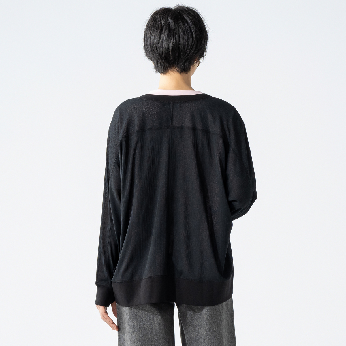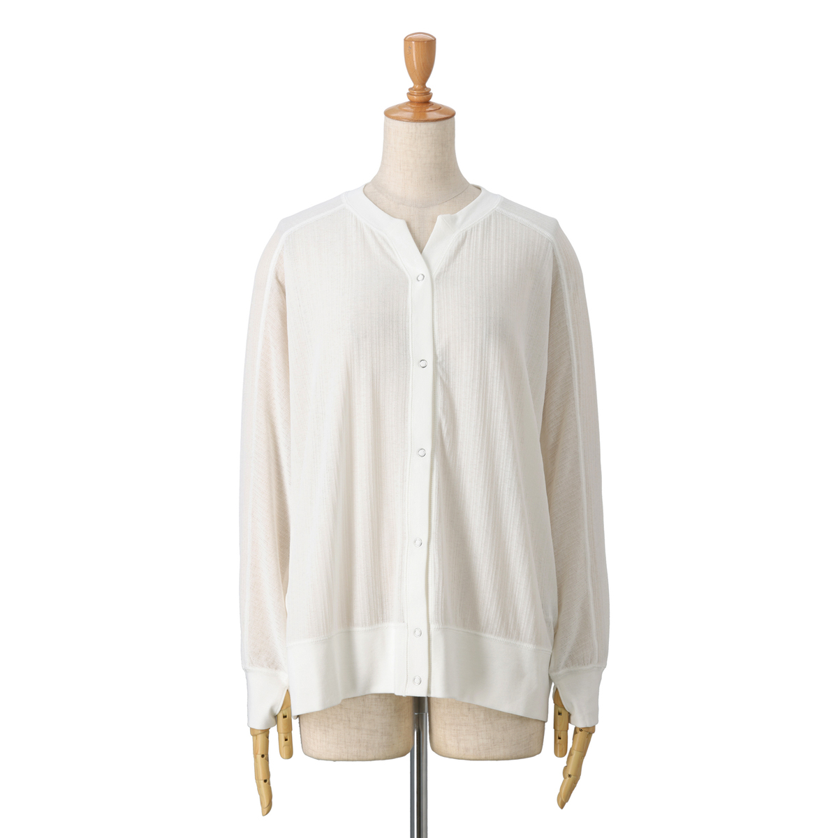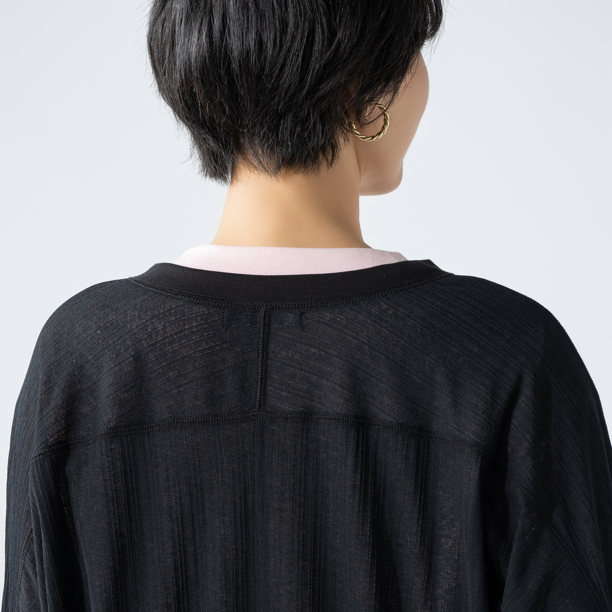 吸水速乾性とシャリ感を持つ針抜きリブ素材を使用。軽やかな肌触りと風通しの良さがうれしいポイントです。表面はしぼ感のある味わい深い見た目で、程よい透け感があります