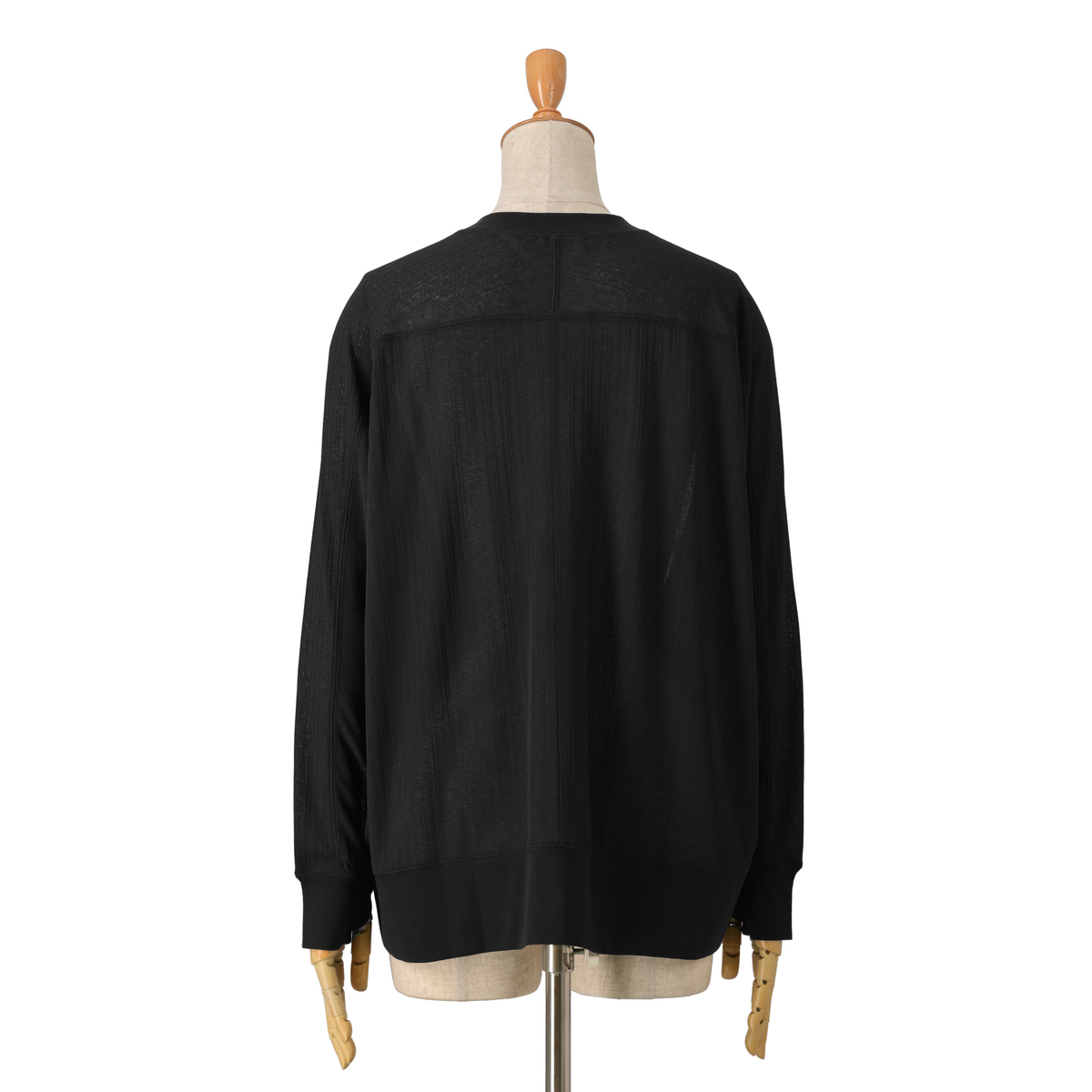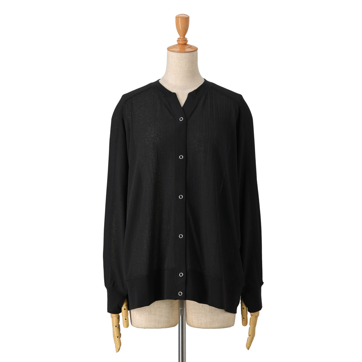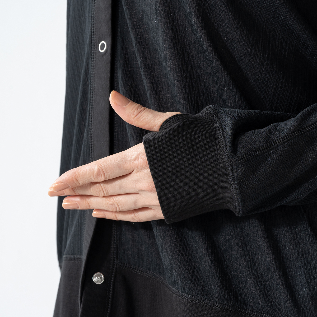 吸水速乾性とシャリ感を持つ針抜きリブ素材を使用。軽やかな肌触りと風通しの良さがうれしいポイントです。表面はしぼ感のある味わい深い見た目で、程よい透け感があります