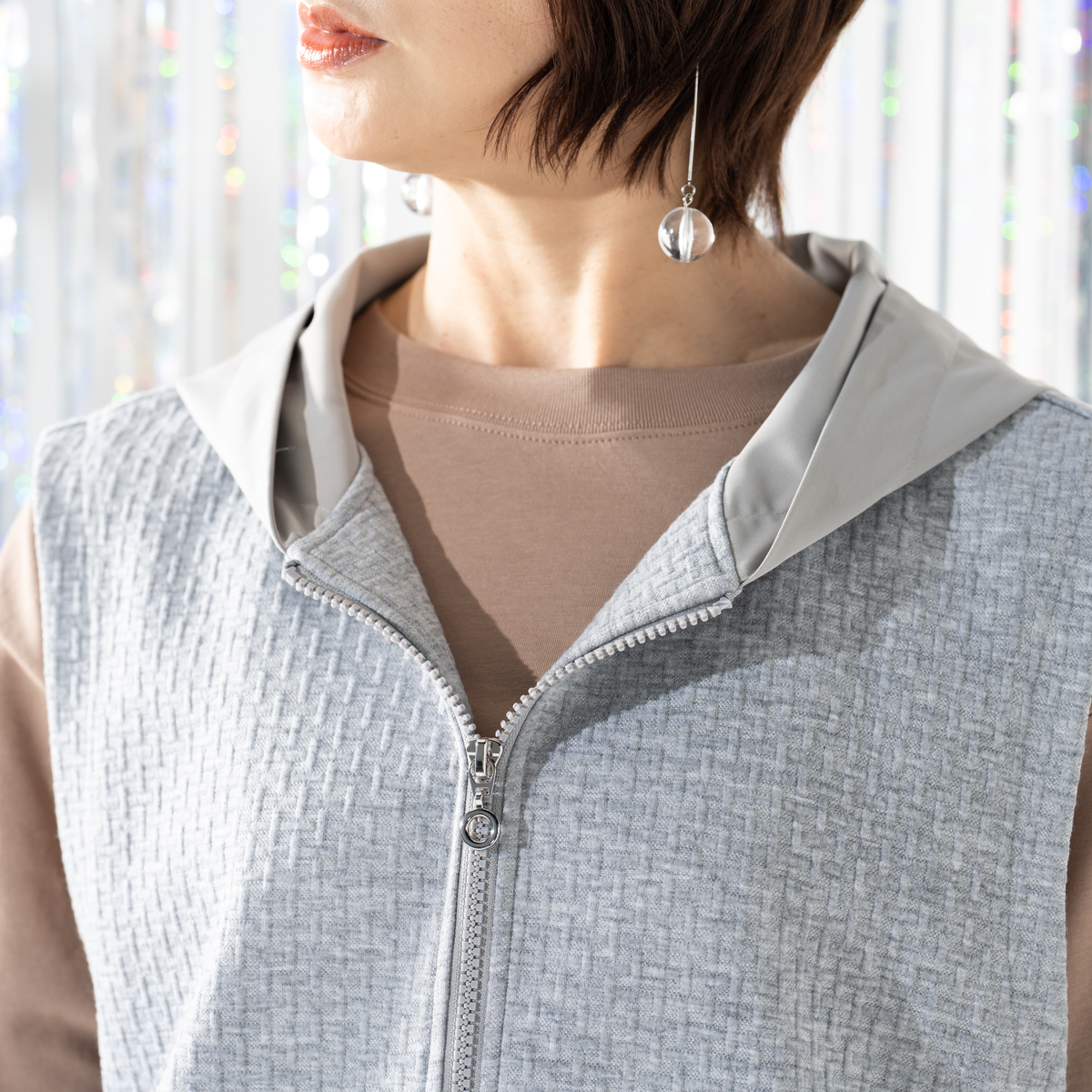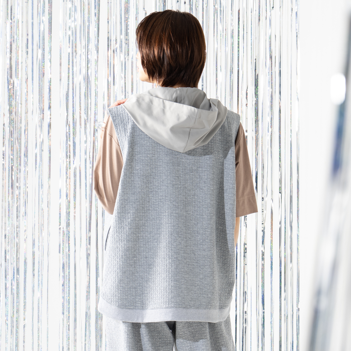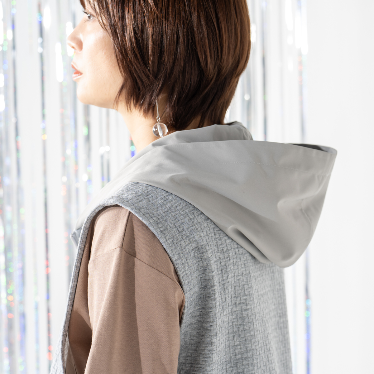着回しに活躍してくれる、異素材使いのシップベスト。本体に格子状の立体ふくれジャガード、フードにヴィンテージタフタを使い、1枚で重ね着風に見えるデザインです