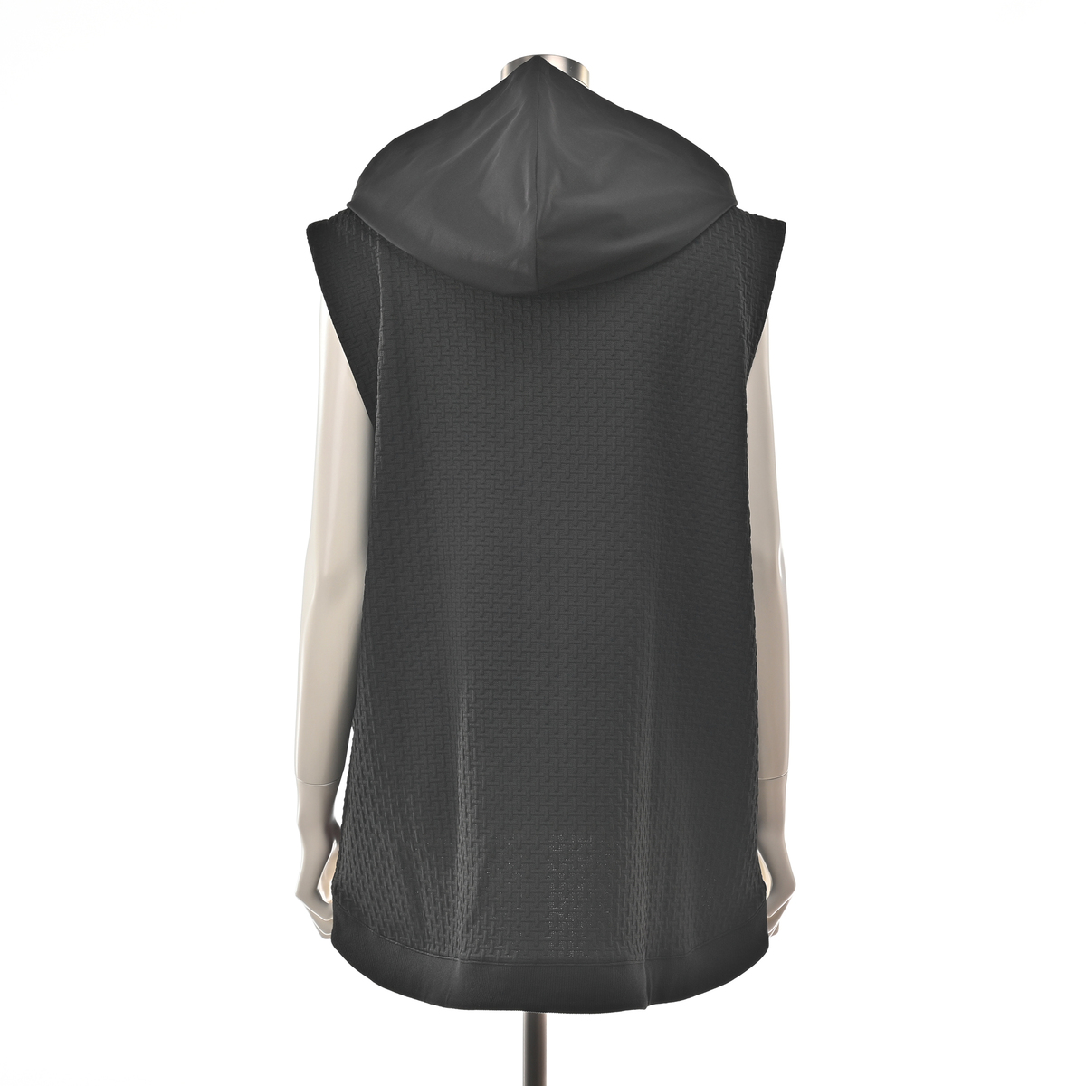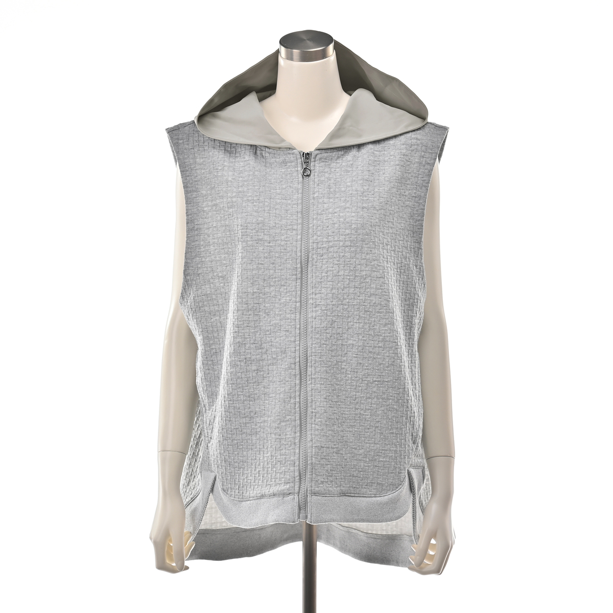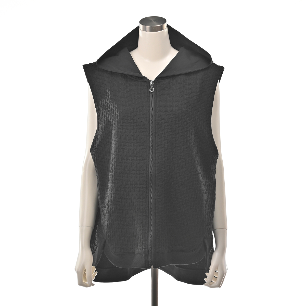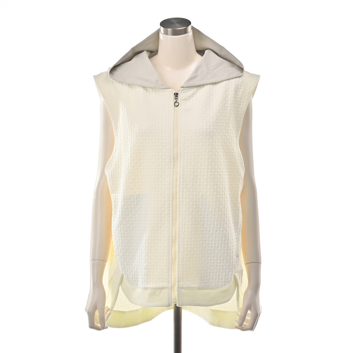 着回しに活躍してくれる、異素材使いのシップベスト。本体に格子状の立体ふくれジャガード、フードにヴィンテージタフタを使い、1枚で重ね着風に見えるデザインです