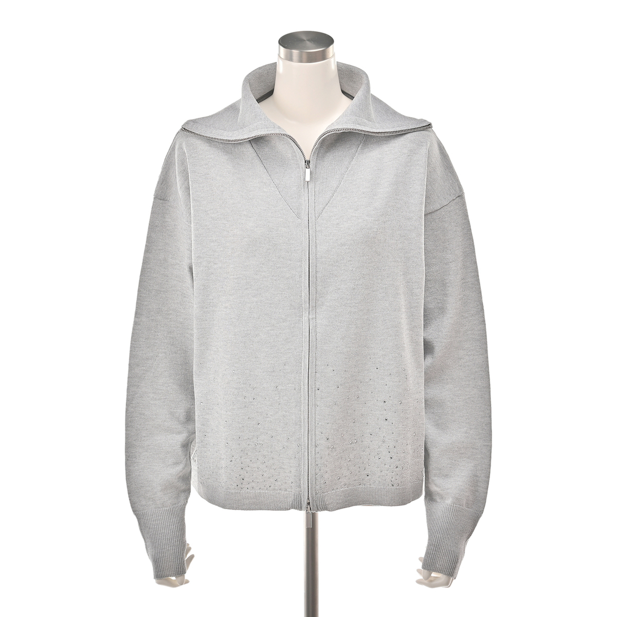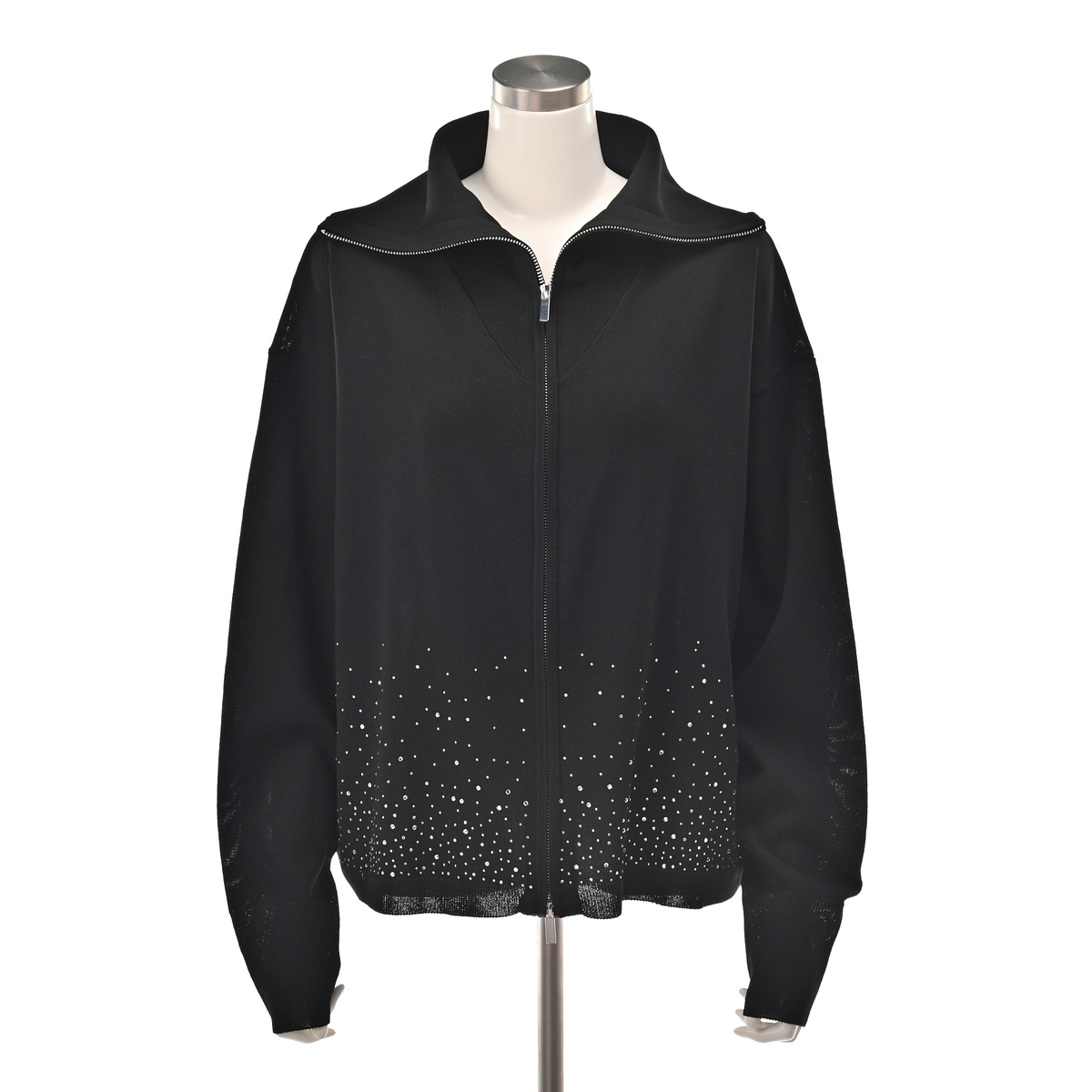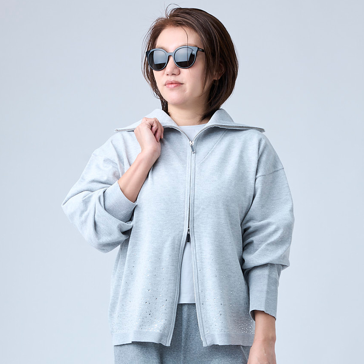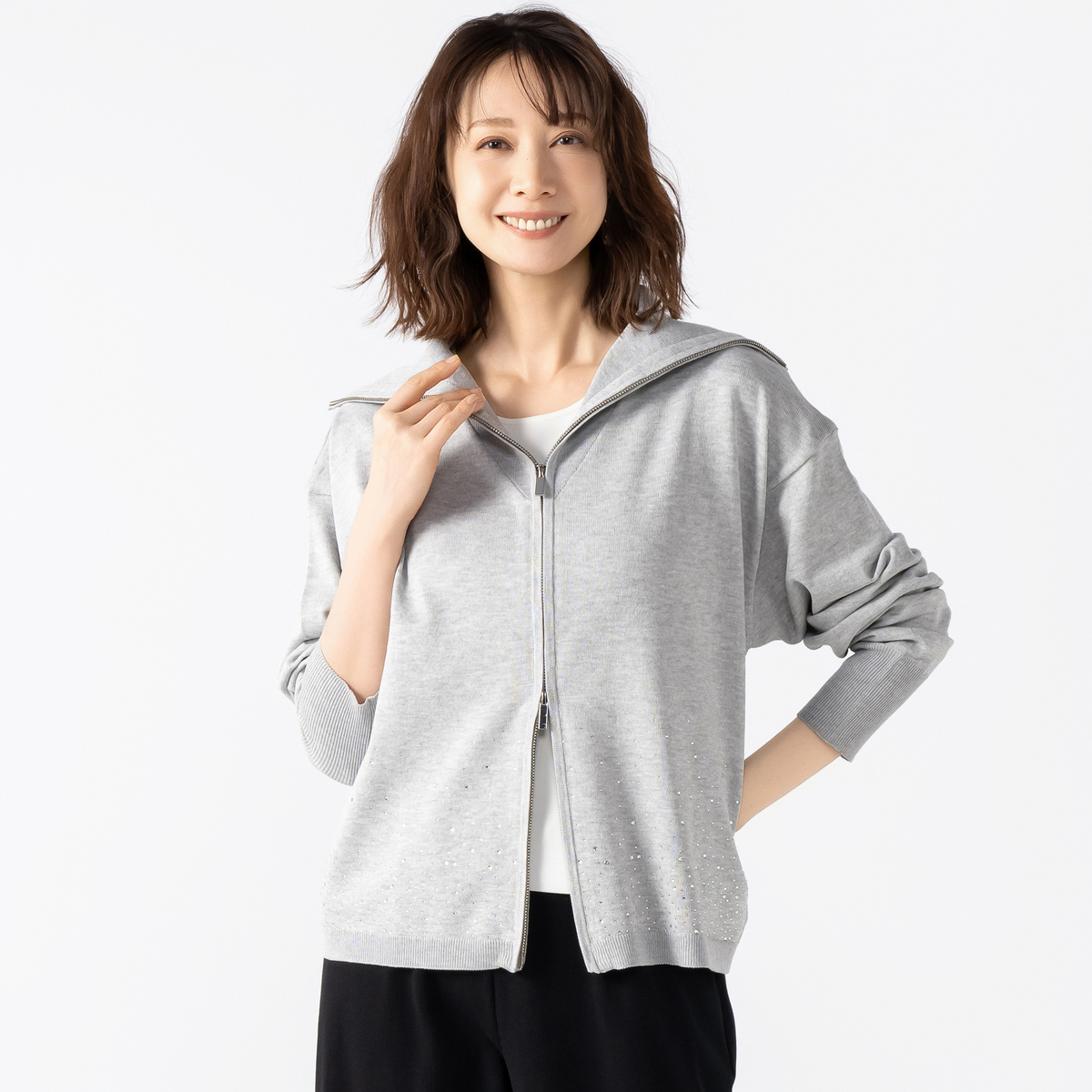 前身頃にラインストーンをグラデーションであしらったカーディガン。大きな襟はファスナーで表情を変えられ、着こなしに幅が出ます。袖のリブで長さを調整しやすく、軽やかにまとえるデザインです