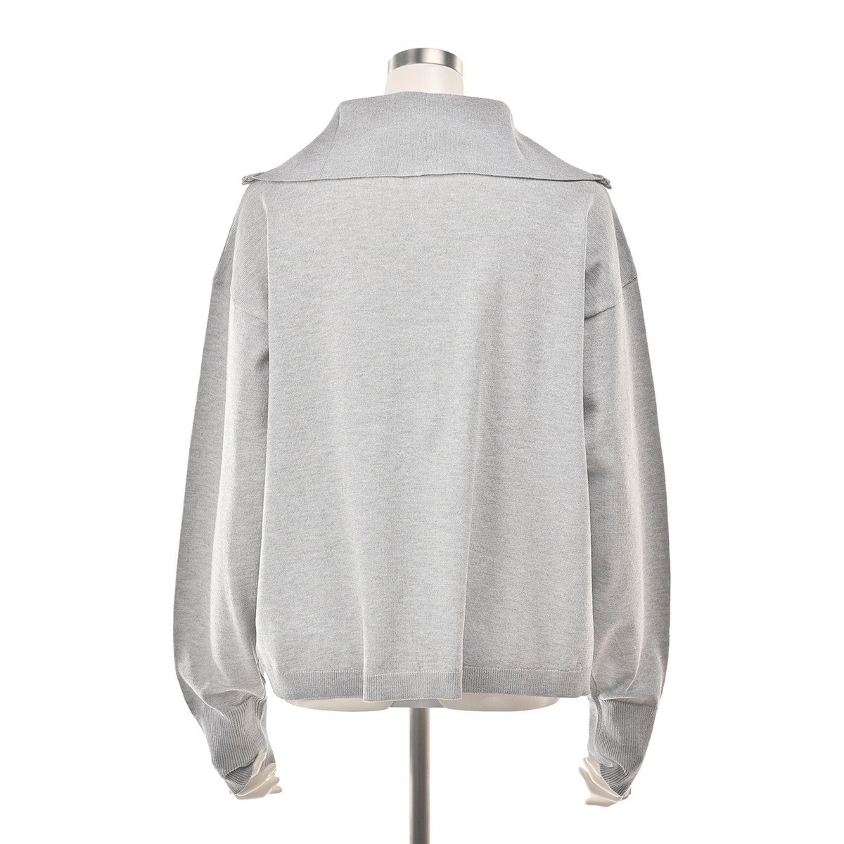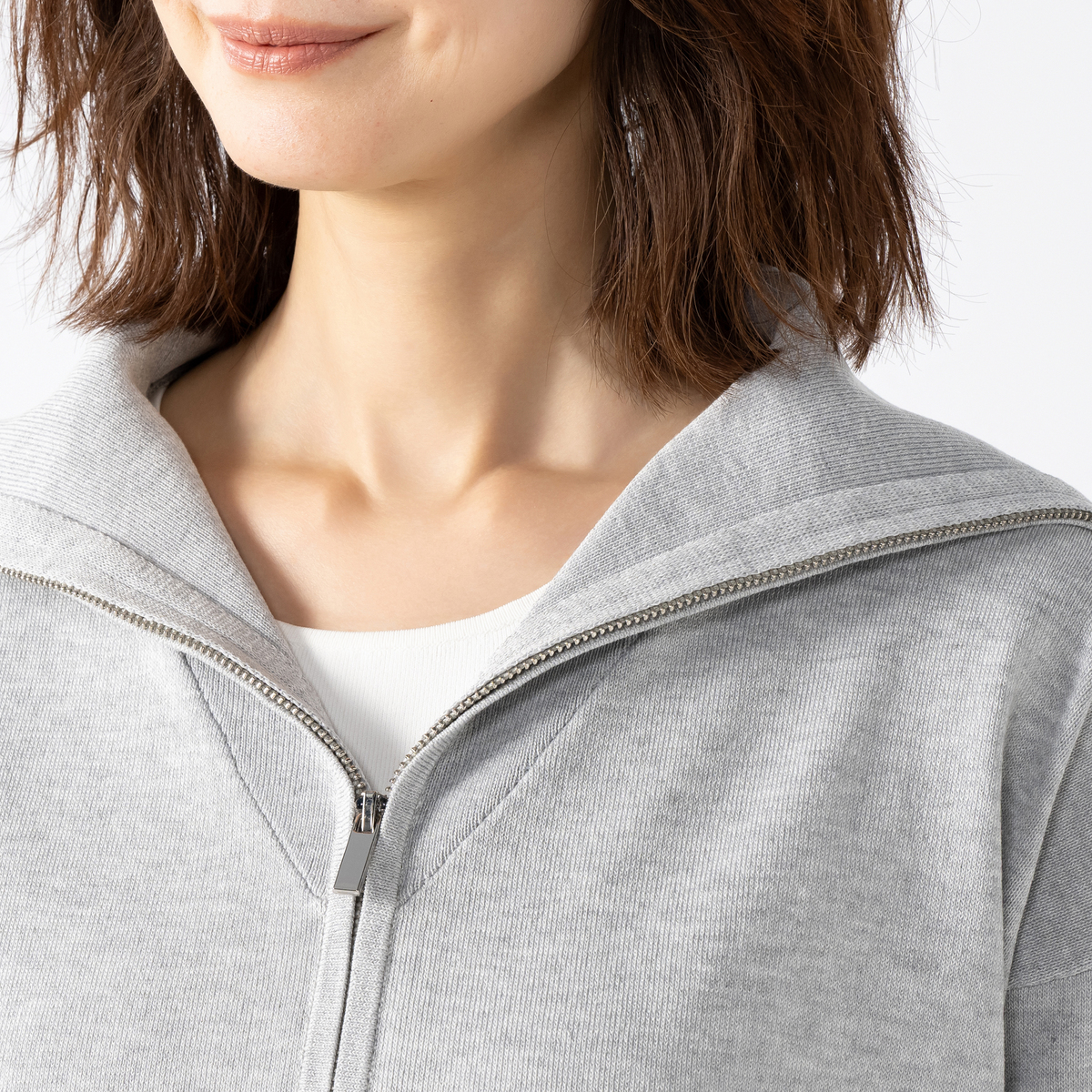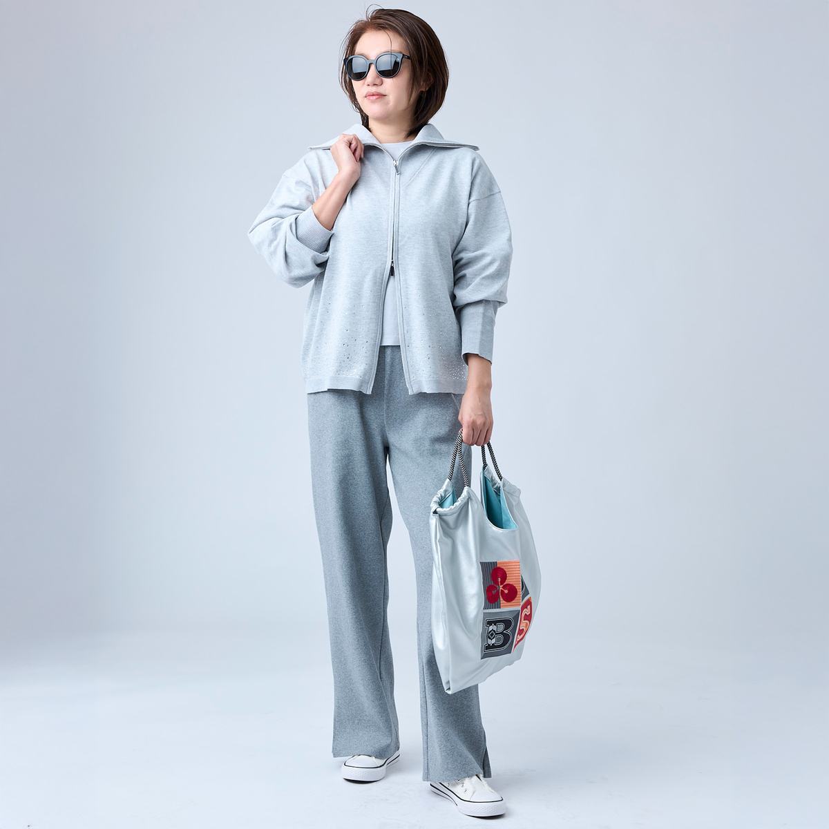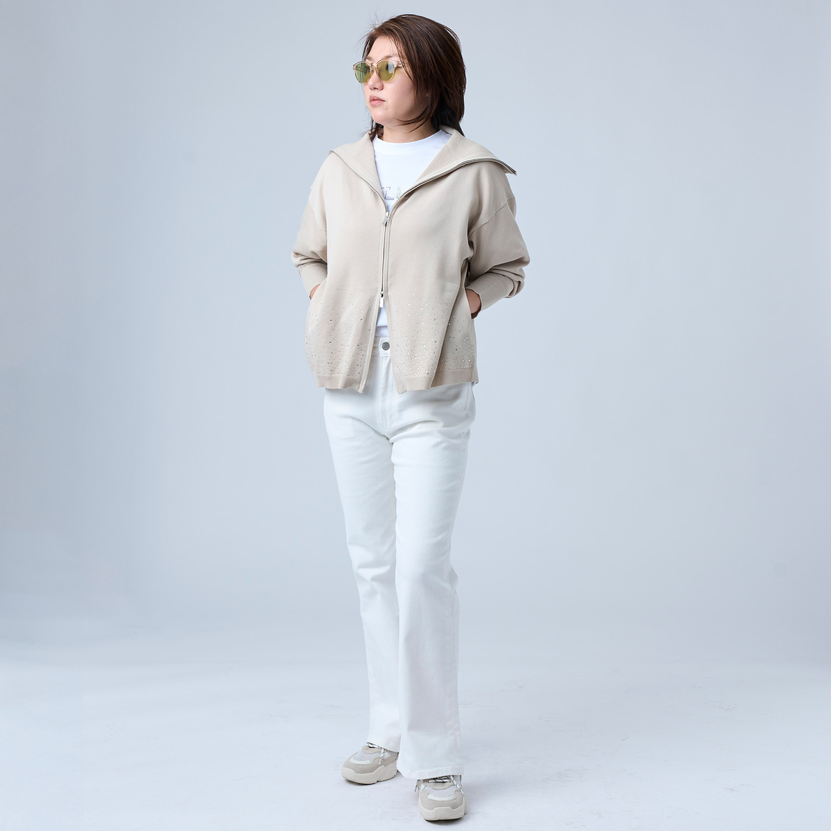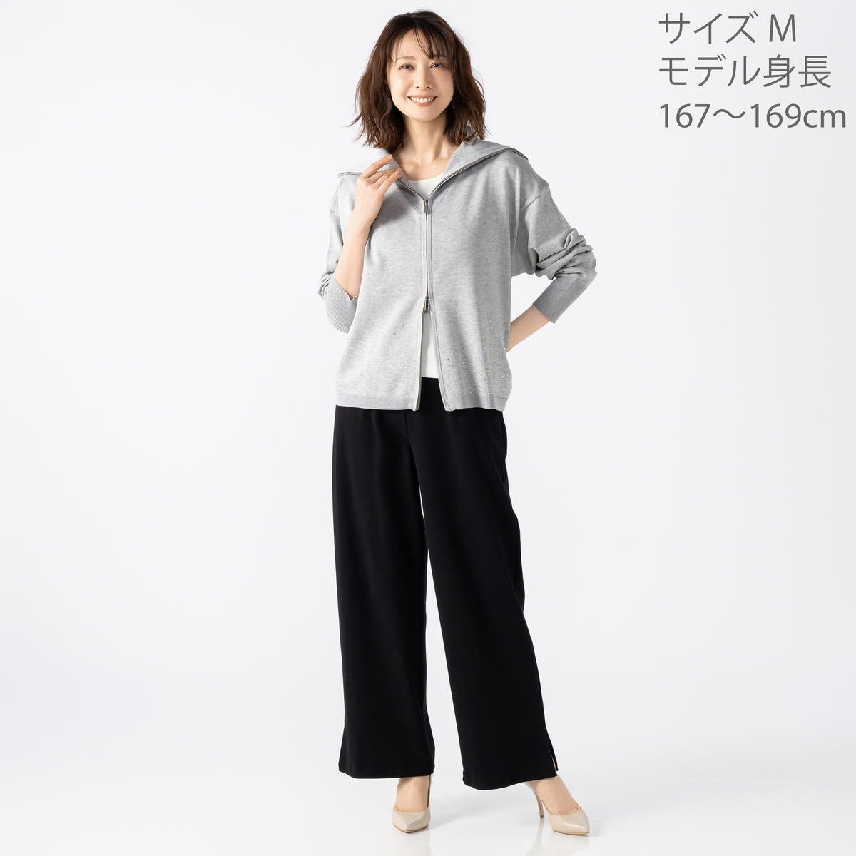 前身頃にラインストーンをグラデーションであしらったカーディガン。大きな襟はファスナーで表情を変えられ、着こなしに幅が出ます。袖のリブで長さを調整しやすく、軽やかにまとえるデザインです