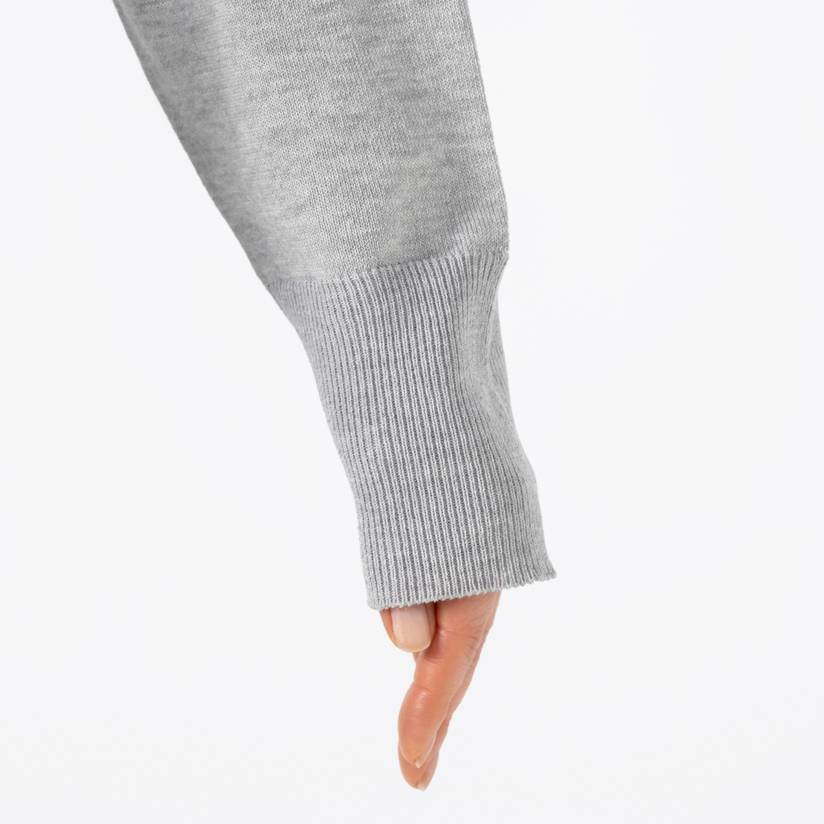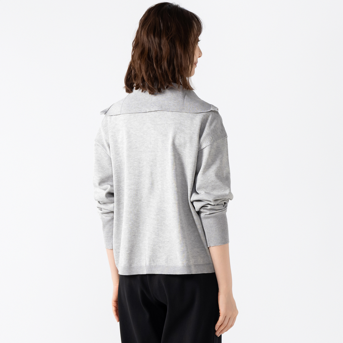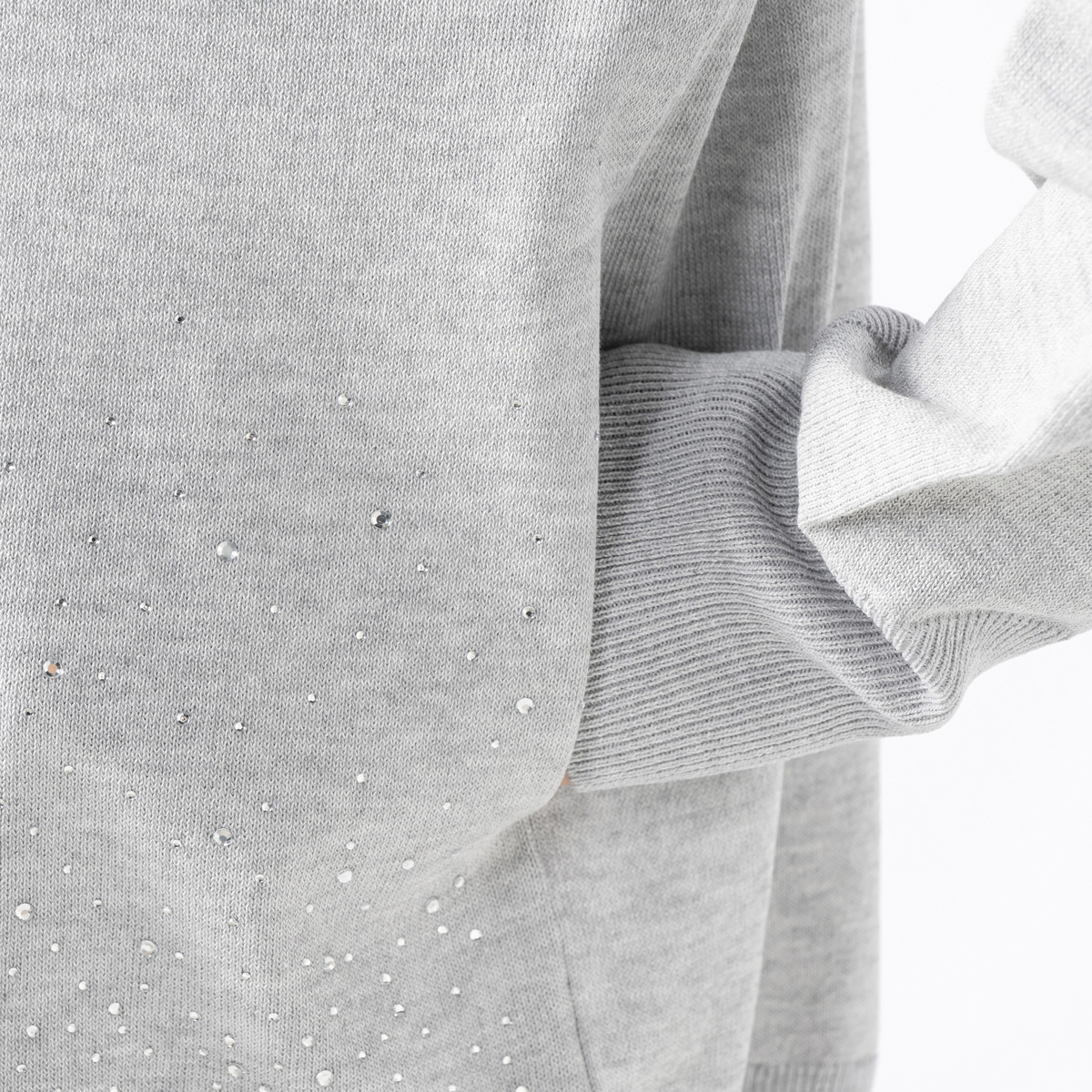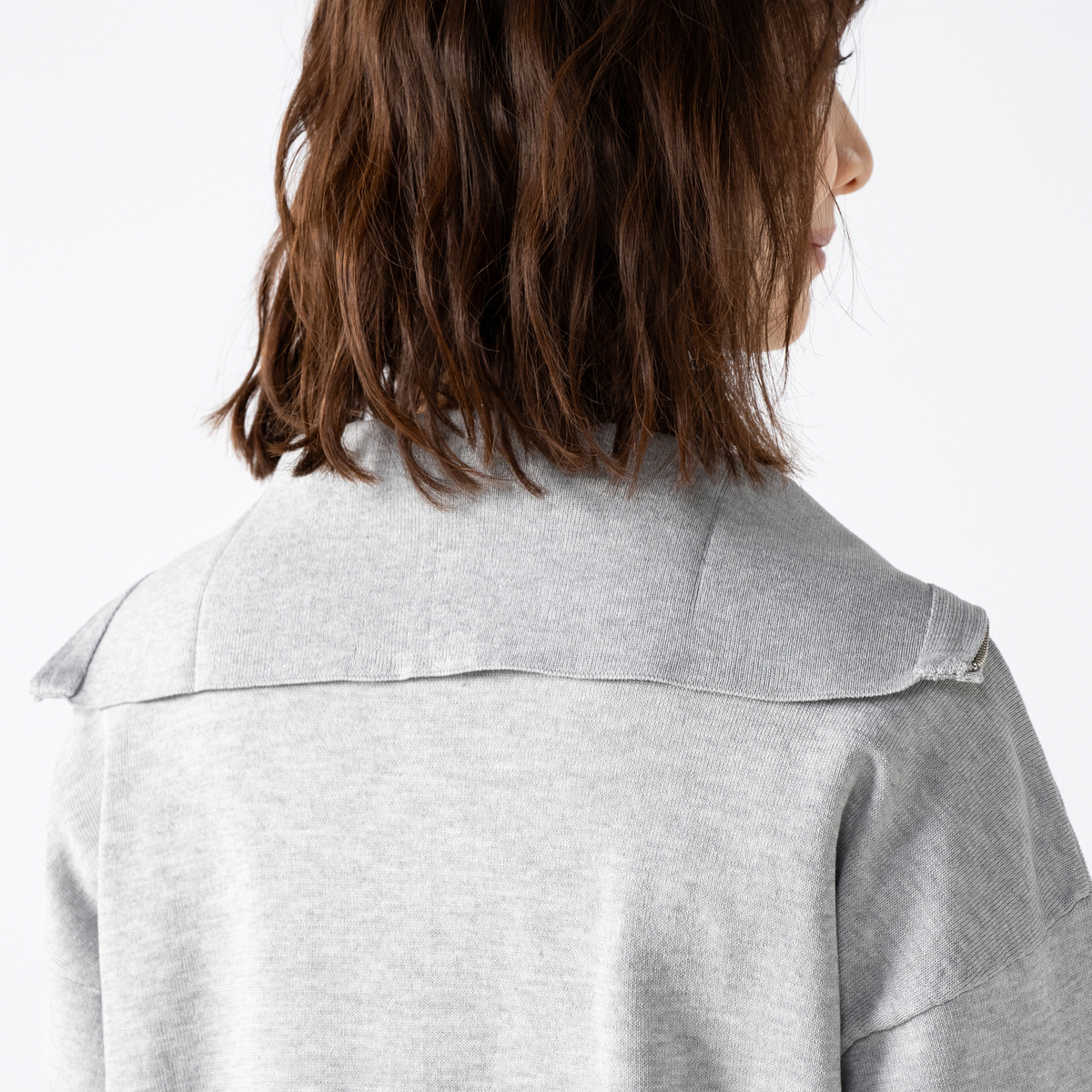 前身頃にラインストーンをグラデーションであしらったカーディガン。大きな襟はファスナーで表情を変えられ、着こなしに幅が出ます。袖のリブで長さを調整しやすく、軽やかにまとえるデザインです