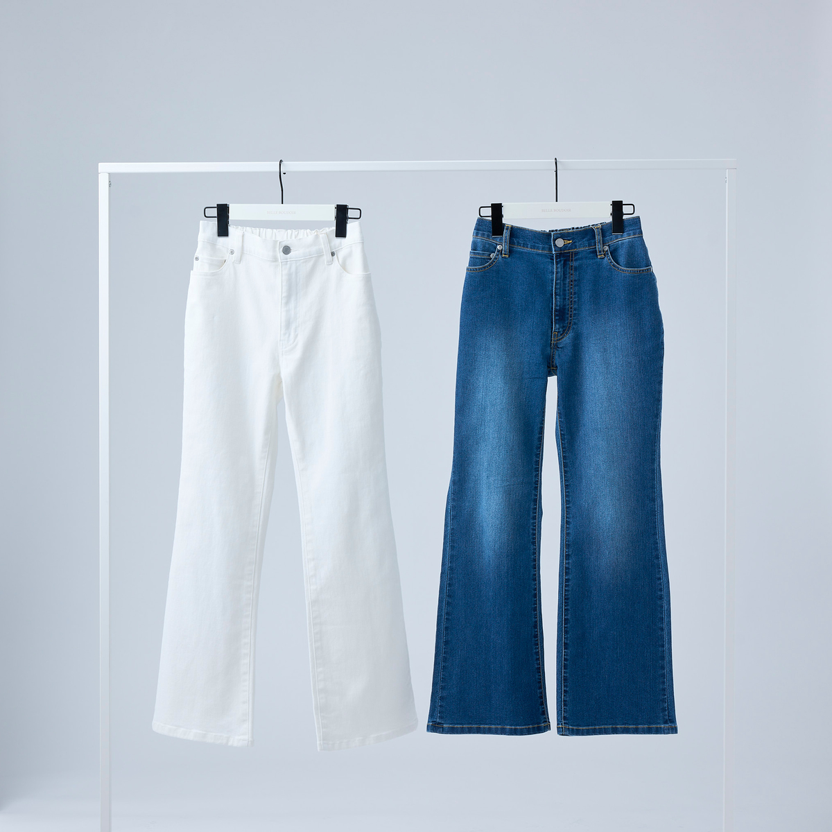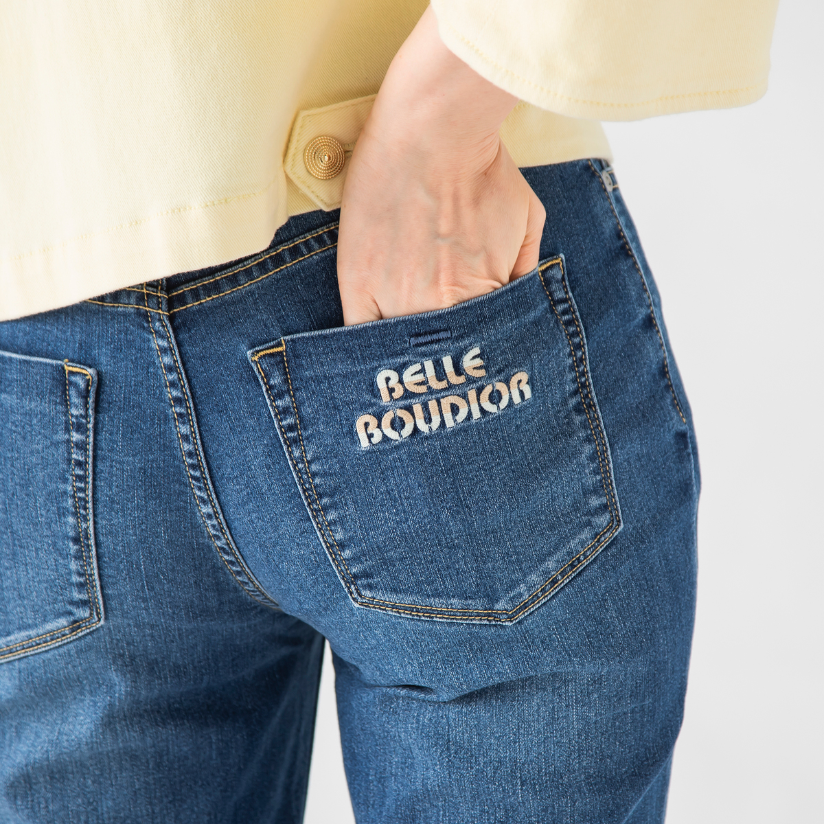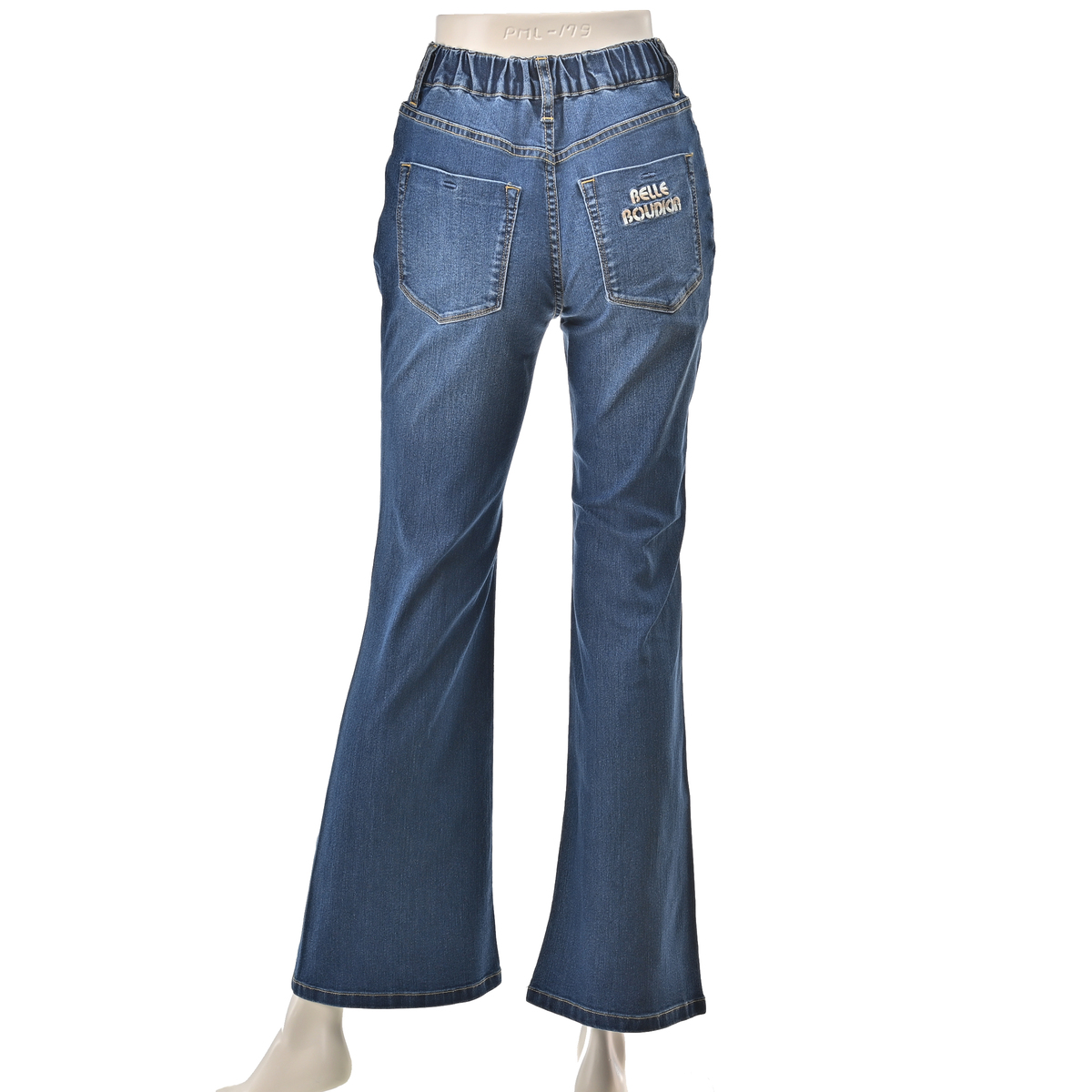 ストレッチデニムを使ったストレートセミフレアパンツ。ポケットにはBELLE BOUDOIRの刺繍を施し、さりげないアクセントにしています。インディゴは細見えを意識し、あたり加工を控えめに仕上げました