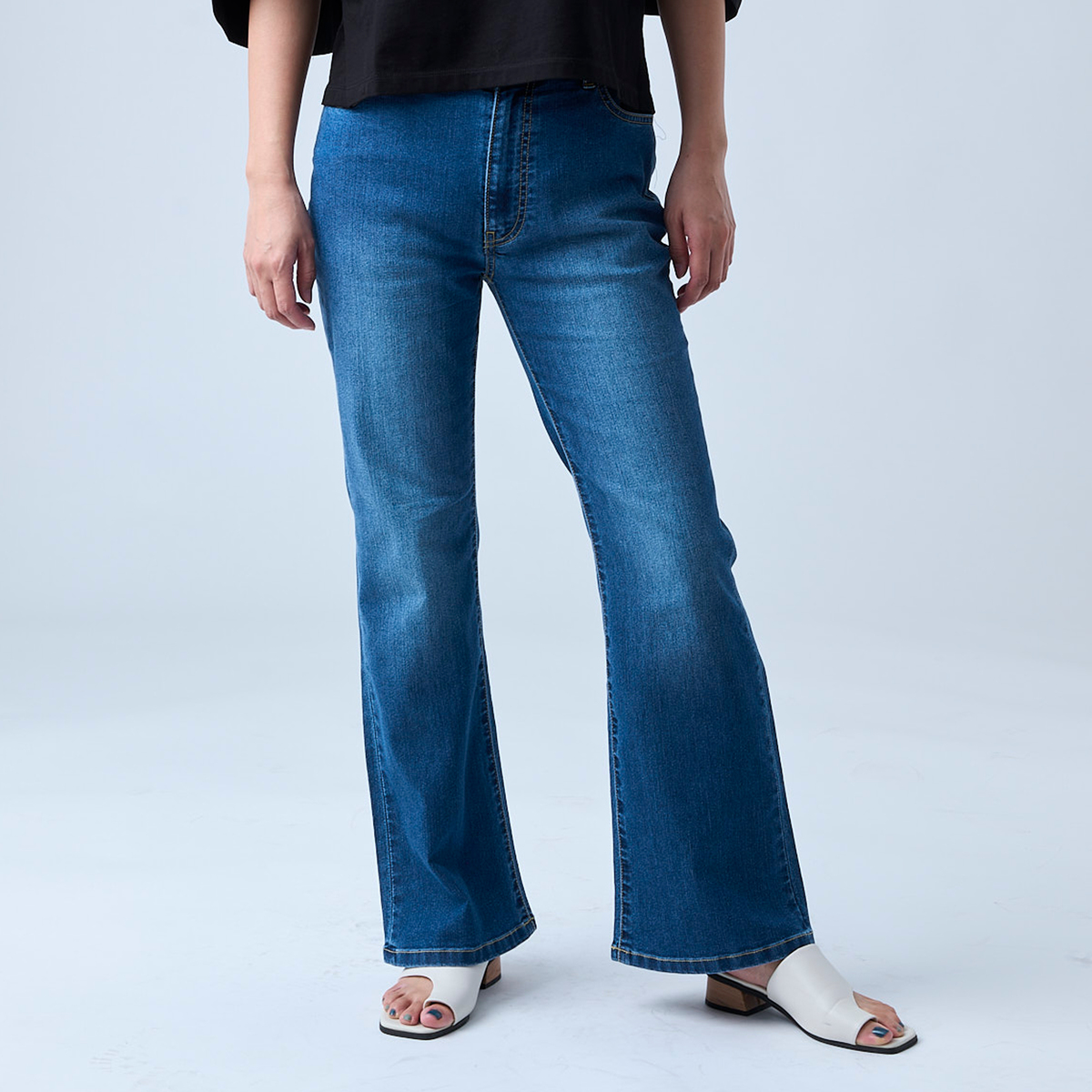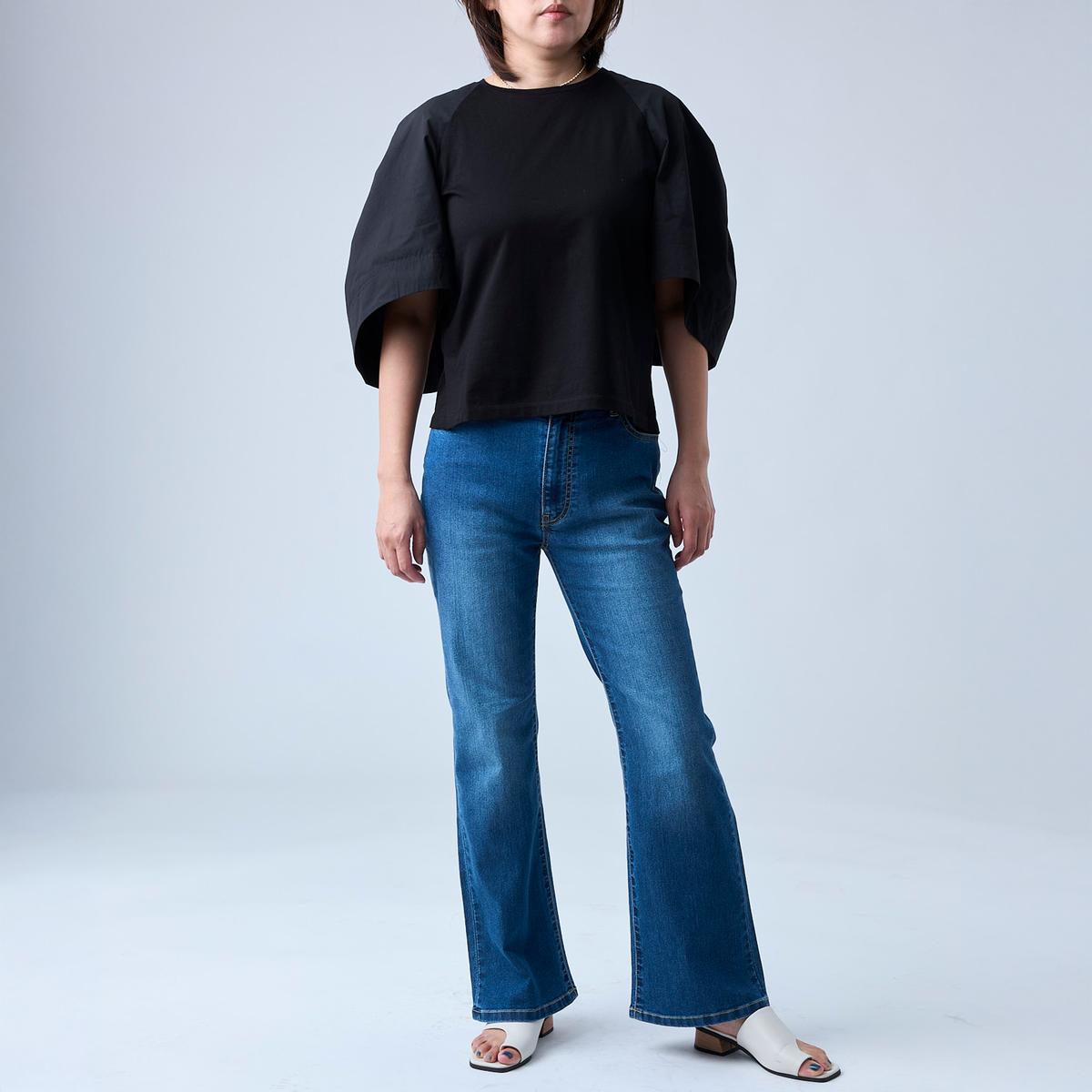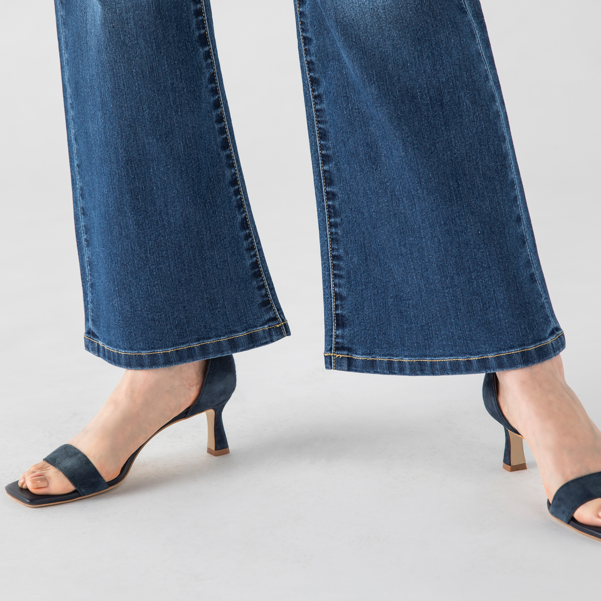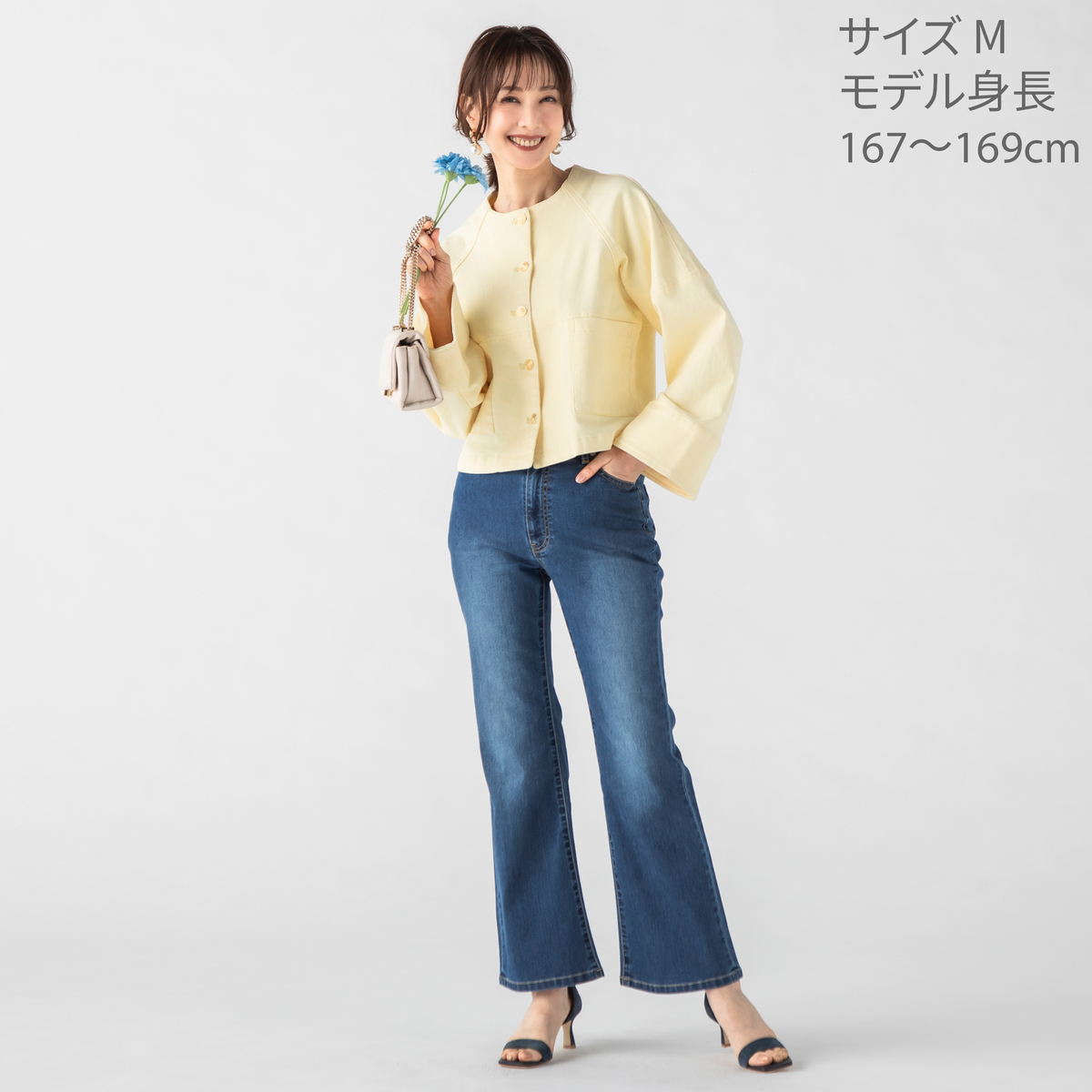 ストレッチデニムを使ったストレートセミフレアパンツ。ポケットにはBELLE BOUDOIRの刺繍を施し、さりげないアクセントにしています。インディゴは細見えを意識し、あたり加工を控えめに仕上げました